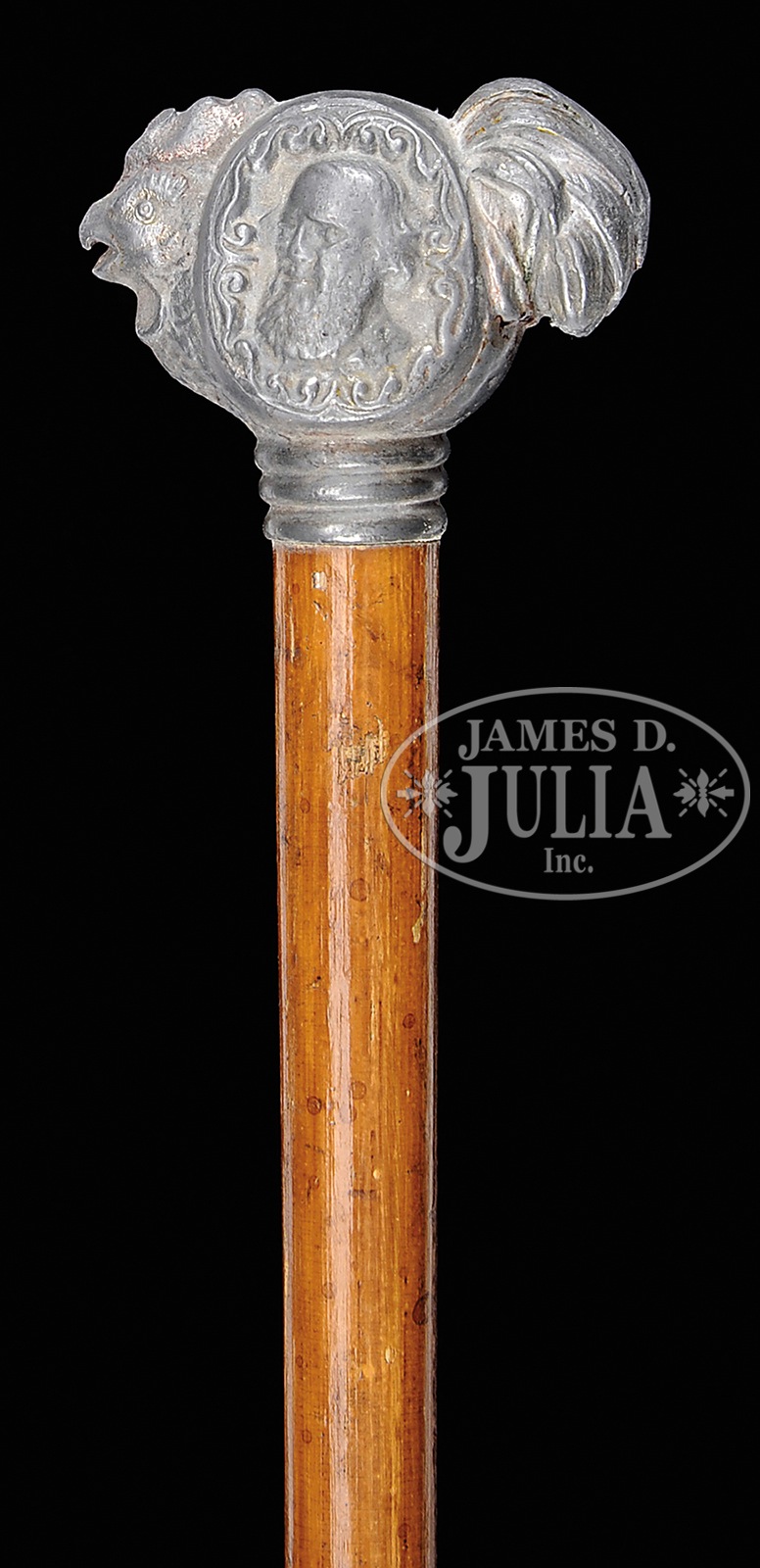LARGE GROUP OF POLITICAL PINS AND MEMORABILIA.1) Grover Cleveland “ROOSTER CANE” 35″ overall. Rooster is silvered pewter. 2) framed 15-1/2″ x 3″ embroidered felt pennant “REPEAL & ROOSEVELT”. 3) 2 small frames of 9 political pins depicting Teddy Roosevelt, McKinley and Taft. 4) an additional stickpin celluloid of Teddy Roosevelt and a rare 1-1/4″ celluloid jugate of 1904 Democratic Presidential candidate of Alton Parker and his running mate Davis who are lost to history by losing to incumbent and popular Teddy Roosevelt. PROVENANCE: From the personal estate collection of John W. Armiger Jr. CONDITION: Overall good to very good. 49055-22 (2,000-3,000) – Lot 2209