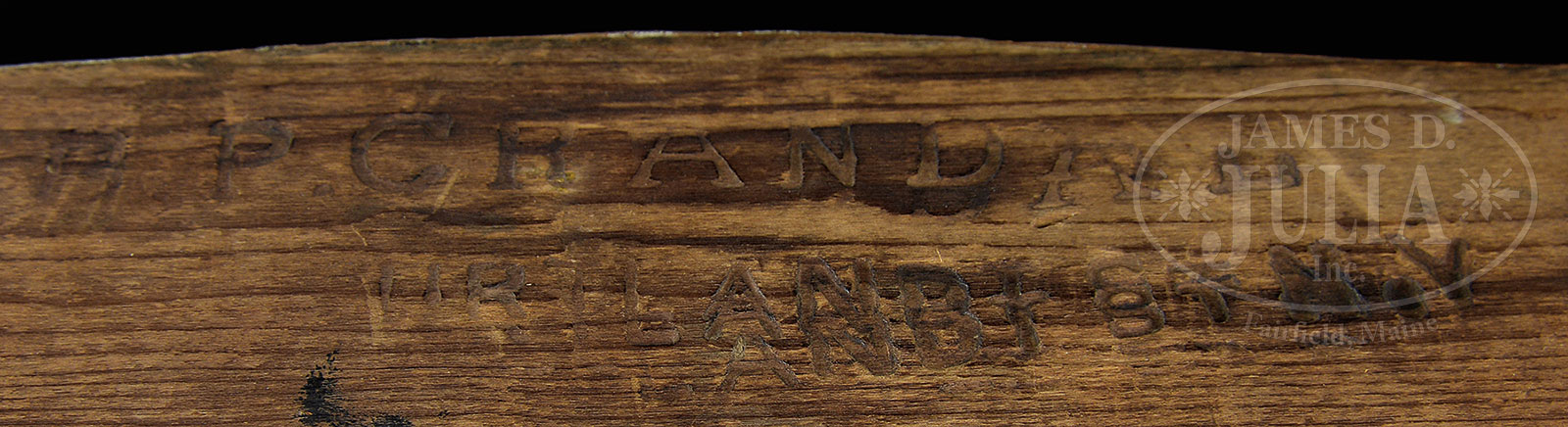 RARE PRIMITIVE CHILD’S ROCKING HORSE.Mid 19th century, H.P. Crandal, branded New York beneath the body of the horse. The horse with stylized head and snout with jeweled eyes. The carved saddle cut and joined to the body. The horse raised on four splayed rectangular legs joined to two elongated rockers, a pine platform affixed to center. The horse sponge decorated in green and black. The platform and runners in red over original green. The horses tail of black horsehair. SIZE: 21-3/4″ h x 44-1/2″ l x 11″ 2. CONDITION: Extensive in-use wear with expected soiling and abrasions. Losses to rear of saddle. Jeweled eyes original. Leather ears absent. Fair to good overall. 52236-4 (1,200-1,500) – Lot 2209