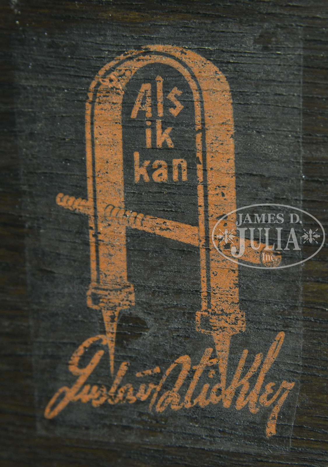 GUSTAV STICKLEY DOUBLE DOOR OAK BOOKCASE.Circa 1904, New York. Stamped with Gustav Stickley red mark at rear of gallery, identified as model No. 717, a rectangular case with 3/4 gallery mounted with a pair of 8 pane doors opening to interior of 3 fixed shelves with center partition. With original copper door handles. SIZE: 56″ h. x 48-1/2″ w. x 13″ d. CONDITION: Structurally very good, with some unevenness to surface which appears original although cleaned, good overall. 9-96781 (4,000-6,000) – Lot 2210
