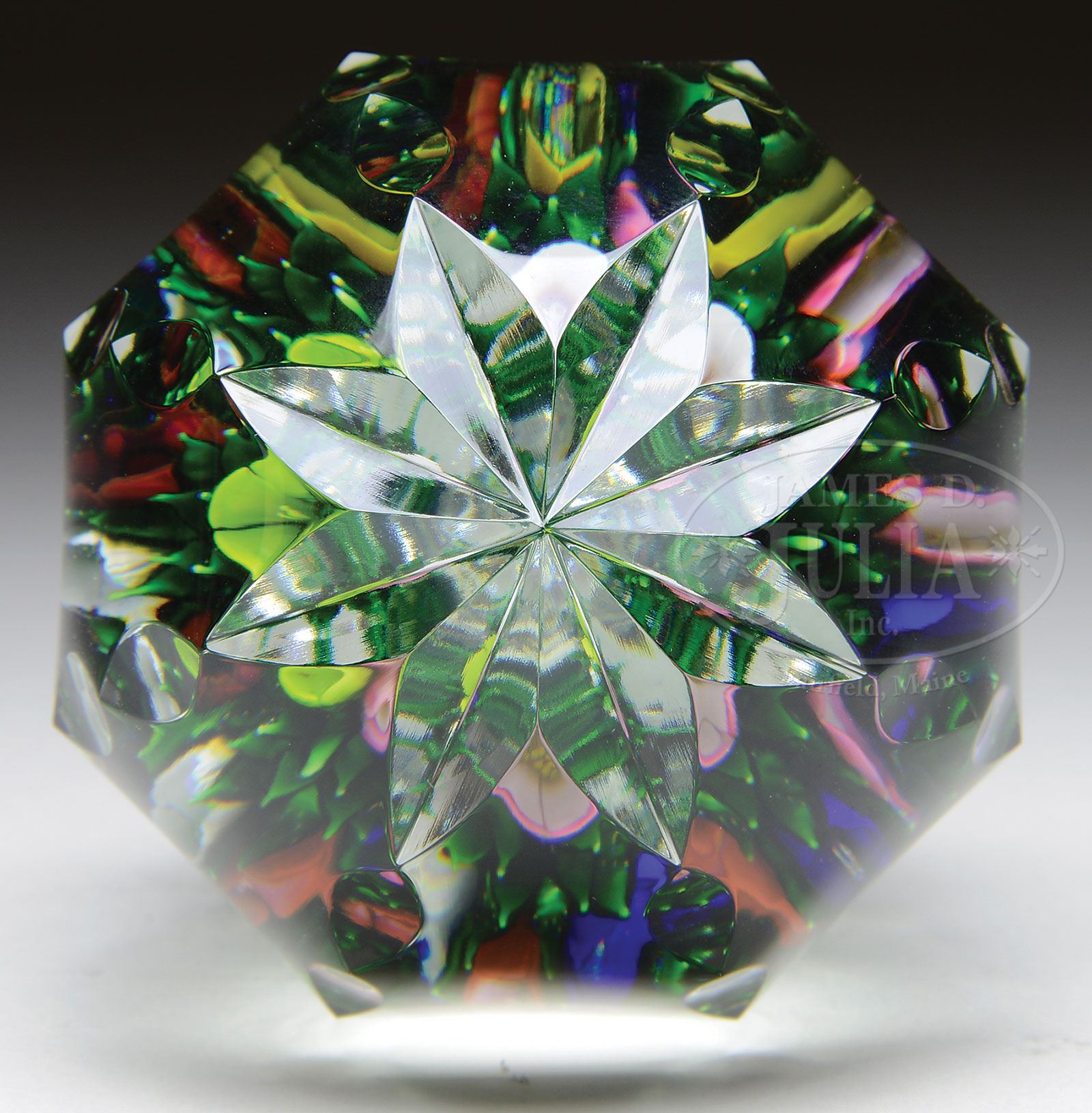 ST. LOUIS 1995 MAGNUM UPRIGHT BOUQUET PAPERWEIGHT.Modern St. Louis, French paperweight with overall fancy faceting. Upright bouquet consists of pink, yellow, white, green and cobalt flowers and green leaves. Signed on underside in script “St. Louis 1995” and “7/10”. Comes with original fitted box. SIZE: 4-1/2″ t. CONDITION: Very good to excellent. 5-69531 (800-1,200) – Lot 2212