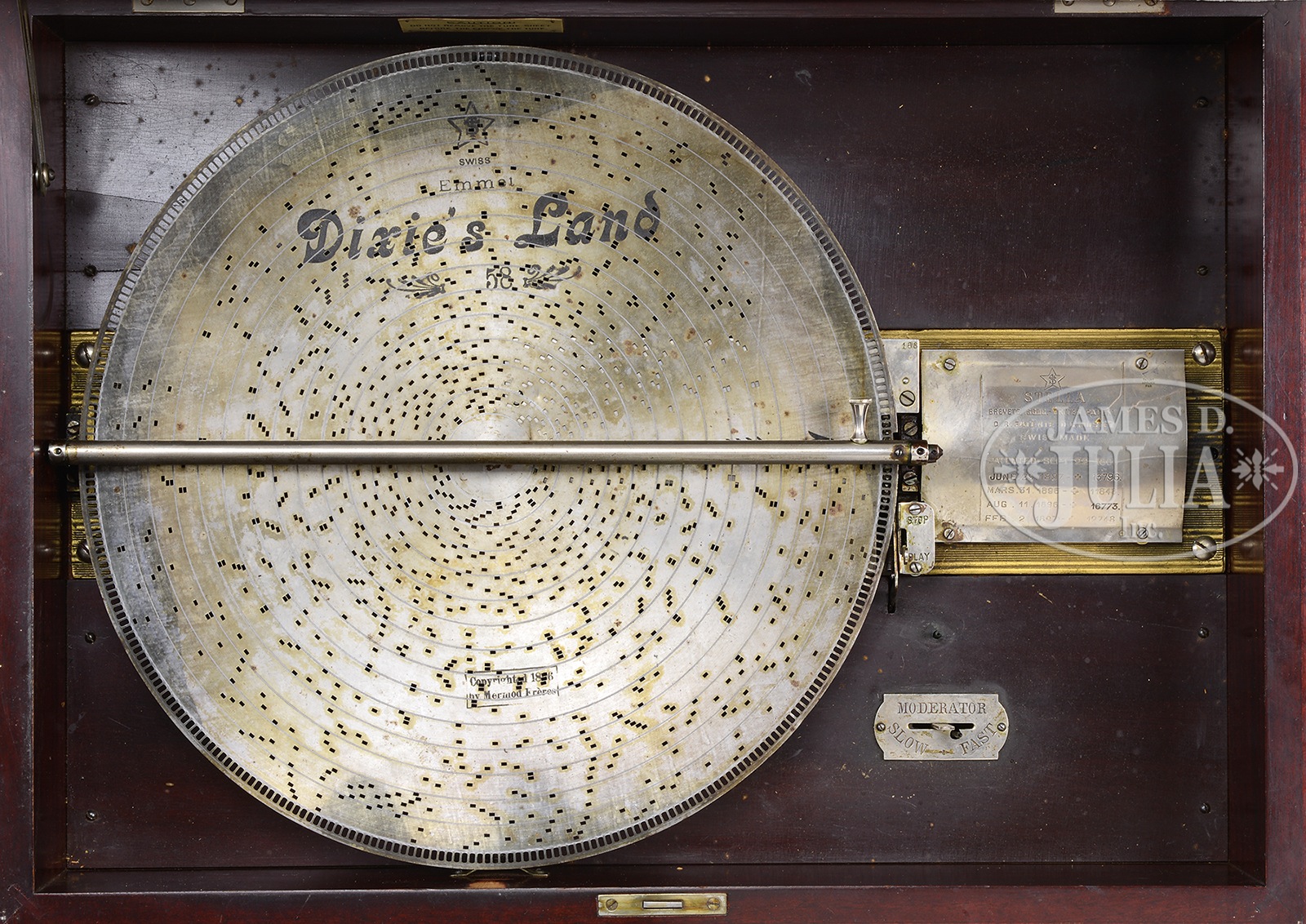 MAHOGANY CASE STELLA MUSIC BOX WITH 17″ DISCS.Late 19th century. Switzerland. Music box housed in a fine mahogany case with carved oak leaf and scroll carving within molded frame, the step molded base with inset drawer for holding additional discs. This box comes with a total of 17 discs, including “Dixieland”, “Hands Across The Sea March”, “In The Good Old Summertime”, “Annie Laurie”, and “The Rose of Killarny”. Stella music boxes were manufactured by Memod Freres in Switzerland and marketed in the US by Jacot Music Box Co., New York. The Stella was a music box that used discs without projections, and offered the highest quality tone. SIZE: Discs 17″ dia. Case 21″ x 28″ x 13-1/2″ t. CONDITION: Case very good, discs clean, movement works but spring stop cam disengaged. 9-96688 (2,000-2,500) – Lot 2212