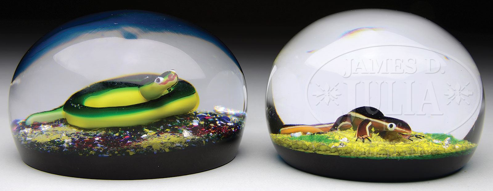TWO BACCARAT MODERN REPTILE PAPERWEIGHTS.1) Coiled green snake on a multicolored rock ground. Signed within the piece “B1972”. Signed on the underside “36 1962” with Baccarat acid etched signature. 2) Amber salamander on a yellow and green rock ground. Signed within the piece “B1973” in cane and on the underside “1973 140″ with the Baccarat acid etched signature. SIZE: 3-1/4″ dia and 3” dia respectively. CONDITION: Very good to excellent. 5-69534 (800-1,000) – Lot 2213
