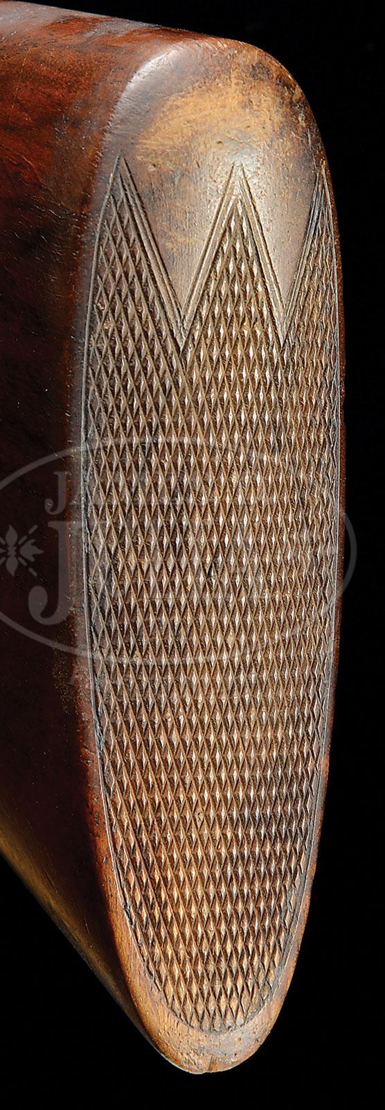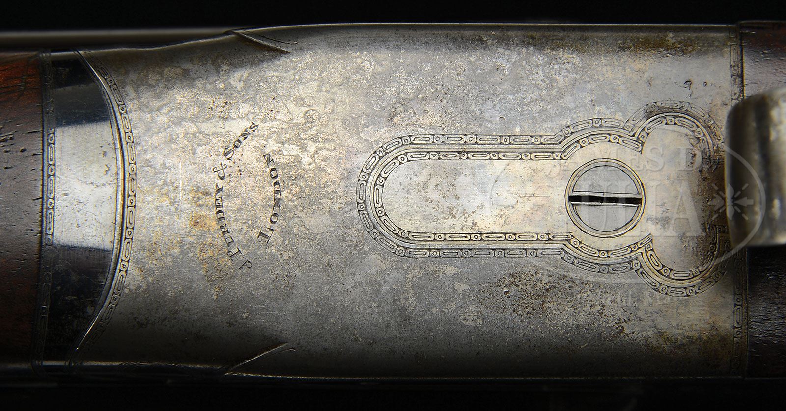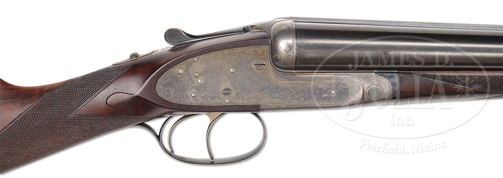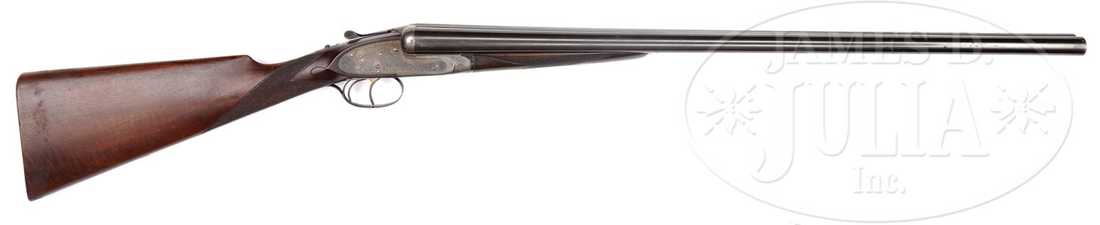 *JAMES PURDEY BEST QUALITY PLAIN FINISH ROUND BODY GAME GUN WITH CASE.SN 21154. (ca 1914) Cal. 12 ga. 2-1.2″ Chambers. 28″ Chopper lump bbls with narrow, matted game rib, are engraved “J. Purdey & Sons, Audley House, South Audley Street, London.” and “Made of Sir Joseph Whitworth’s Fluid-Pressed Steel” on tops. Bbl flats are stamped with London nitro proofs for 2-1/2″ chambers, bottoms of bbls are stamped with SN. Bottom of left bbl is stamped with bbl makers initials “CA” (long time Purdey head barrel maker C Aston). Tube nos. “48527” and “48528” are on loop. Beesley patent self-opening sidelock action has rounded bar, and features automatic safety (SAFE inlaid in gold), bushed strikers, raised rib tumbler end cocking indicators, and double triggers. Action has only geometric engraving around outer edges and join between lockplates and action and around trigger plate. “J. Purdey & Sons” is on each lockplate, and on bottom of action along with “London”. Lightly fiddle figured and somewhat marbled European walnut straight grip buttstock measures 14-3/8″ over checkered wood butt, and features drop points, point pattern checkering with mullered borders, and gold initial “C” inlet on toe line. Matching splinter ejector forend has Anson release and actioners initials, “T.A” (unknown) on iron. Bore diameter: left-.732, right -.733. Bore restrictions: left -.007 (IC), right -.007 (IC). Wall thickness: left -.033, right -.031. Drop at heel: 2-3/16″, drop at comb: 1-5/16″. Weight: 6 lbs. 11 oz. LOP: 14-3/8″. Leather case with brass corners has rectangular leather label embossed “F. S. C. NY” on top, along with a number of scattered railway shipping labels. Interior is lined in an orange colored cloth with gold embossed lavender leather Schoeverling. Daly & Gales label. CONDITION: Very fine, as found. Bbls retain 85 – 90% orig blue, thinning at muzzles, on tops, and on sides, with four or five small patches of light oxidation. Action and lockplates retain a considerable amount of their orig case hardening color, but are mostly a mottled silver gray. Top lever, forend iron, and trigger guard retain a considerable amount of their orig bright blue, top lever and iron perhaps 70%. Stocks retain most of their orig oil finish with grain raised and a number of light handling marks and scratches. Checkering is slightly worn. Buttstock appears to be an old replacement (drop points are not quite right and checkering does not match forend. Another explanation is that WWI was just beginning and experienced workmen were being taken for the war effort). Case leather is dark, dry, crazed, and rubbed. Straps and handle are missing. Shipping labels are foxed. Interior cloth has considerable insect damage, mildew, and a number of rubs from contact with guns. Label is excellent, with just a spot or two of mildew, which should clean. 4-49585 MGM36 (12,000-17,000) – Lot 2213