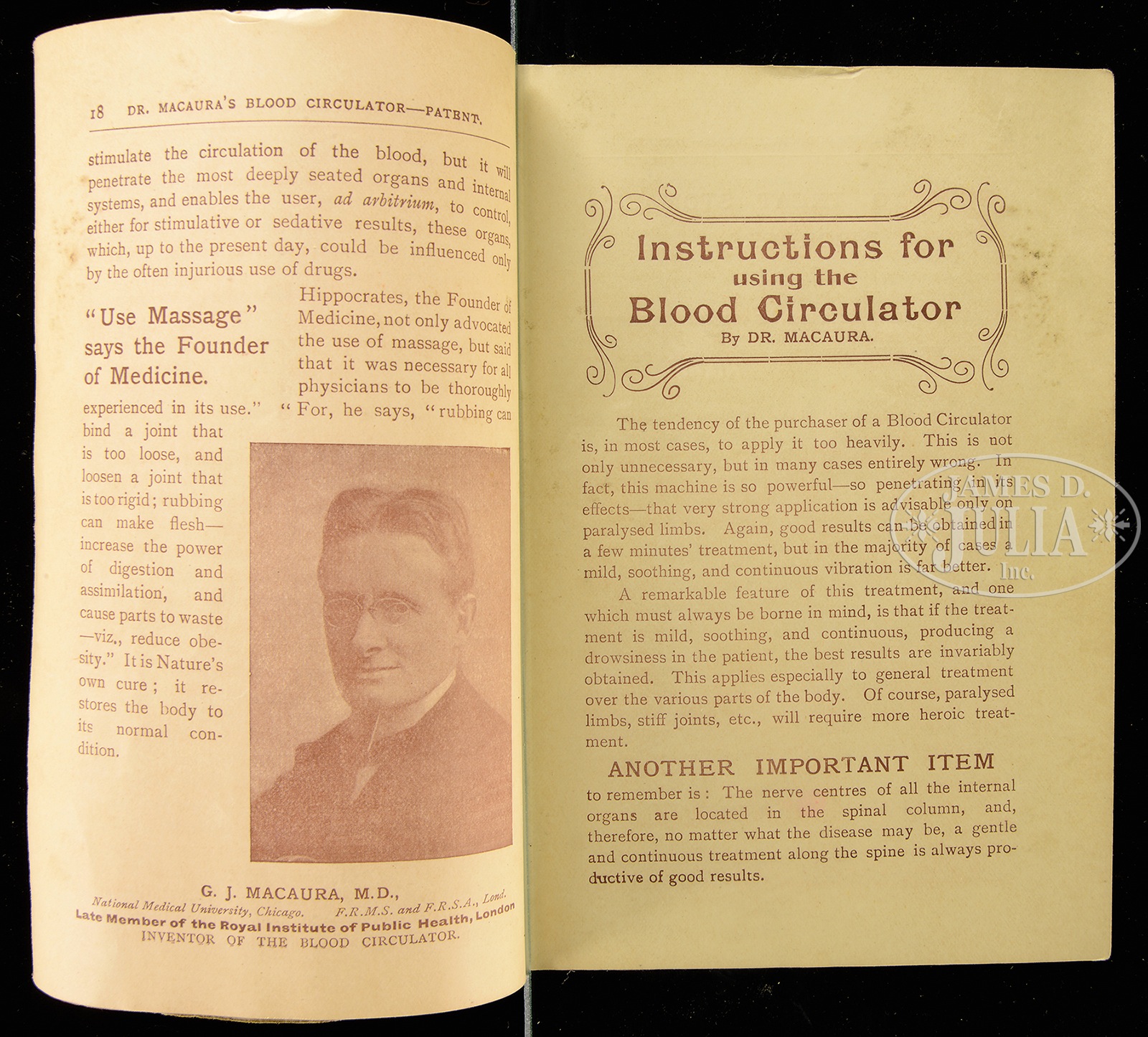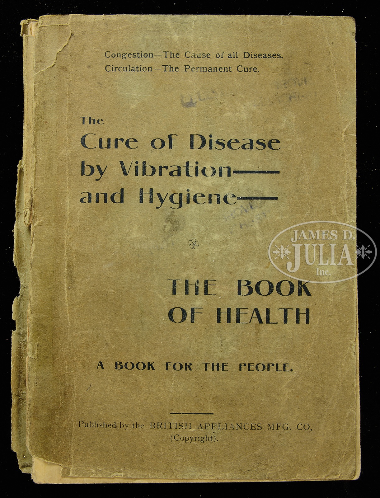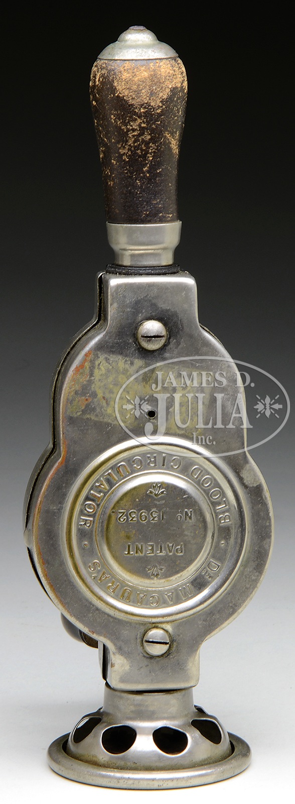 DR MACAURA’S BLOOD CIRCULATOR W/ OB.One of the more peculiar items you’ll see today. This quack device from around the turn of the last century was a hand crank apparatus claimed to have improved one’s circulation when in actuality it did no such thing. The pulsing vibrations it produced did nothing more than give the user a curious sensation. It most certainly served other functions. Even the accompanying instruction literature reads like a veiled romance novel. Its nickel plated housing is also complete a wooden handle and crank. Research shows that the base would have had a rubber covering, which has long since gone absent. Contained within an original box and accompanied by a 56-page booklet describing its intended use and benefits. SIZE: 11-1/4” l. CONDITION: Some wear to nickel surface and wooden handle. Box and booklet are generally good with scattered tears and general wear. 45286-10 (300-600) – Lot 2213 Auction: Advertising, Toy & Doll - Spring 2015 Please Note: All prices include the hammer price plus the buyer’s premium, which is paid by the buyer as part of the purchase price. The prices noted here after the auction are considered unofficial and do not become official until after the 46th day. |