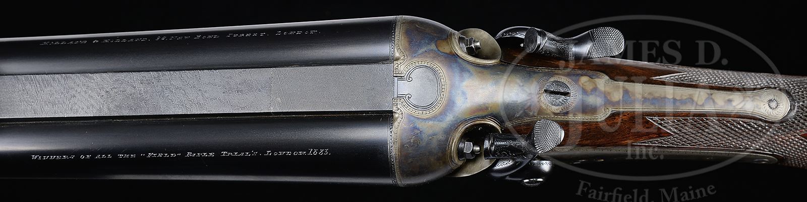 10 BORE HOLLAND & HOLLAND HAMMER DOUBLE RIFLE WITH CASE AND ACCESSORIES.SN 11145. (1892) Cal. 10 ga. (.785 Groove diameter. 9 Grooves, Enfield type rifling) 3-1/2″ Chambers. 27″ Dovetailed steel bbls have broad flat rib fitted with single standing platinum lined rear express sight, and longitudinally dovetailed front sight with silver and flip-up beads. Tops of bbls are engraved “Holland & Holland, 98 New Bond Street. London.” and “Winners of All the “Field” Rifle Trials. London. 1883.” Bbl flats are stamped with Birmingham black powder re-proofs for 3-1/4″ chambers “103 grains black powder” and “1031 Grs Bullet”. Bottoms of bbls are stamped with SNs. A sling eye is soldered to bottom rib. Case hardened, round bodied, Jones underlever action is fitted with peninsula back action locks with rebounding, low profile, serpentine hammers with stylized dolphin heads. Action and lockplates are engraved with small scroll borders. “Holland & Holland” is on each plate. SN is on trigger guard tang, which extends to steel grip cap. Nicely streaked and lightly figured European walnut full pistol grip buttstock measures 14-1/2″ over a Silver type pad and features right hand shadow line cheekpiece, point pattern checkering at grip, as well as a sling eye and vacant silver oval on toe line. Matching splinter forend is nearly fully checkered and has forward pivoting lever release. Drop at heel: approx 2-1/16″, drop at comb: approx 1-5/8″. Weight: 11 lbs 8 oz. Fine quality oak and leather case has brass corners and round central medallion on the lid. Interior is lined in dark red velvet and has correct period reproduction paper label in lid. Case is nicely fitted for an array of orig accessories including: large brass side pour bullet mold (.775 diameter bullet with shallow hollow base) stamped with SN and “J.G”, three ebony handled turnscrews, 2-pc brass and ebony cleaning rod, pair of 10 ga brass snap caps, bone striker bottle, pewter topped glass square oil bottle, and two brass oil bottles with SN stamped on tops, with other cleaning and loading bits. PROVENANCE: Transcription of a letter from Holland & Holland dated Mar 3, 1999 with particulars of gun, and a copy of the record book showing that the rifle was made for a Mr. Lethbridge. Prior owners notes. CONDITION: Excellent, as completely refinished. Bbls retain nearly all of a fine satin re-black. Action retains nearly all of a re-color hardening which is somewhat dark. Hammers, underlever, trigger guard and grip cap have been re-blued, and retain nearly all of that blue. Stocks retain nearly all of a hand rubbed oil finish over some light marks, and with a few subsequent marks. Checkering is re-cut. There are one or two small chips in front of forend iron. Bores are very fine with strong rifling throughout, with some scattered light pitting. Action is tight. Bbls are on face. Locks are crisp. Case leather is fine with some marks and rubs. Straps and handle are good. Interior is excellent. Accessories are very fine. Brass is somewhat tarnished. Letter of provenance relates that after its last trip to Africa, at which time it took two cape buffalo, this rifle was returned to Holland & Holland to be redone. It has not been taken on a hunt since that time. 49183-2 MGM135 (10,000-15,000) – Lot 2213 Click here to view provenance