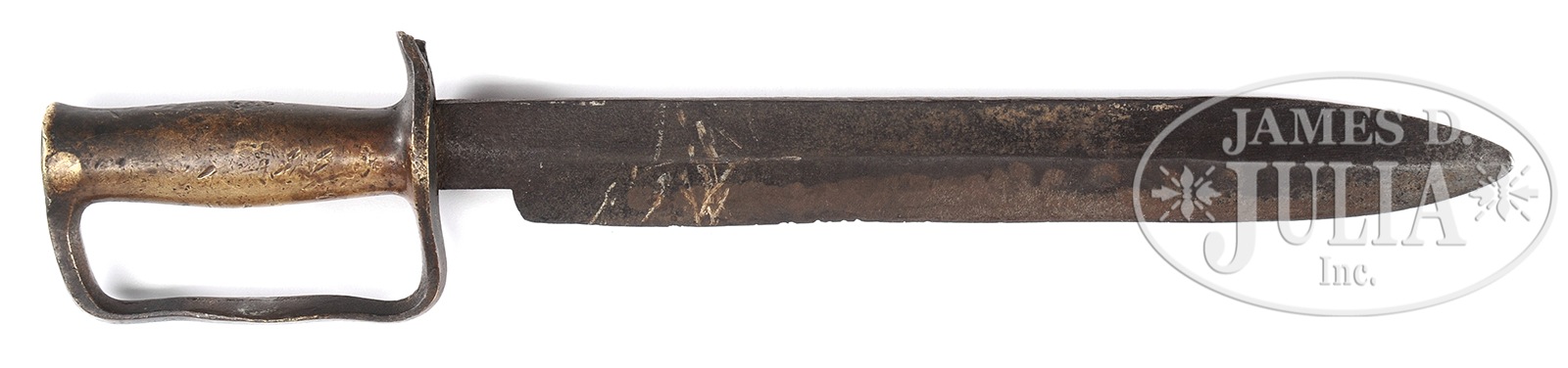 RARE BRASS D-GUARD BOWIE MADE BY NASHVILLE PLOW WORKS.This rarely offered 16-1/4″ knife with heavy 12″ blade, over .3″ thick at ricasso, 3″ sharpened false edge are thought to have been made by the firm of Sharp & Hamilton who operated the Nashville Plow Works. These well known knives rarely come to market and only a handful are known. There is a chapter dedicated in Confederate Bowie Knives by Melton, Phillips & Sexton on brass handled Nashville Plow Works swords. PROVENANCE: Ex-Steve Mullinax Collection; Ex-Tommy Knox Collection; Wayne McNeese Collection. CONDITION: Blade is overall brown with iron patina and pitting and old sharpening. Brass hilt has quillon broken and only 1″ is retained, numerous small dents and blemishes with dark mixed patina, ranging from mustard to chocolate colors. Blade wiggles slightly from loose peening. 50427-8 JS (4,000-6,000) – Lot 2213 Click here to view provenance