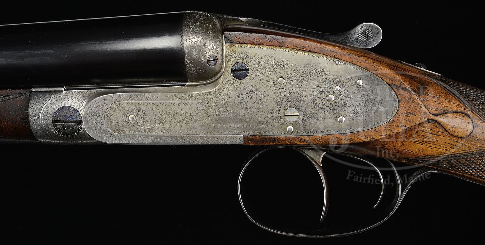 *JAMES PURDEY HAMMERLESS EJECTOR SIDELOCK GAME GUN.SN 19711. (1909) Cal. 12 ga. 2-3/4″ Chambers. 28″ Chopper lump bbls are marked with Purdey’s Audley House address and Whitworth steel information on narrow, concave game rib. Bbl flats are stamped with London nitro proofs for 1-1/8 oz of shot. Tube nos “39426” and “39427” are on loop, and bottom of left bbl is stamped with bbl makers initials “SS” (Sam Simons). Beesley patent, sidelock, self-opening action features automatic safety (SAFE inlaid in gold), raised rib tumbler end cocking indicators, and double triggers. Action and lockplates are engraved with Purdey house style rose and scroll. “J. Purdey & Sons.” is engraved on each lockplate and on bottom of action over “London”. Scroll engraved and blued trigger guard has SN on tang, which extends to hard rubber grip cap. Well marbled and lightly fiddle figured European walnut semi-pistol grip buttstock measures 15-1/8″ over Silver type pad, and features drop points, point pattern checkering with mullered borders at grip, and a silver oval on toe line engraved “SPS”. Matching splinter ejector forend with Anson release, is stamped with initials “A.F” (famed Purdey actioner Alf Fullalove). Bore diameter: left -.735, right -.737. Bore restrictions: left -.042 (Extra full), right -.011 (Lt. mod). Wall thickness: left -.026, right -.024. Drop at heel: 2-1/4″, drop at comb: 1-1/2″. (Stock is considerably cast off, approx 1/2″.) Weight: 6 lbs 11 oz. LOP: 15-1/8″. CONDITION: Good. Bbls retain most of an old re-blue, engraving considerably softened and thin. There are a number of deep marks and scratches on top rear of right bbl. Action and lockplates are silver gray to brown. Top lever and trigger guard retain most of an old bright blue with engraving softened. Correctly shaped replacement stock retains most of what appears to be its orig finish with a number of light marks and scratches, checkering considerably worn, especially on forend. Action is very slightly loose, but bbls are on face. Drop is good. Bores are very fine with slight pitting under polishing, mostly in right bbl. Ejectors are in time. 4-51223 (8,500-13,500) – Lot 2214