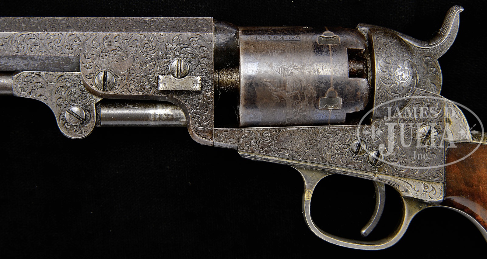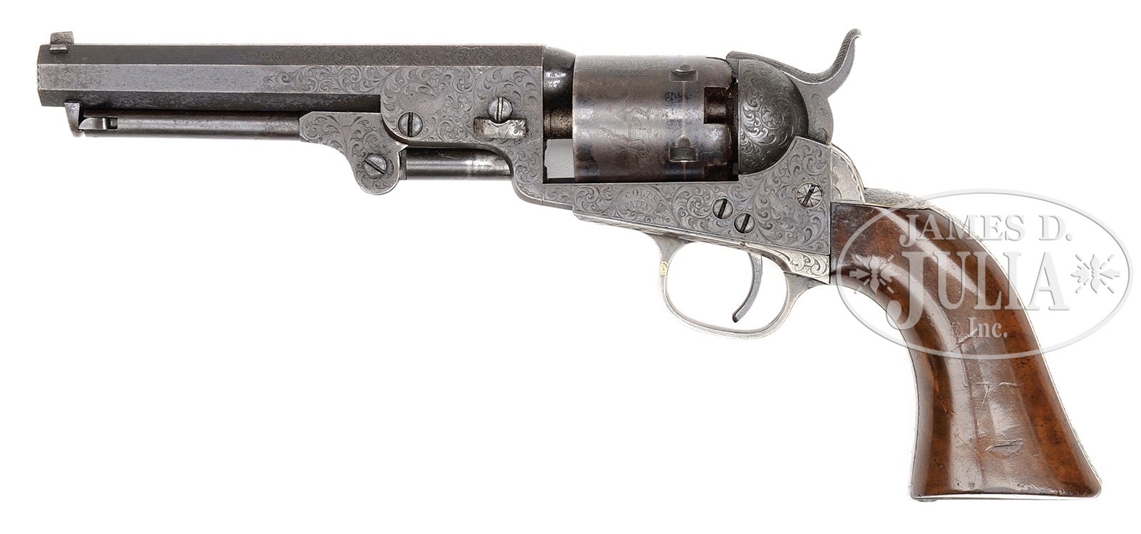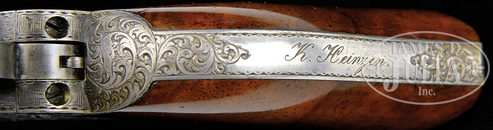 FINE ENGRAVED ENCASED COLT POCKET MODEL INSCRIBED TO “K. HEINZEN’.SN 124,506. This is a beautiful deluxe engraved 5″ Colt Pocket Model made in 1856. We are not positive who the inscription is to but a very prominent Karl Heinzen was a prominent American abolitionist and publisher of a German radical newspaper in Louisville, KY called “The Pioneer” at time of manufacture. Regardless who the recipient is of this gun, this is a lavishly engraved example with the typical German engraving style of Gustav Young and other Colt factory engravers with intricate foliate swirls terminating and animal heads of the highest quality and coverage found. Engraving on this gun exhibits three dog’s heads, one on left side of bbl housing, one on left side of frame, and the third on top of backstrap. This gun retains much of its orig finish and most all of its orig silver and varnish. The rolled cyl scene of a stagecoach robbery is vibrant and all discernible. The gun appears much better than the orig casing which contains orig brass Colt mold, flask, gun tool, and caps. CONDITION: Gun retains strong bright blue finish in protected areas including cyl with much of the balance turning plum. Metal surfaces exhibit light staining and fine pin prick pitting in some areas especially top of bbl flat near muzzle. Case colors are still visible on unengraved portions of frame. Stocks are of higher grade and burl retaining most all of their orig varnish though worn around edges of butt with small dings and dents. Backstrap and trigger guard, which are also finely engraved as can be seen in photographs, retain 95% plus orig silver plate. Accompanying casing is fairly sound and solid. The lid is warped and bottom has a longitudinal crack running full length. Compartment holding mold is broken and loose. Mold is in very good to fine condition with scattered dents where used as tack hammer. Eagle flask is not Colt marked, has no finish and one seam separation. L-shaped gun tool is very good with no finish. An old match safe has been utilized to hold caps and a green paper labeled brass cap tin is also present. Case lining is worn, frayed, and soiled. Locking mechanism in case is missing. 4-51020 JS20 (8,000-12,000) – Lot 2215
