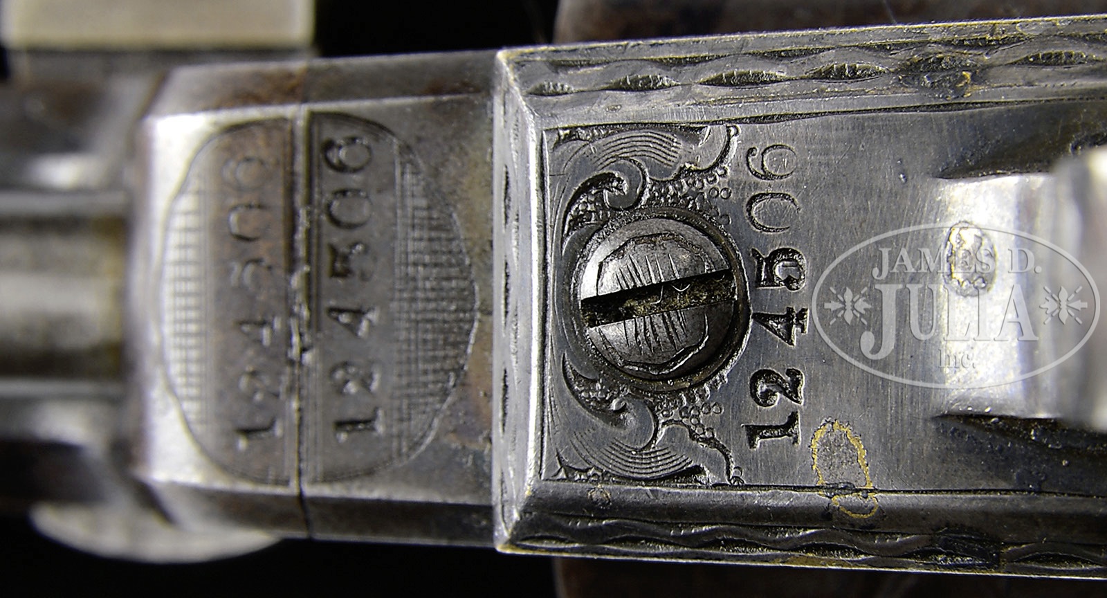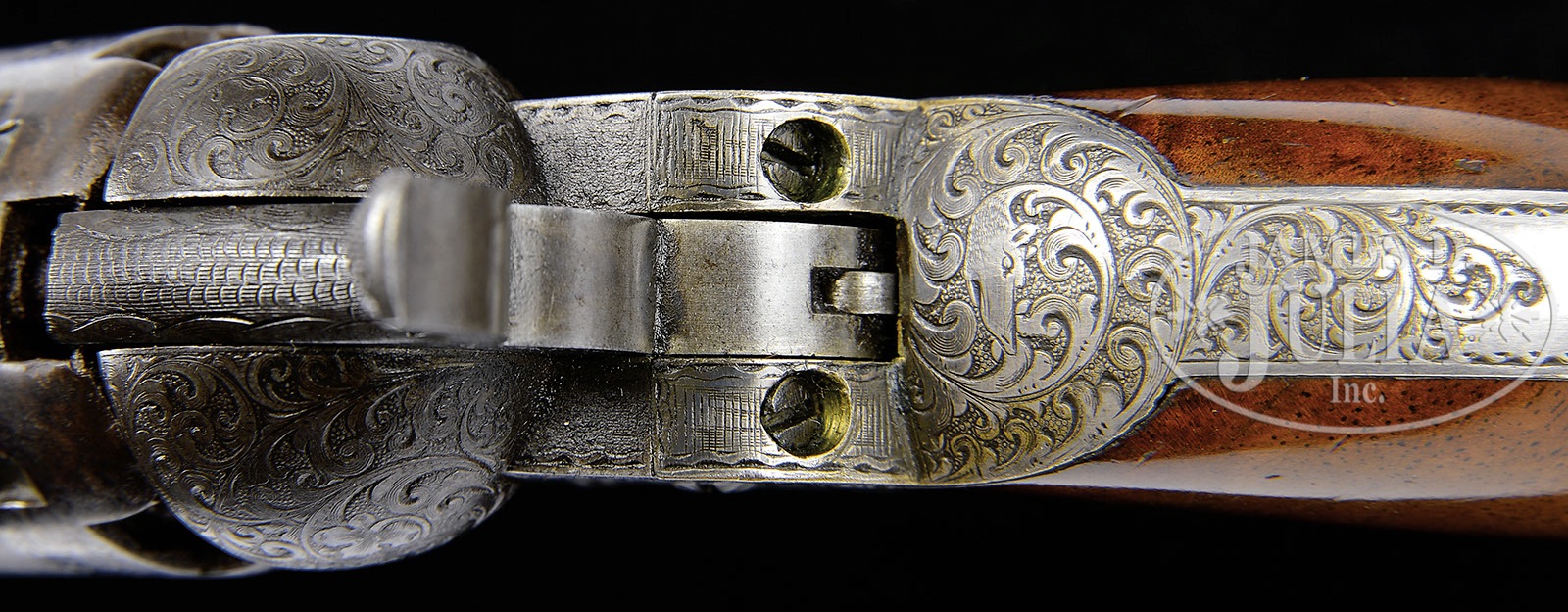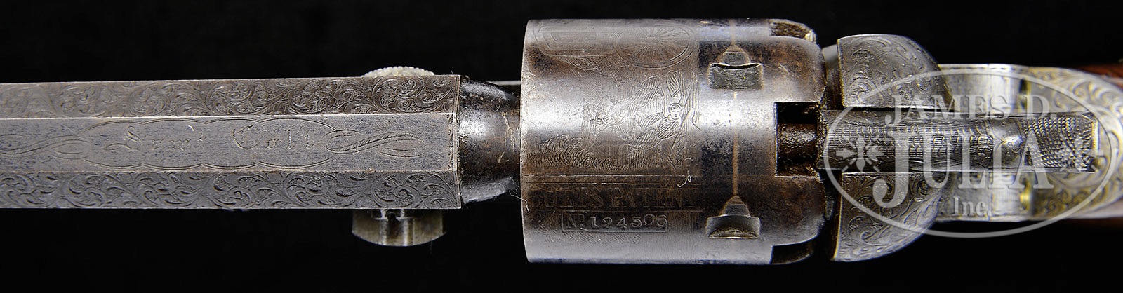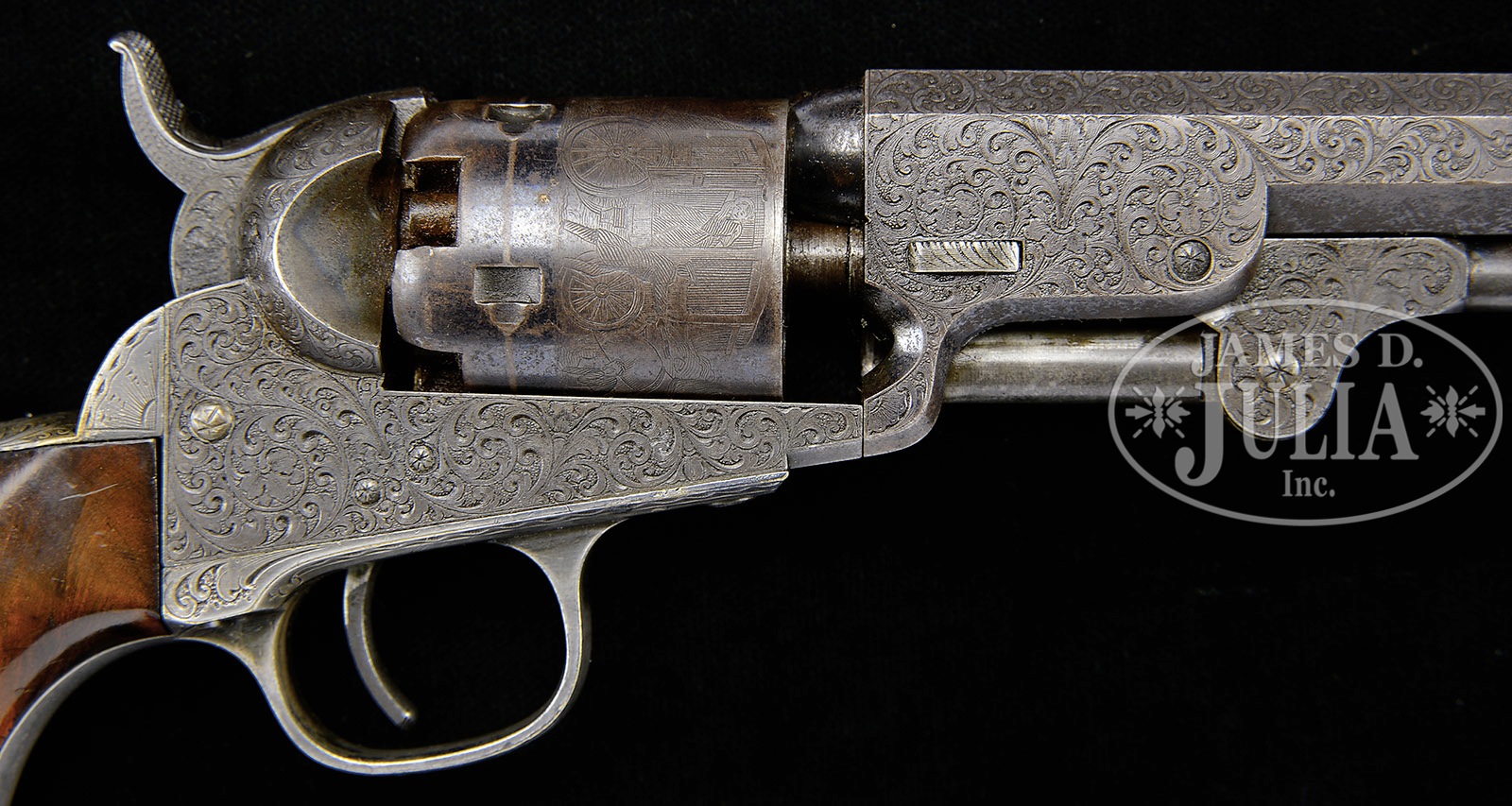 FINE ENGRAVED ENCASED COLT POCKET MODEL INSCRIBED TO “K. HEINZEN’.SN 124,506. This is a beautiful deluxe engraved 5″ Colt Pocket Model made in 1856. We are not positive who the inscription is to but a very prominent Karl Heinzen was a prominent American abolitionist and publisher of a German radical newspaper in Louisville, KY called “The Pioneer” at time of manufacture. Regardless who the recipient is of this gun, this is a lavishly engraved example with the typical German engraving style of Gustav Young and other Colt factory engravers with intricate foliate swirls terminating and animal heads of the highest quality and coverage found. Engraving on this gun exhibits three dog’s heads, one on left side of bbl housing, one on left side of frame, and the third on top of backstrap. This gun retains much of its orig finish and most all of its orig silver and varnish. The rolled cyl scene of a stagecoach robbery is vibrant and all discernible. The gun appears much better than the orig casing which contains orig brass Colt mold, flask, gun tool, and caps. CONDITION: Gun retains strong bright blue finish in protected areas including cyl with much of the balance turning plum. Metal surfaces exhibit light staining and fine pin prick pitting in some areas especially top of bbl flat near muzzle. Case colors are still visible on unengraved portions of frame. Stocks are of higher grade and burl retaining most all of their orig varnish though worn around edges of butt with small dings and dents. Backstrap and trigger guard, which are also finely engraved as can be seen in photographs, retain 95% plus orig silver plate. Accompanying casing is fairly sound and solid. The lid is warped and bottom has a longitudinal crack running full length. Compartment holding mold is broken and loose. Mold is in very good to fine condition with scattered dents where used as tack hammer. Eagle flask is not Colt marked, has no finish and one seam separation. L-shaped gun tool is very good with no finish. An old match safe has been utilized to hold caps and a green paper labeled brass cap tin is also present. Case lining is worn, frayed, and soiled. Locking mechanism in case is missing. 4-51020 JS20 (8,000-12,000) – Lot 2215