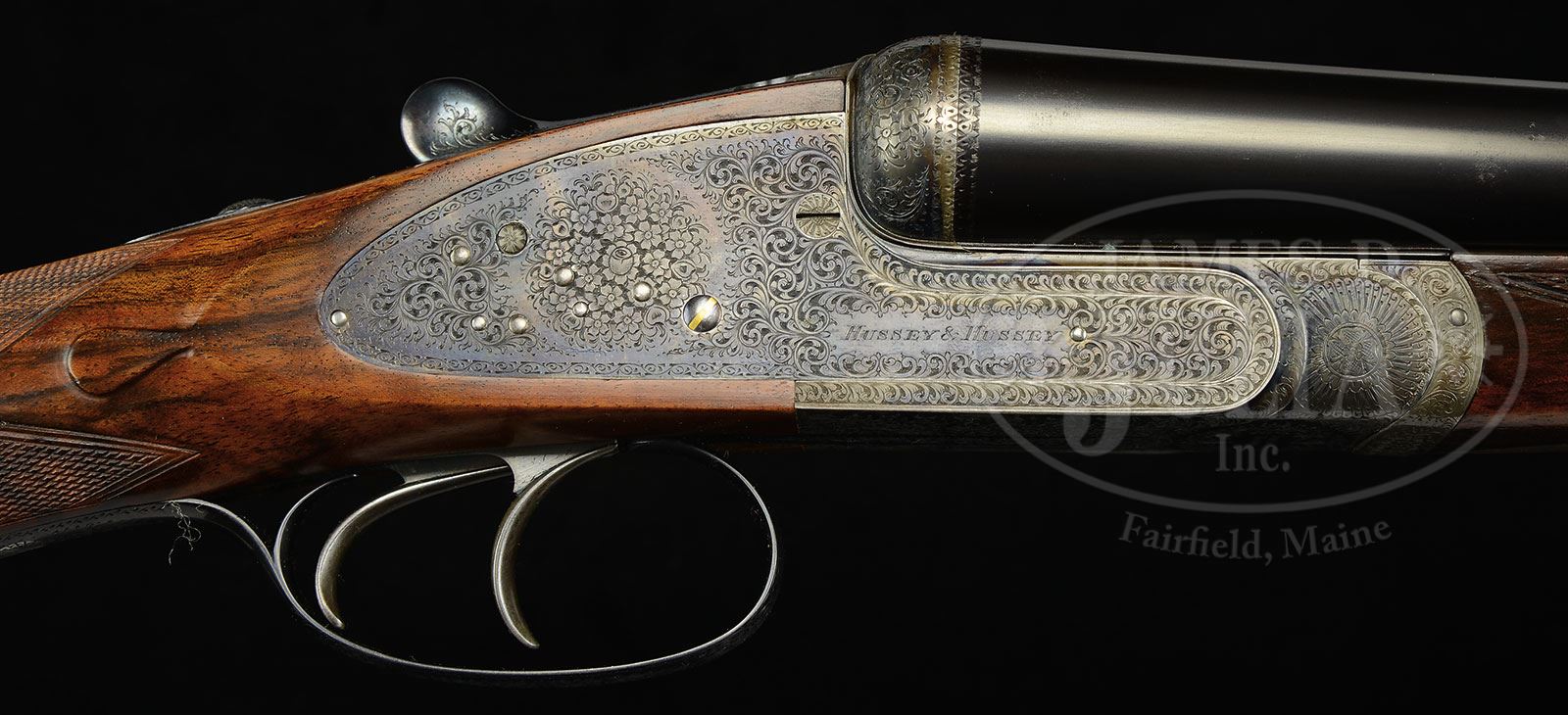 *FINELY REFURBISHED PAIR OF HUSSEY & HUSSEY BEST IMPERIAL EJECTOR SIDELOCK GAME GUNS WITH H&H OAK AND LEATHER CASE.SN 14547/ 14548. (ca 1912) Cal. 12 ga. 2-3/4″ Chambers. 29″ Chopper lump bbls with swamped game ribs, are engraved “Hussey & Hussey” and “88 Jermyn Street, St.James’s, London.” on tops. Bbl flats are stamped with London nitro proofs for 2-1/2″ chambers. Bottoms of bbls are stamped with SNs. Guns are built as a pair and have “1” or “2” gold inlaid on rear portions of ribs, top levers, and forend tips. Case hardened full sidelock actions are stocked to the fences, and feature automatic safeties (SAFE gold inlaid), gold line tumbler end cocking indicators, and double triggers. Actions have nicely filed beads in “Best” manner, and are engraved with very well cut, shaded, open scroll with rose bouquet highlights. “Hussey & Hussey” is at the front part of each lockplate, and bottoms of actions are engraved “Imperial Ejector”. Blued top levers and trigger guards are scroll engraved. SNs are at grips. Beautifully marbled, and nicely fiddle figured, well matching, European walnut straight grip buttstocks measure 14-3/4″ over checkered wood butts, and feature classic drop points and point pattern checkering with mullered borders. Matching splinter Southgate ejector forends have Anson releases, and are also marked “1” or “2” on release push rods. Gun no. “1”: Bore diameter: left-.729, right -.729. Bore restrictions: left -.007 (IC), right -.006 (IC). Minimum wall thickness: left -.025, right -.029. Drop at heel: 2-1/8″, drop at comb: 1-1/2″. Weight: 7 lbs. 2 oz. LOP: 14-3/4″. Gun no. “2”: Bore diameter: left-.730, right -.730. Bore restrictions: left -.008 (IC), right -.008 (IC). Minimum wall thickness: left -.027, right -.026. Drop at heel: 2-3/16″, drop at comb: 1-7/16″. Weight: 7 lbs. 1 oz. LOP: 14-3/4″. Very fine oak and leather two gun case with brass corners and round central medallion is lined in very dark green cloth with black leather gold embossed H&H New Bond Street label, paper charge label for gun nos. 22924 and 22925, and paper information label about the AB ejector, in lid. A cloth covered dust protector is between lid and bottom compartments, which contain two pairs of snap caps marked “12”, an unmarked square oil bottle, and a pair of rosewood handled turnscrews. CONDITION: Excellent, as completely refurbished, retaining nearly all of their factory quality finishes. Actions are silvered slightly on beads. New buttstocks are nicely shaped, and correctly checkered. Orig forend wood refinished, and re-checkered. Bores are excellent. Actions are tight. Bbls are on face. Ejectors are strong and in time. Case leather is fine with numerous marks and scuffs, but still light in color. Interior cloth is very fine, with some rubs through on some partitions, and one small partition is missing. Labels are excellent. Hussey guns have a reputation for being of superb quality, these guns are ready for another century of enjoyment. 4-53671 MGM287 (25,000-35,000) – Lot 2215