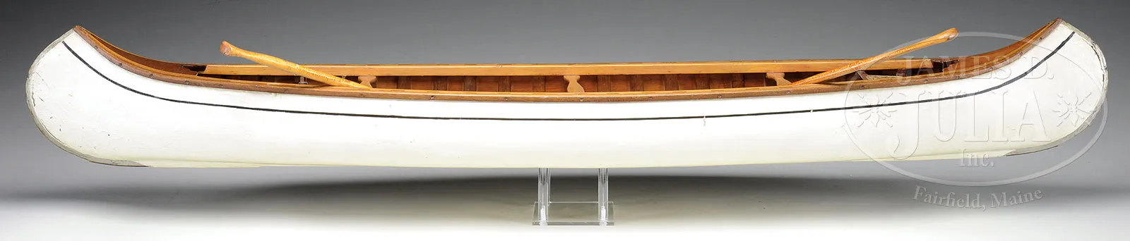This canoe dates to around the 1920’s and is a 52″ model. Edwin White of Maine was one of America’s earliest builders of wooden canoes. He was also an early builder of wooden boats and began making his canoes in the late 1880’s. This is obviously a White Canoe and exhibits the deck cut-out in the exact shape that Edwin White used. He was in direct competition with the famous Old Town Canoe Company in Old Town, Maine, who eventually bought the White Company out in the 20th century. According to scholars, there are only a couple documented White Canoe samples known so this is exceedingly rare. This canoe is fitted with two appropriate paddles of the period which may be Old Town paddles? One looks to be Birdseye Maple. SIZE: 52″ l. CONDITION: With the exception of some scattered paint flecking, the canoe is in outstanding condition and most certainly a beautiful and rare example. 52384-2 (7,000-9,500) – Lot 2215