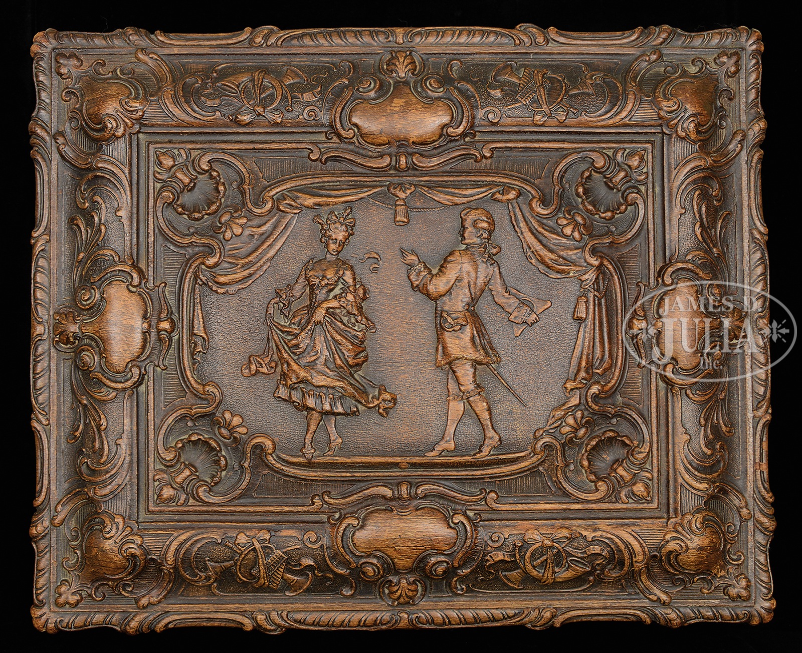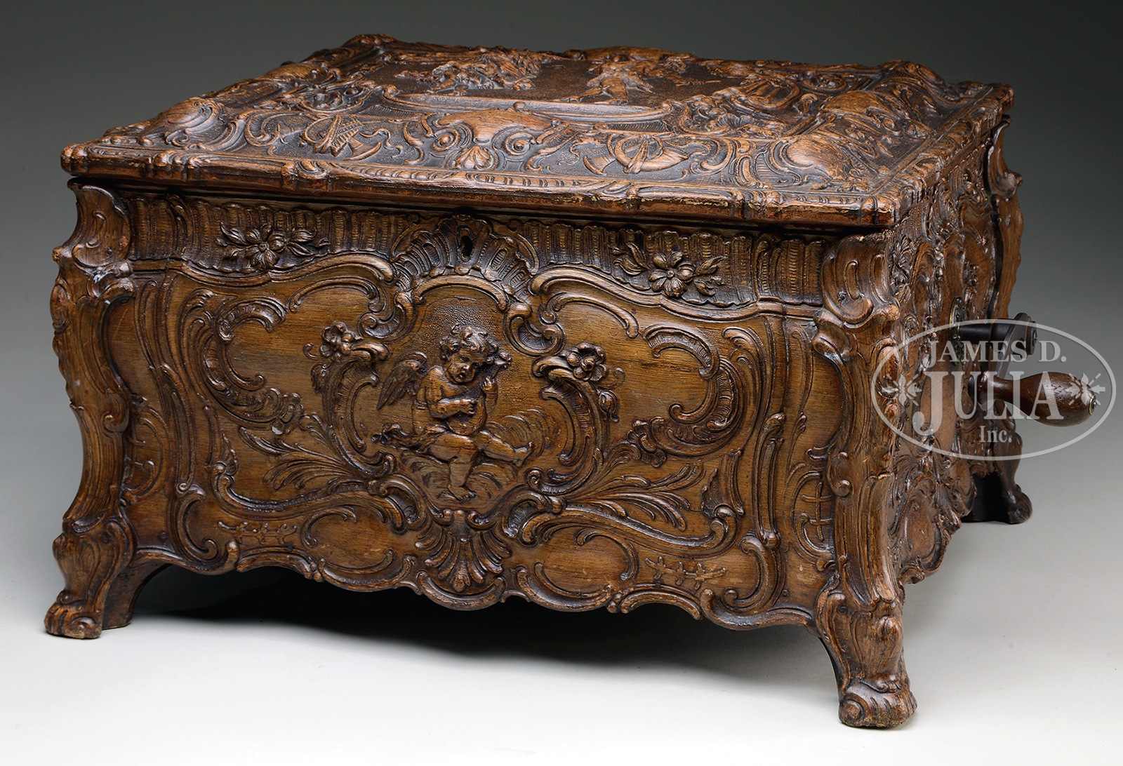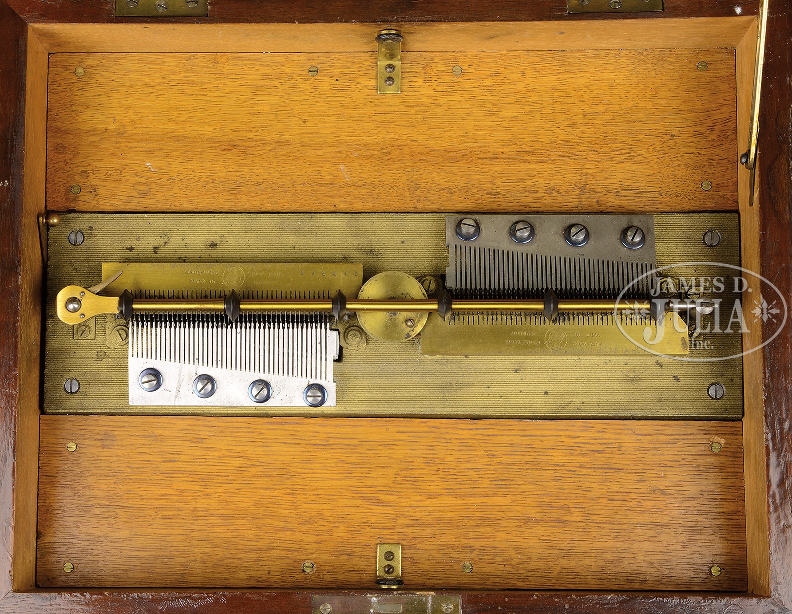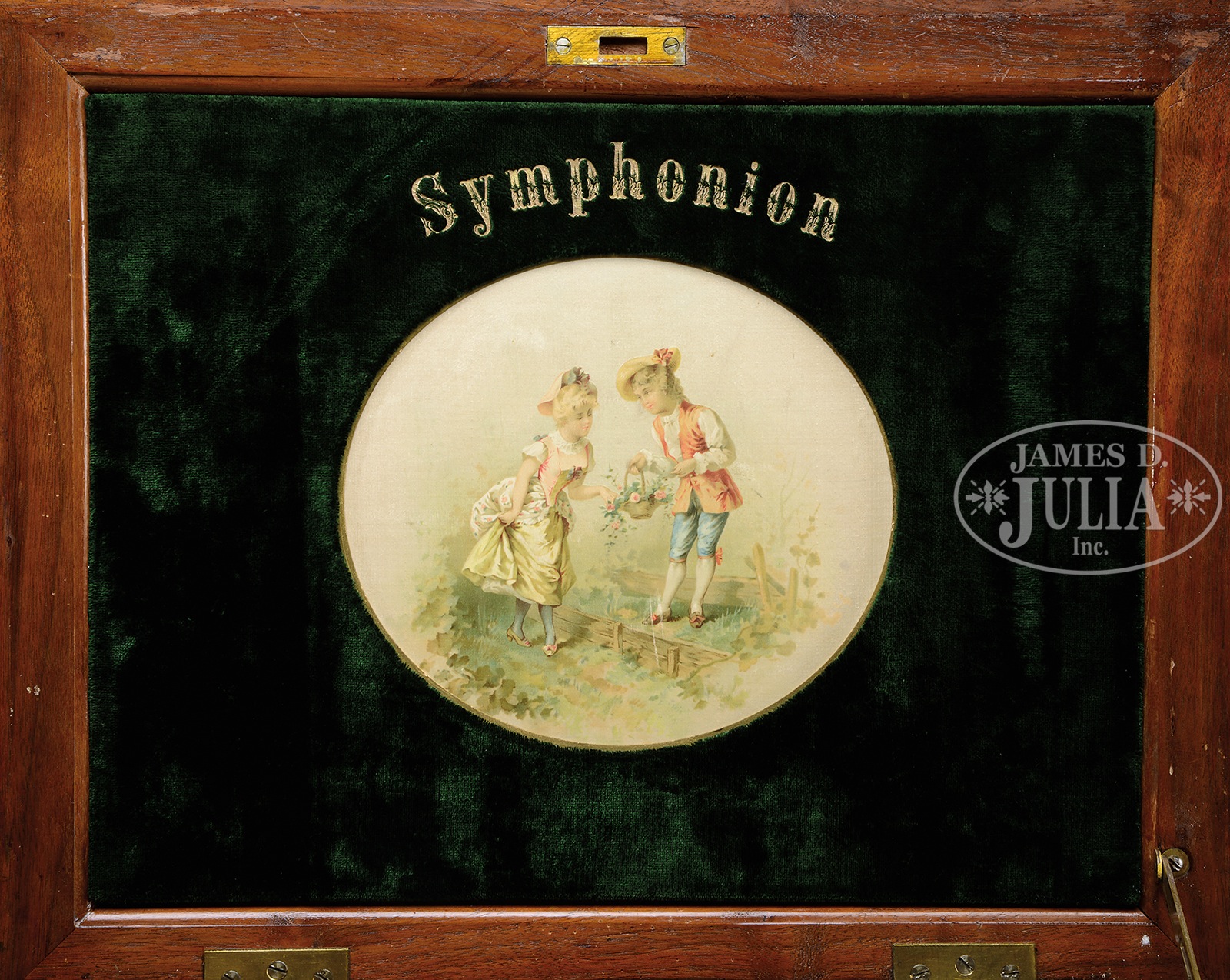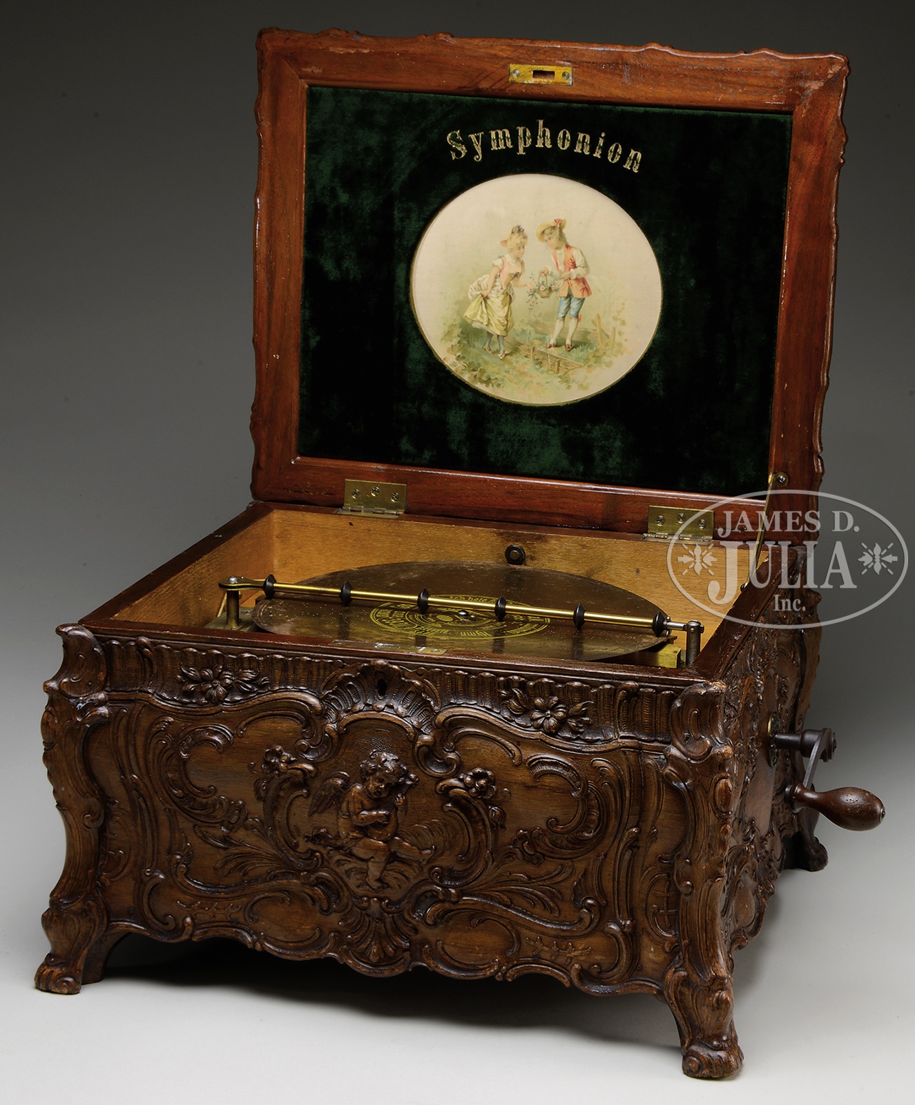 SYMPHONION STYLE 25C ROCOCO MUSIC BOX.Elaborately carved case with floral swags, leaves and cherubs and top carved with courtly dancers. Top opens to reveal velvet lined lid marked “Symphonion” with paper vignette of a young couple in a garden. Dual comb mechanism plays 11-3/4″ discs, of which six are included. SIZE: 19-1/2″ l x 16″ d x 12″ h. CONDITION: Very good to near excellent with no broken or repaired teeth. 48369-1 (2,000-4,000) – Lot 2216 Auction: Advertising, Toy & Doll - Spring 2015 Please Note: All prices include the hammer price plus the buyer’s premium, which is paid by the buyer as part of the purchase price. The prices noted here after the auction are considered unofficial and do not become official until after the 46th day. |