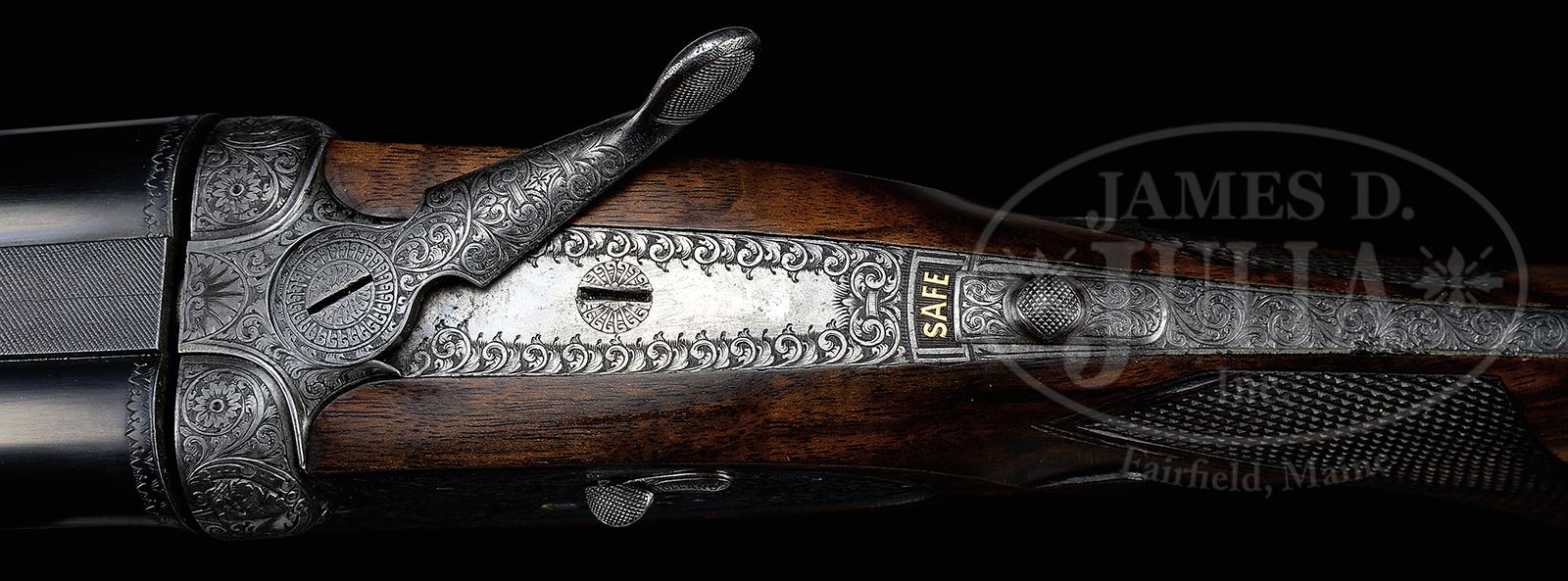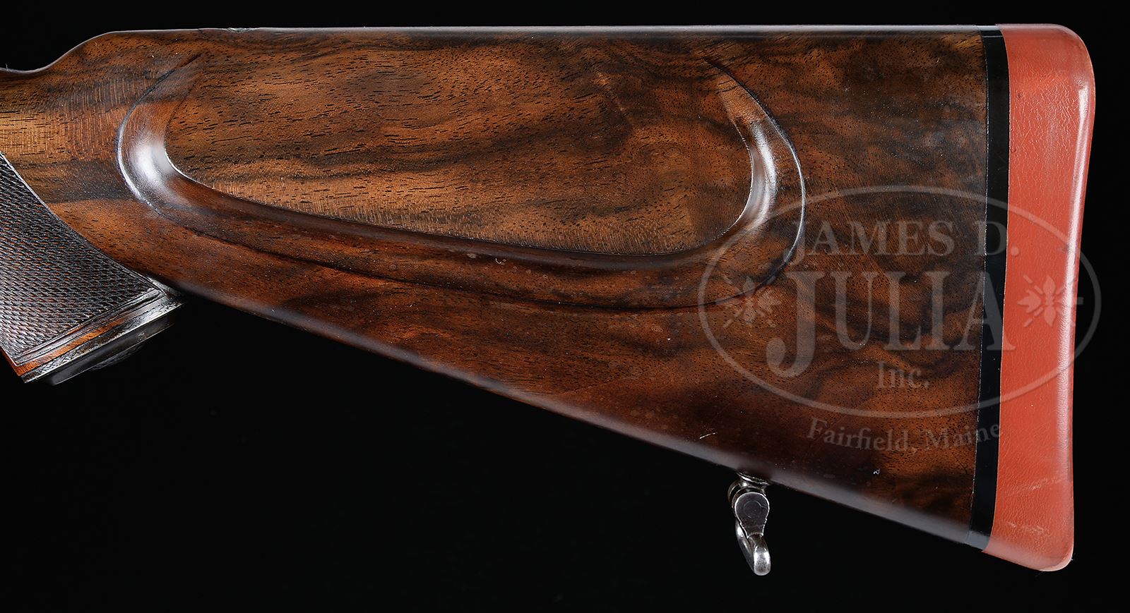 *HOLLAND & HOLLAND ROYAL HAMMERLESS DANGEROUS GAME DOUBLE RIFLE WITH AMMUNITION AND CASE.SN 19180. (ca 1907) Cal. 500/465 Nitro. This fine rifle is one of the first made in this caliber necessitated by the ban on .450 caliber rifles in India and the Sudan. 26″ Chopper lump bbls are fitted with matted quarter rib, holding one standing, two folding leaf express rear sight and front ramp holding silver bead and flip-up night bead. Transitions of quarter rib and front ramp are filed in typical H&H manner. Tops of bbls are engraved “Holland & Holland. 98. New Bond Street, London.” and “Winners of All the “Field” Rifle Trials, London.” Bbl flats are stamped with London nitro proofs for 465 express, 75 grains cordite, and 480 grain bullet. Bottoms of bbls are stamped with SN and Whitworth steel sheaf of wheat trademarks. A sling loop is soldered to bottom rib. Sidelock action with top tang extending over comb, features automatic safety, hidden third fastener, bushed strikers, gold band tumbler end cocking indicators, and dbl triggers (front checkered and articulated). Brazier back locks are fitted with Holland’s patented hand detachable pin. Action is engraved in typical Holland Royal style with near full coverage well cut, varying sized, shaded scroll, surrounding “Holland & Holland” in arched device on each lockplate. Bottom of action is engraved “CHARGE” “75 Grains cordite” “500/465” “Case 3-1/4 Inches”. Fences are engraved with scroll and acanthus with floral highlights. Trigger guard with scroll on bow has SN at grip, which extends to engraved steel trap cap. Nicely marbled and broadly fiddle figured European walnut capped pistol grip buttstock measures 14-1/8″ over Silver type pad. Stock is finished in classic H&H style with shadow line right hand cheekpiece, drop points, and point pattern checkering at grip, with mullered borders and inward curving rear line. A sling loop, matching that on bbls, is on toe line. Matching splinter forend has pivoting lever release. Drop at heel: approx 2-1/2″, drop at comb: approx 1-13/16″. Weight: 10 lbs 14 oz. LOP: 14-1/8″. Makers oak and leather case with brass corners and central medallion, is lined in scarlet cloth, and has gold embossed H&H black leather label in lid, along with instruction notice and charge card for 500/ 465 express rifle no. “28210”. Bottom compartment is separated by dust flap, and contains case straps, pair of snap caps, H&H marked round oil bottle, and a well made cotton web and leather sling marked “H&H”. Also included are two plastic boxes from Superior Ammunition containing 27 empty, and 3 loaded cartridges, with HDS head stamps. CONDITION: Fine as refurbished. Bbls retain nearly all of a satin re-black. Action is cleaned to silver gray with some areas of scattered light pitting, mostly at juncture of forend iron to wood. Well made and shaped replacement stocks retain nearly all of their hand rubbed oil finish. Bores are good, with strong rifling, frosted in grooves. Action is very slightly loose. Bbls are a bit off face. Case leather is darkening, with many scuffs, marks, and stains. Handle is good, a bit tender. Interior cloth is fine with many compressions and soiling. A classic Holland rifle, simply in need of a new hinge pin to make it ready for any big game. 49417-23 MGM364 (45,000-65,000) – Lot 2217 Click here to view provenance