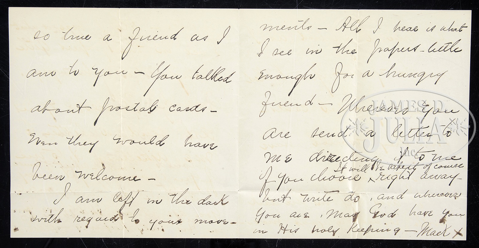 MYSTERIOUS LOVE LETTER SIGNED “MACK X” WRITTEN TO GENERAL GEORGE A. CUSTER RECEIVED THE DAY AFTER HE STARTED HIS LITTLE BIG HORN CAMPAIGN.3 pages, small 8vo, no place, (but sent via railroad post on the Pennsylvania RR New York to Washington route, and then on the Chicago and Grand Rapids RR), May 14, 1876. The writer frantically pens “Why don’t you write? Even if you were starting out on a march, I should think you might with a pencil send a mark even, to so true a friend as I am to you – You talked about postal cards – Even they would have been welcome. I am left in the dark with regard to your movements. All I hear is what I see in the papers – little enough for a hungry friend. Wherever you are send a letter to me directing it to me if you choose (It will be safest of course) right away – but write do, and wherever you are, may God have you in His holy keeping”. With orig envelope marked “Personal” directed to “Genl Geo A. Custer/Fort Lincoln/Dakota Territory”, with post marks of the aforementioned railroad post offices and stamped “MISSENT” by the Chicago & Grand Rapids, whose post mark gives the date of May 18. It was on May 17 that Custer and his men rode out from Fort Abraham Lincoln, making the five week march to the banks of the Little Big Horn River in Montana, where they would meet their bloody end. This letter would seem to give support to claims made by Custer’s fellow officers that he engaged in extramarital affairs. It is difficult to put any other construction on so ardent a plea for communication, and the suggestion that sending it directly to the writer would be safest, perhaps keeping it out of the hands of a jealous husband or disapproving parent! Custer would never live to read this letter, leaving us with the unpleasant certainty that it was subsequently opened and read by his famously devoted wife. PROVENANCE: General George A and Elizabeth Custer, Margaret Flood (Libbie Custer’s personal assistant), Spink Smythe, Lot 1090, August 22, 2012. CONDITION: Cracking starting at folds. Small holes at fold junctions in all pages, otherwise very good. 48441-14 (3,000-5,000) – Lot 2218