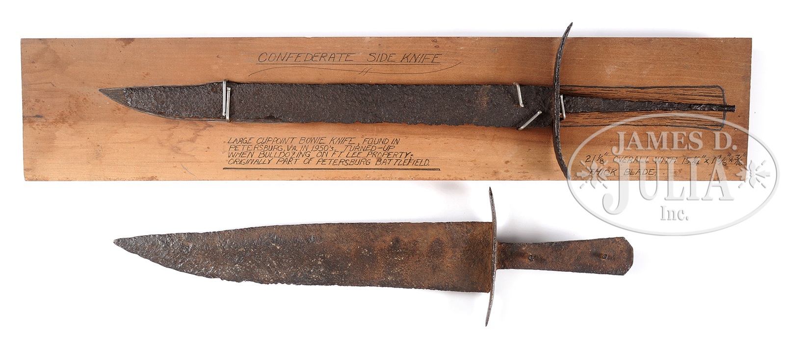 TWO MASSIVE CONFEDERATE BOWIE KNIFE BATTLEFIELD RELICS.These two knives were imposing weapons. 1) Clip point Bowie, 21″ overall with 15-1/4″ blade, very similar and almost identical dimensions to a North Carolina identified Bowie knife pictured on pg 243 of Confederate Bowie Knivesby Milton, Phillips & Sexton. 2) Clip point Bowie, 18″ overall with massive 13″ blade, 2-1/2″ wide, .3″ thick with 4-3/4″ iron crossguard. Both these knives have that typical excavated patina expected from real battlefield relics. The longer of these two knives is mounted on a board with inscription on verso stating the bulldozer drivers name who bulldozed this knife up in the 1950’s at Ft. Lee, VA which was once part of the Petersburg battlefield. Real Confederate dug up Bowie knives from battle fields are rare. PROVENANCE: Wayne McNeese Collection. CONDITION: Iron patina and heavy pitting overall, of course only metal portions remain. About 1″ of tip of longer knife is missing. 50427-9 JS (3,000-5,000) – Lot 2218