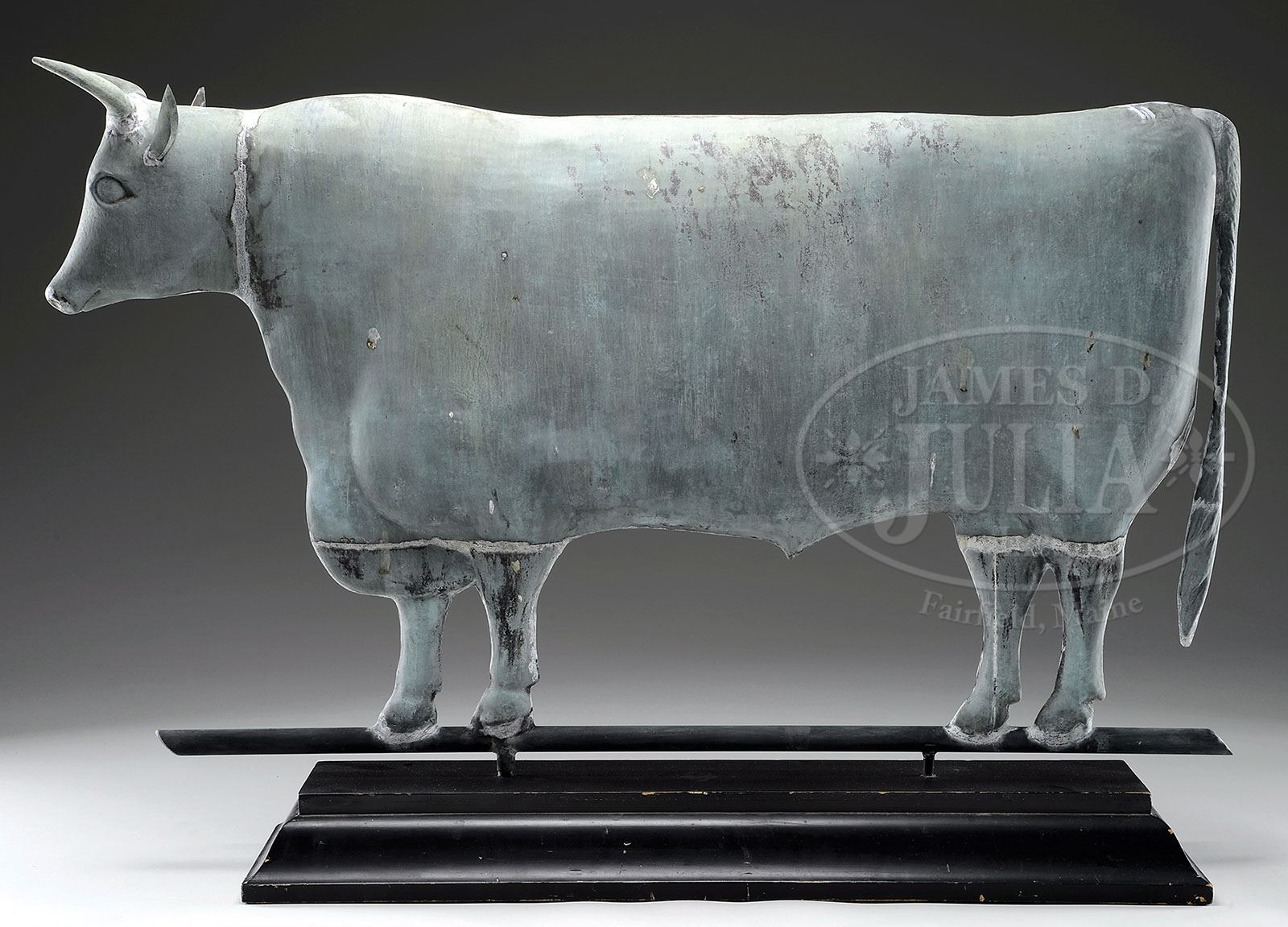 LARGE FULL BODIED COPPER STEER WEATHERVANE. Attributed to Cushing & White, Waltham, Mass. Late 19th Century. For similar examples see The Art of the Weathervane by Steve Miller, James D. Julia Auction 2013 Winter sale lot 2080, Skinner catalog for Andy Williams Folk Art Collection lot 20. SIZE: 39-1/2″ L x 23-1/2″ T. PROVENANCE: From a private collection; Formally acquired from an old museum collection. CONDITION: Very good to excellent overall with exceptional green verdigris patina. 9-92808 (15,000-25,000)