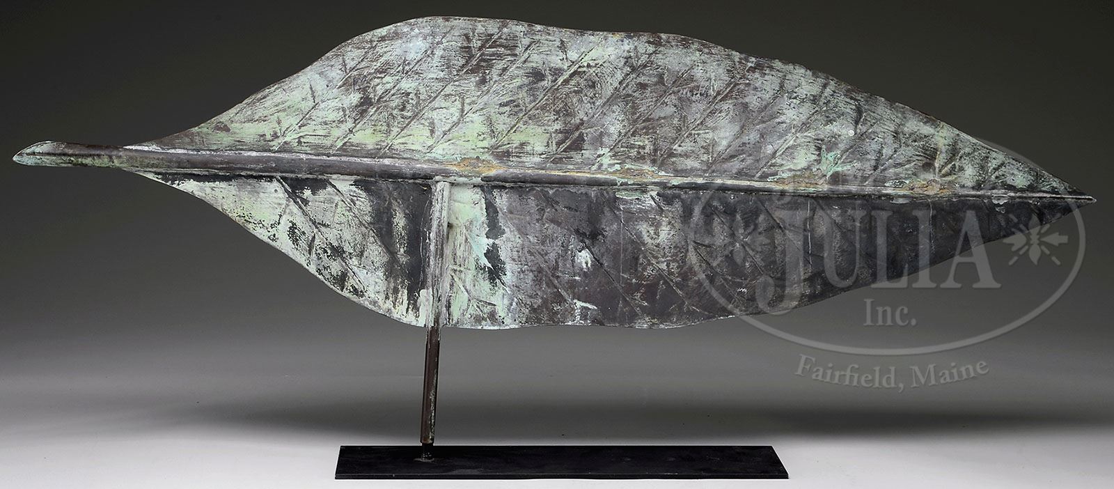 FINE & RARE VERDIGRIS COPPER TOBACCO LEAF WEATHERVANE WITH ORIGINAL MOUNTING BASE. Last quarter 19th Century. Retaining wonderful verdigris surface. Mounting base displaying stylized tobacco elements and featuring tobacco buds rendered in iron and copper. SIZE: Overall: 109″ T – Leaf: 48″ L x 14″ W. PROVENANCE: From West Virginia. CONDITION: Very good. Leaf showing signs of being resoldered at one time. Base appears very good, one bud showing solder repair. Good verdigris surface and traces of original paint decoration. 9-90245 (25,000-35,000)