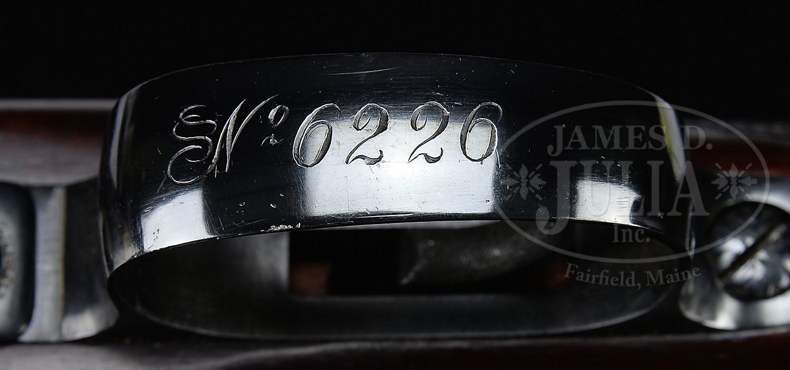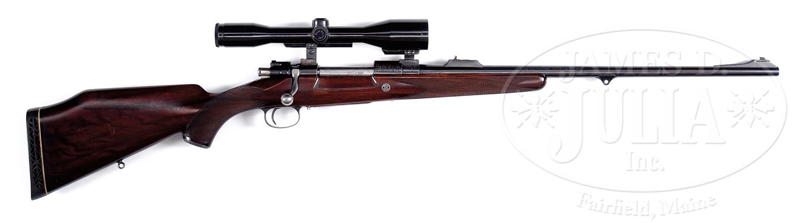 *FINE JOHN RIGBY MAUSER RIFLE “THE FIRST 7MM REMINGTON MAGNUM MADE BY RIGBY’S” WITH SCOPE AND CASE.SN 6226. (ca 1972) Cal. 7mm. 23″ Medium weight round bbl is fitted with island base for three leaf express rear sight, sling eye, and ramp front base. Bbl is engraved in Old English script “First 7mm Remington Magnum Cal. Rifle” “Built By” “John Rigby & Co 13 Pall Mall London. S.W.1”. Rear portion is fitted with claw base in banded-on boss. FN 98 large ring Mauser action is engraved with large open shaded scroll. Top of receiver ring is engraved “Calibre 7mm” “Remington” “Magnum” “175 Gr Bullet”. Rear claw base is on bridge. Standard steel bottom metal has had trigger guard bow nicely thinned and shaped, and has typical FN removable floorplate with push button release. Floorplate and front part of bottom metal are scroll engraved to match action. This engraving surrounds nicely detailed, relief gold inlaid, face-on portrait of waterbuck with engravers signature at bottom right. Rigby SN is on trigger guard bow. Finely marbled, dark, red-toned, European walnut capped pistol grip Monte Carlo stock measures 14-3/8″ over open sided black White Line pad. Stock features large swept right hand cheekpiece, scroll engraved recoil bolt, and point pattern checkering with mullered borders at grip and forend. Steel grip cap with trap is also scroll engraved, and initials “PR” are gold inlaid on cover. Zeiss Diatal – D 6×42 rail scope with three post and crosshair reticle is in claw mounts, rear with windage. Drop at heel: approx 3″, drop at rear of Monte Carlo: approx 1-7/8″, drop at comb: approx 1-5/8″. Weight with scope: 9 lbs 3 oz. LOP: 14-3/8″. Nice quality leather case with brass corners is lined in burgundy cloth and has Rigby paper label with King Street address along with instruction label in lid. Case contains exterior straps, leather sling with hook type swivels, scope bag, and a tin of Motty rifle paste. PROVENANCE: Richard Schreiber Collection. CONDITION: Excellent. Metal parts retain approx 95% orig blue, with slight silvering on bottom metal. Stocks retain nearly all of their orig oil finish with a number of scratches and light dings, mostly on right side of butt and in action area. Checkering lightly worn. Bore is excellent. Action smooth. Scope has some scuffs and marks in its lacquer finish. Optics clear. Case leather is excellent with some scuffs. Interior cloth is very fine. Labels are very fine with some rubs. 49311-2 MGM197 (4,000-6,000) – Lot 2221