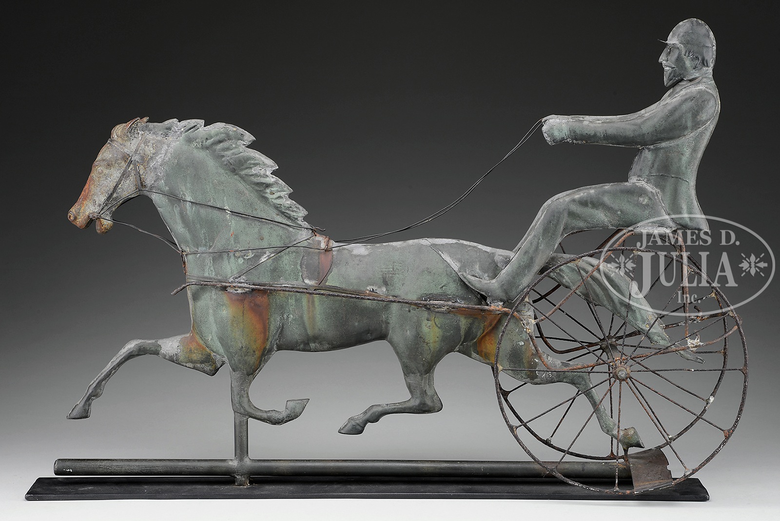 MOLDED COPPER AND CAST ZINC HORSE AND SULKY WEATHERVANE ATTRIBUTED TO CUSHING & WHITE.Molded copper running horse with cast iron head. Having a molded copper driver atop a two wheel sulky with iron wire wheels. Attributed to Cushing & White, Waltham, MA. Mounted on a museum stand. SIZE: 21″ h x 30″ l. CONDITION: Very good. Dark verdigris finish with minor rust stains from iron wire harness. Minor rust pitting to iron wheels. 9-93768 (10,000-15,000) – Lot 2223