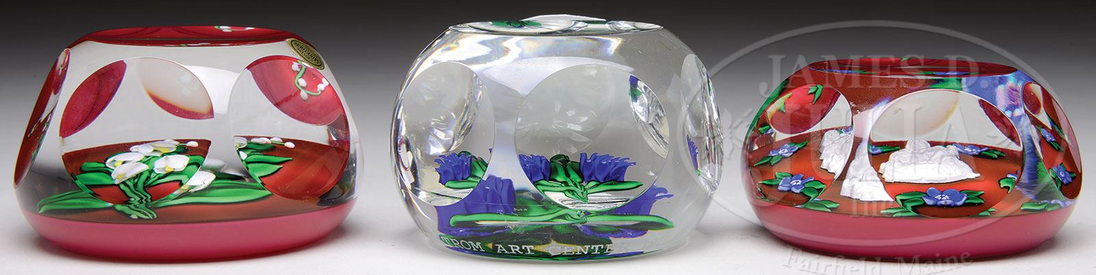 LOT OF THREE ST. LOUIS MODERN PAPERWEIGHTS.1) St. Louis, modern French paperweight with a cherub “Amour” on a fuchsia background with five blue 5-petal flowers, six and one window facet. Signed “SL1979” in a cane on the underside. 2) St. Louis, modern French commemorative paperweight for “Bergstrom Art Center 1979 111/200” with double blue cornflower and bud with green leaves six and one window facet and star cut base. 3) St. Louis modern French lily of the valley on fuchsia ground with a six and one window facet. Signed on the underside in a cane “SL1982”. All three are housed in their original fitted boxes. SIZE: All three are 3″ dia. CONDITION: All are very good to excellent. 5-69545 (500-700) – Lot 2223
