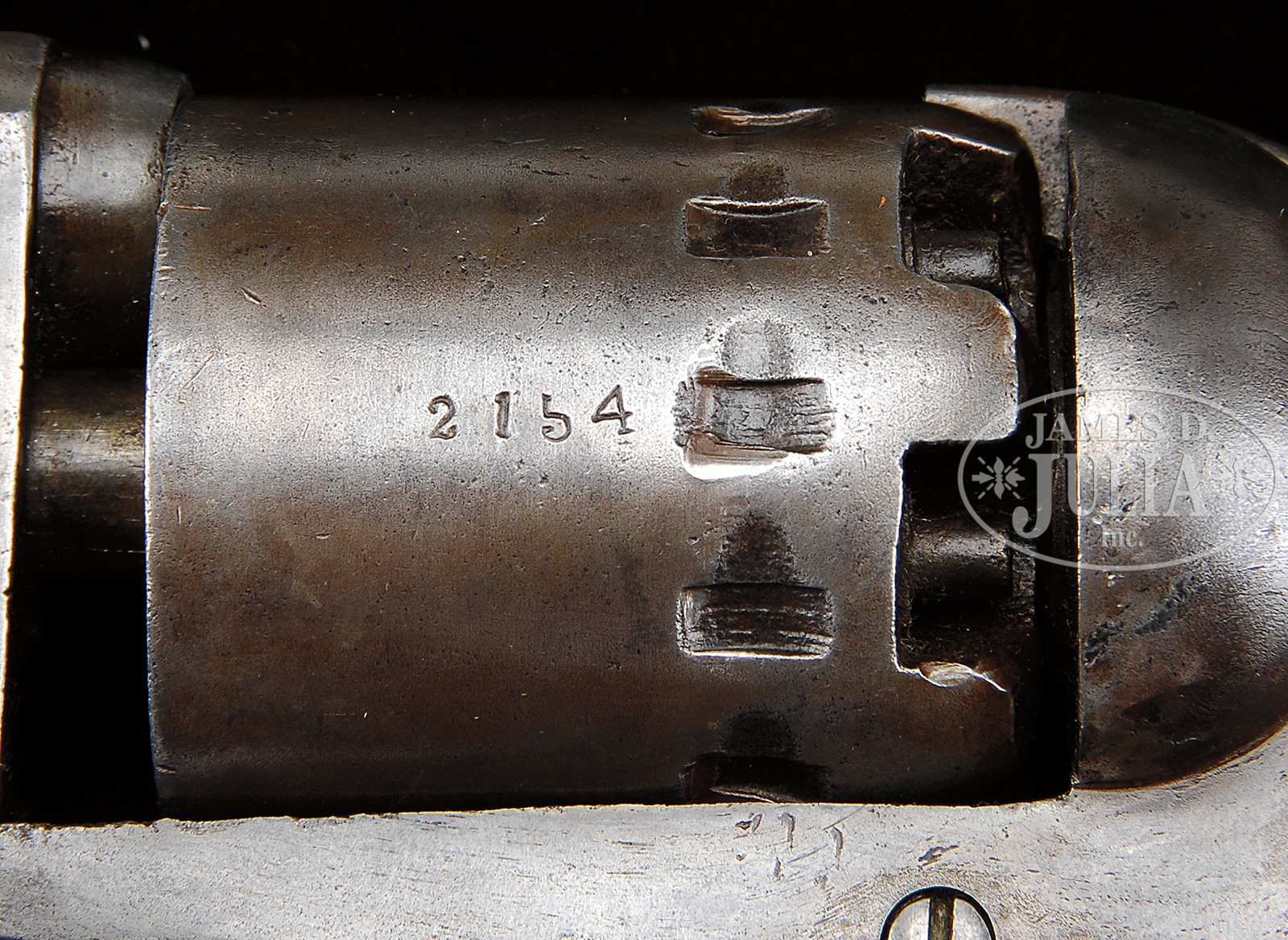 VERY RARE CONFEDERATE C.H. RIGDON AUGUSTA GEORGIA REVOLVER.SN 2154. This is a very rare marking combination gun with only 3 specimens noted (SN 2180 and 2182 are the other examples). SN 2182 was sold as Lot #3364 on these floors in October, 2015. These Confederate contract revolvers instead of having just the normal “CSA” surcharge on one bbl flat, are marked on the three top flats of the part oct bbl housing “CH RIGDON”, “CSA” and “AUGUSTA GA” and as noted only 2 other examples are known. All major components of this gun appear original and matching SN “2154” appears on the loading arm, latch, bbl housing, frame, trigger guard, backstrap, cyl and penciled in backstrap channel of grips. PROVENANCE: Norm Flayderman Collection, 1988; Burney Crooke Collection; Gene Mathis Collection, 2006. CONDITION: Overall good to very good, with old cleaning by noted antique firearms restorer Jay Huber. Jay cleaned this gun for Norm Flayderman when in his collection. Metal surfaces are gray and smooth. SNs are still strong and easy to read however, bbl markings are only partially discernible however, as can be seen in photos. The wedge and arbor without grease grooves are not serialized and are replaced possibly at time of use as surfaces match gun. Grips are well fit with hand worn patina. Mechanically pistol functions well with crisp discernible rifling in bore. 50155-1 JS42 (30,000-40,000) – Lot 2223