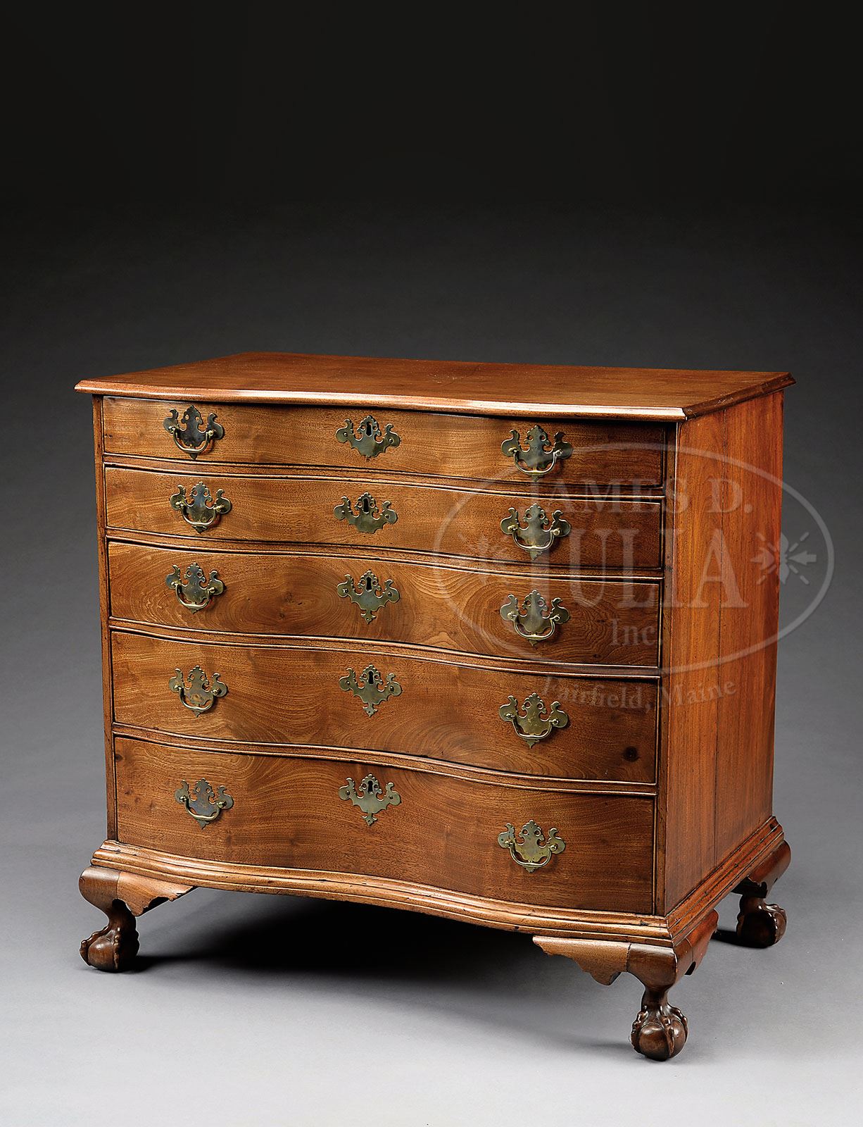 DIMINUTIVE, CHIPPENDALE SERPENTINE FRONT WALNUT MASSACHUSETTS FIVE DRAWER CHEST WITH BALL AND CLAW FEET. Diminutive, Chippendale serpentine front walnut Massachusetts five drawer chest with ball and claw feet, having a molded conforming serpentine top over five graduated drawers. Drawers surrounded by cock beading. Sitting atop well defined ball and claw feet. SIZE: 34″w x 21″d x 33-1/2″h. Case is 35″ PROVENANCE: Thomas Albert Newhall, (Salem), Mass. To his daughter, Lydia Jane Newhall, Germantown, PA. to her daughter, Lydia Jane Newhall Clark, to her daughter, Frances Clark Stoddard, to her son Richard H. Stoddard. This item was purchased at Freeman’s Auction, Fine Art Sale, Philadelphia, October 1992, Lot 1266. CONDITION: All original except finish, hardware and minor restoration to drawer bottoms. 9-92704 (5,000-8,000)