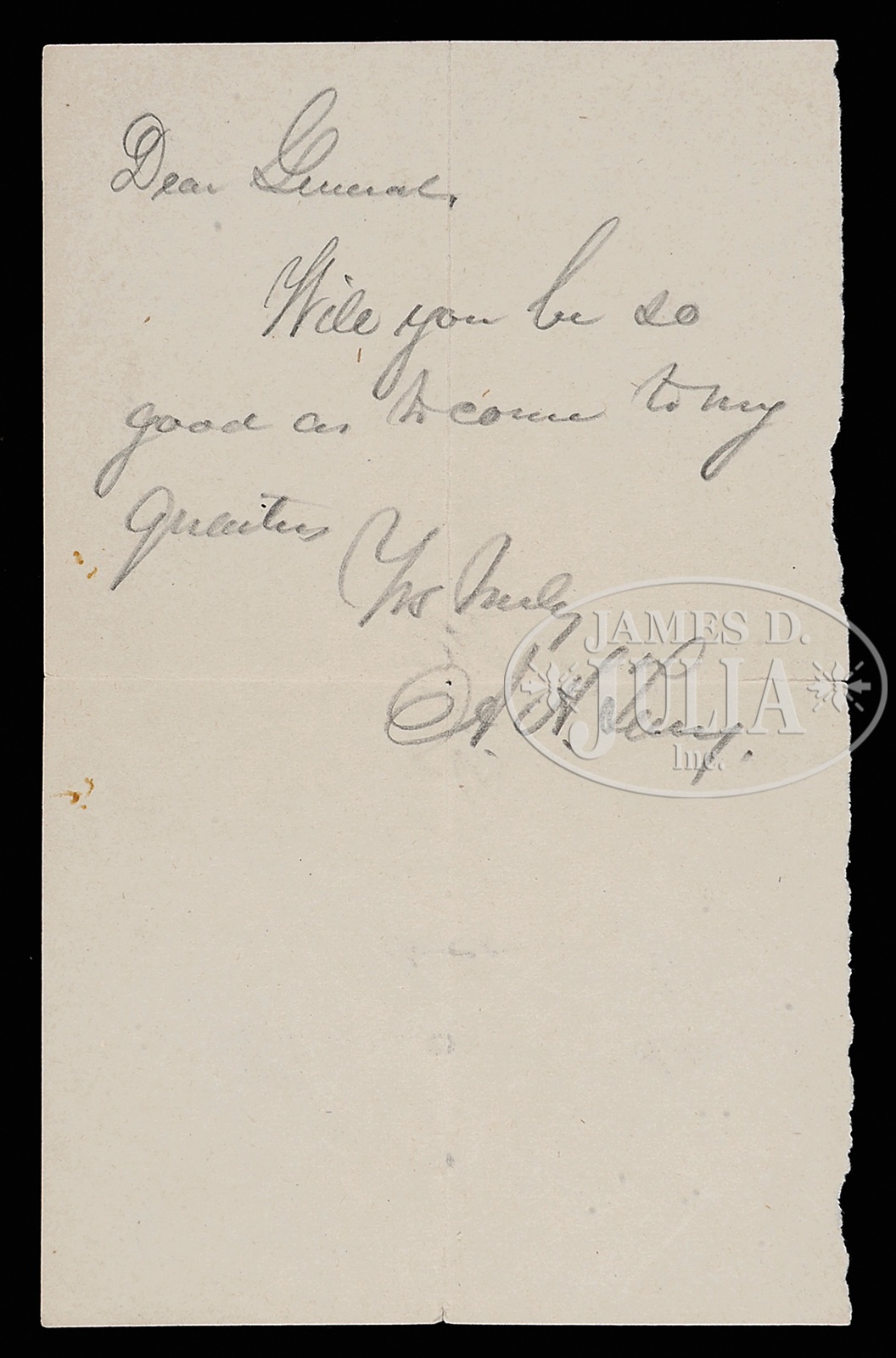 IMPORTANT AND HISTORICAL NOTE FROM GENERAL ALFRED TERRY TO GENERAL CUSTER FROM DIRECT DESCENT OF LIBBIE CUSTER.George Custer mentions receiving a note to visit General Terry in his tent just prior to him deciding to lead the 7th Cavalry at the Little Big Horn campaign June 22, 1876. This note was kept by Libbie for an important reason. Was this the last summons to Custer to see Terry with his orders of that date, detailing how he wanted Custer to deploy at the Little Big Horn when Indian camp was found? We all know the results of his actions. PROVENANCE: General George A and Elizabeth Custer, Margaret Flood (Libbie Custer’s personal assistant), Spink Smythe, Lot 1137, May 23, 2013. CONDITION: 4″ x 6-1/2″ folded in quarters, right edge ragged. 48441-3 (2,000-3,000) – Lot 2224