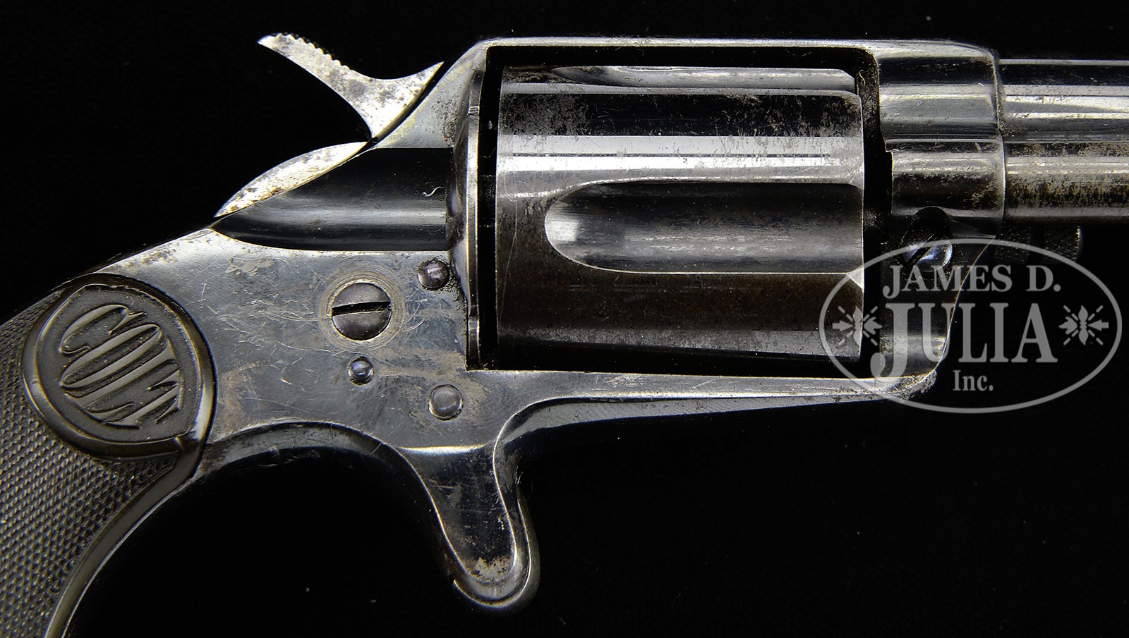 RARE COLT NEW POLICE “COP & THUG” SPUR TRIGGER REVOLVER.SN 17360. Cal. 38 Colt. Blue finish with 4-1/2″ bbl, half moon front sight and 2-line address with “NEW POLICE 38” etched panel on the left side. Right side of bbl has an ejector housing with bull’s eye ejector rod head. Left side of frame, below the cyl, is marked “38 CAL”. Cyl is 5-chambers with extra long flutes and stop notches on the rear face. Mounted with 2-pc, matching numbered, checkered hard rubber grips with “COLT” embossed at the top and the raised embossed figures of an 1880s policeman holding a revolver defending himself against an assailant wearing a long coat and bowler hat holding a knife. There were only about 4,000 of these revolvers produced in two finishes, three calibers and four bbl lengths during the period 1882-1886. These little revolvers are rarely ever found with high orig finish. PROVENANCE: Tommy Rholes Estate Collection. CONDITION: Very fine. Overall retains about 75% glossy orig blue with the loss areas flaked, not worn, to a light patina; etched panel is sharp & completely legible. Grips are sound showing very light wear with the left side having turned chocolate. Mechanics are fine, bright shiny bore with a few scattered spots of pitting. 4-50717 JR189 (3,500-5,000) – Lot 2224a