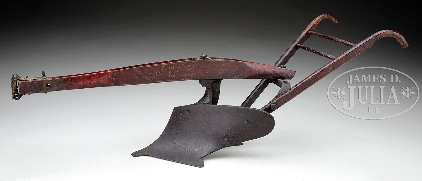 SALESMAN SAMPLE OLIVER CHILLED PLOW.This is one of the finest original examples of this plow to surface from one of the most recognized names in farm machinery. This classic walk-behind plow consists of a long wooden body with metal hardware and is hand painted in red, black and gold with “Oliver’s Chilled Patent” and “No. 40” across the top, “Manufactured by South Bend Iron Works, South Bend, Ind” on the right, and a variety of patent dates from the 1870s across the left. The original red paint and gold stenciling is so strong, it will knock your socks off with large iron plow blade exhibiting a wonderful dark patina. SIZE: 23” l x 8-1/2” h. CONDITION: Overall near excellent with uniform wear to original painted surfaces. Lacking front wheel. 47621-7 (5,000-7,000) – Lot 2225 Auction: Advertising, Toy & Doll - Spring 2015 Please Note: All prices include the hammer price plus the buyer’s premium, which is paid by the buyer as part of the purchase price. The prices noted here after the auction are considered unofficial and do not become official until after the 46th day. |