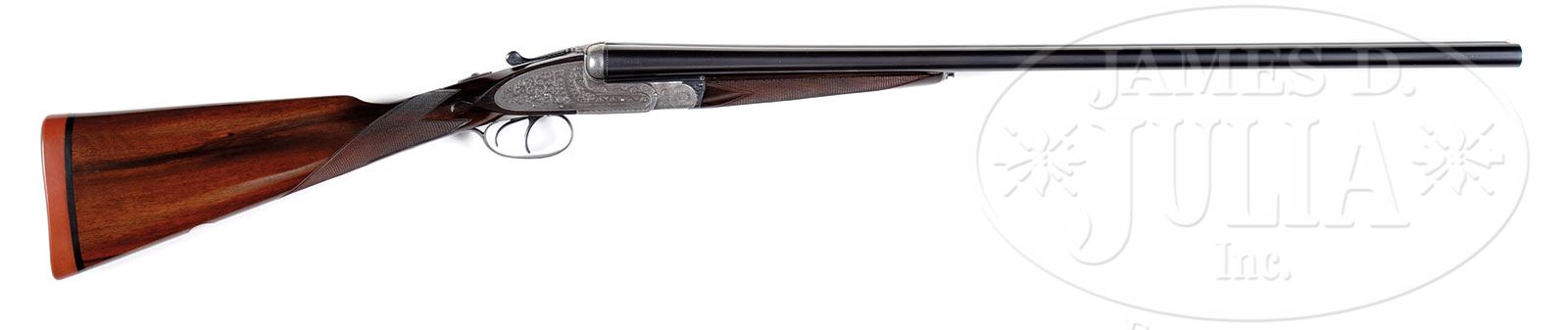 *COGSWELL & HARRISON 16 BORE SIDELOCK EJECTOR GAME GUN WITH CASE.SN 56295. (ca 1930) Cal. 16 ga. 2-3/4″ Chambers. 27-1/2″ Chopper lump bbls are engraved “Cogswell & Harrison Ltd. 168 Piccadilly. London” on narrow, deeply swamped, game rib. Rear extension is engraved “2” (gun is no. 2 of a pair with “2” engraved on forend iron, and front portion of safety button). Bbl flats are stamped with London nitro proofs for 2-1/2″ chambers, and Birmingham re-proofs for 2-1/2″ chambers. Bottoms of bbls are fitted with spring housing for typical C & H ejector system. Case hardened sidelock action is stocked to the fences, and features automatic safety (SAFE inlaid in gold) and double triggers. Action is engraved with approx 80% coverage medium scroll. “Cogswell & Harrison Ltd” is at the bottom of each lockplate. Scroll engraved floorplate, trigger plate, top lever, and trigger guard are blued. SN is on short tang of trigger guard. Relatively plain, streaked and lightly figured European walnut straight grip buttstock measures 14-1/4″ over brown leather faced Silver type pad. Stock features drop points, point pattern checkering with mullered borders at grip, and a vacant silver oval on toe line. Matching splinter ejector forend has Anson type release. Bore diameter: left-.667, right -.665. Bore restrictions: left -.017 (Mod), right -.008 (IC). Minimum wall thickness: left -.029, right -.032. Drop at heel: 2-1/8″, drop at comb: 1-1/2″. Weight: 6 lbs. 6 oz. LOP: 14-1/4″. Green canvas, tan leather trimmed case is lined in scarlet cloth, and contains 2-pc walnut and brass cleaning rod with mop, brush, and jag, Griffin and Howe engraved square oil bottle, a can of NEVARUST gun oil, and a black leather 16 ga. hand protector. CONDITION: Very fine, as partially refinished. Bbls retain nearly all of a satin re-black. Action and lockplates retain a considerable amount of their orig case hardening color. Blued parts retain most of their re-blue, slightly silvered from handling. Stocks retain nearly all of an old oil refinish, with numerous light marks, checkering re-cut and sharp. Bores are excellent with a hint of light frosting. Action has a hint of side to side looseness. Bbls are on face. Ejectors are in time. Case is excellent. Canvas is slightly faded, and marked from contact with straps. Straps and handle are fine. Interior cloth is very fine, with a few light marks and soiling from contact with gun. Accessories are excellent. 4-53774 MGM276 (6,000-10,000) – Lot 2226