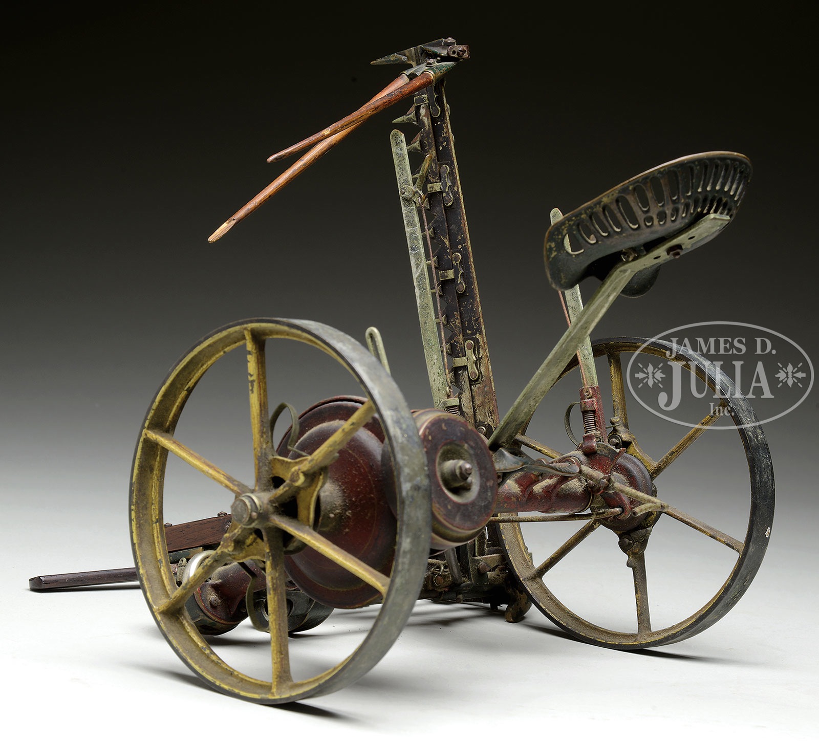 Please Note: The photo in the printed catalog is incorrect. The description is correct. Please see our website for correct photo. SALESMAN SAMPLE SICKLE BAR MOWER WITH OB.Another fine example of a desirable agricultural model by the famed Adriance company of Poughkeepsie, New York. Brass, iron, and wood model with large traction wheel that is connected to a gear mechanism that when activated puts the sidebar blades in motion when pulled along the floor. A second lever raises and lowers the right wheel to allow it to turn. Pierced brass formed seat sits above with gearbox marked “Adriance Buckeye”. Retains plaque marked “106” (matching numbered plaque on case) and rests within its original dovetailed wooden carrying case, which houses its original cardboard insert detailing directions and proper care. The insert exhibits some wear and tear, but is in reasonably good condition. Retains dual tapered dowel swath bar tips (one with small sliver missing). Tongue extension no longer present. SIZE: 18” w x 11-1/4” l. CONDITION: Very good overall. Would benefit from an overall cleaning to removing years of shelf dust and buildup. Case is generally good with occasional splits to wood and lock mechanism needs attention. 1084-1 (4,000-6,000) – Lot 2226 Auction: Advertising, Toy & Doll - Spring 2015 Please Note: All prices include the hammer price plus the buyer’s premium, which is paid by the buyer as part of the purchase price. The prices noted here after the auction are considered unofficial and do not become official until after the 46th day. |