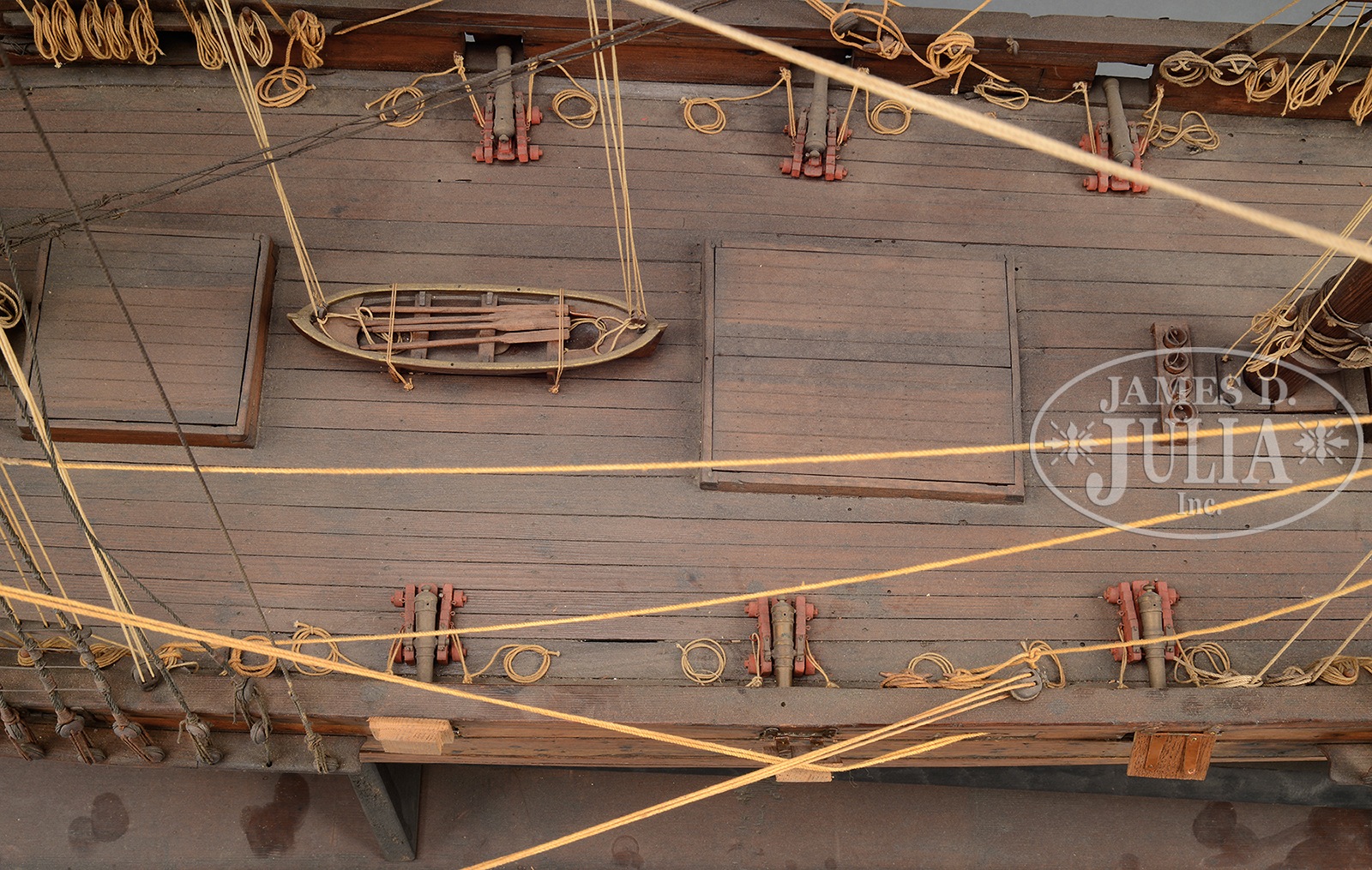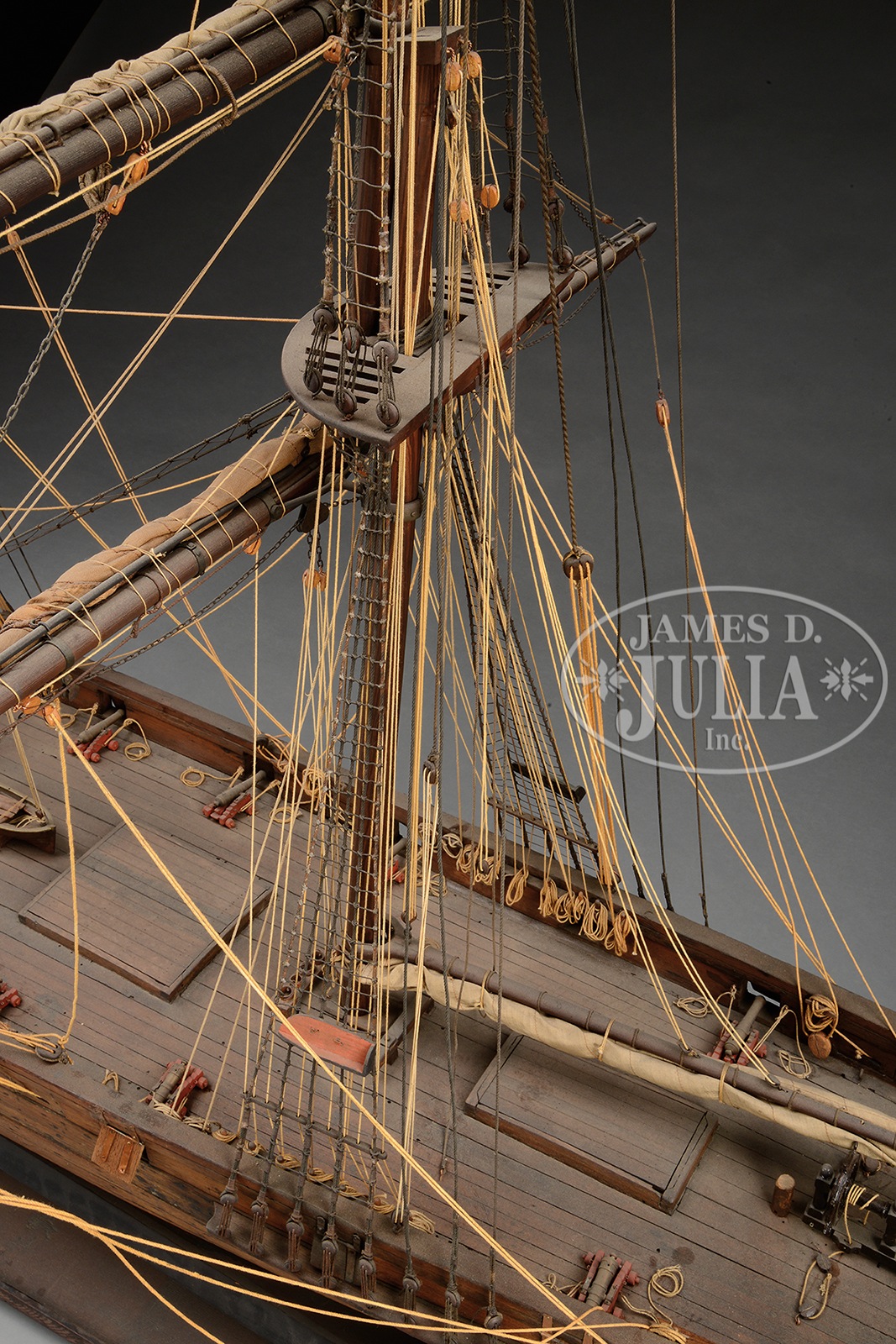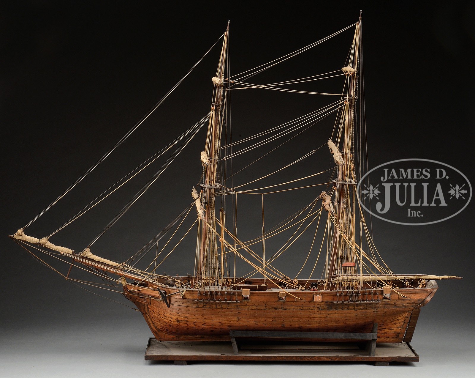 SUPERBLY DETAILED LARGE SCALE MODEL OF A FULLY RIGGED ARMED BRIG.19th century, American or British. The fine and accurately detailed model with full rigging, including fighting tops and sails furled on the yards, above a laid deck with removal hatch covers. The hull of plank on frame construction with functional gun ports for upper-deck canon. The model with carved and gilded figurehead of a helmeted soldier. Model is accompanied by a display stand. SIZE: 69″ h x 92″ l x 38″ w overall. CONDITION: Very good overall with undisturbed surfaces and natural patina. Some quality old restoration to lines and with minor insignificant imperfections. 50839-15 (2,500-5,000) – Lot 2227