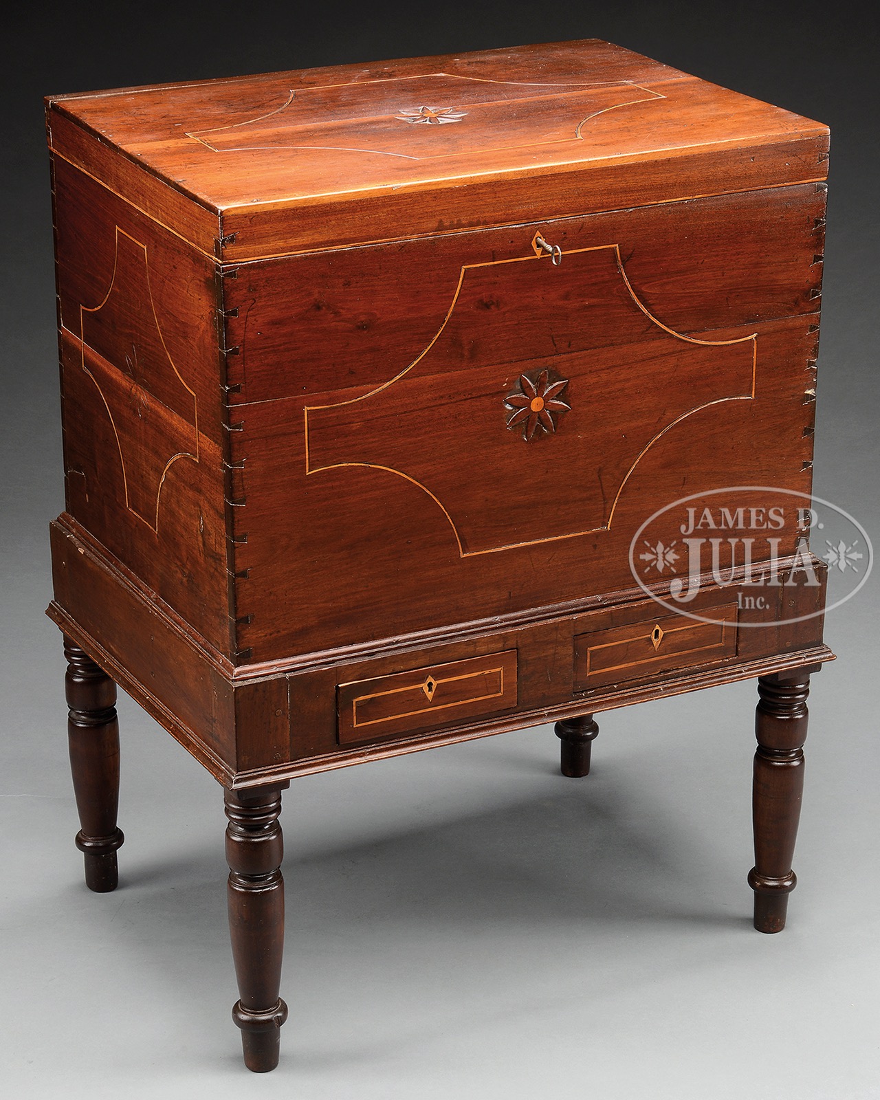 GOOD SOUTHERN INLAID WALNUT SUGAR CHEST.First quarter 19th century, probably South Carolina. The hinged lid with carved eight petal flower head within a contrasting string-inlaid border opening to storage area. Dovetailed box with similar floral carvings on sides and front set upon a table stand fitted with a pair of aligned short drawers with contrasting inlaid escutcheon and line borders. Raised on ring-turned swelled columnar legs with turned cuffs. SIZE: 34″ h x 26″ l x 18″ d. CONDITION: The top with butterfly repairs to old seam crack. Loss to one end of curved strip of string inlay. Locks and keys present. Surfaces cleaned and re-polished. Generally good. 51019-2 (1,500-2,500) – Lot 2228