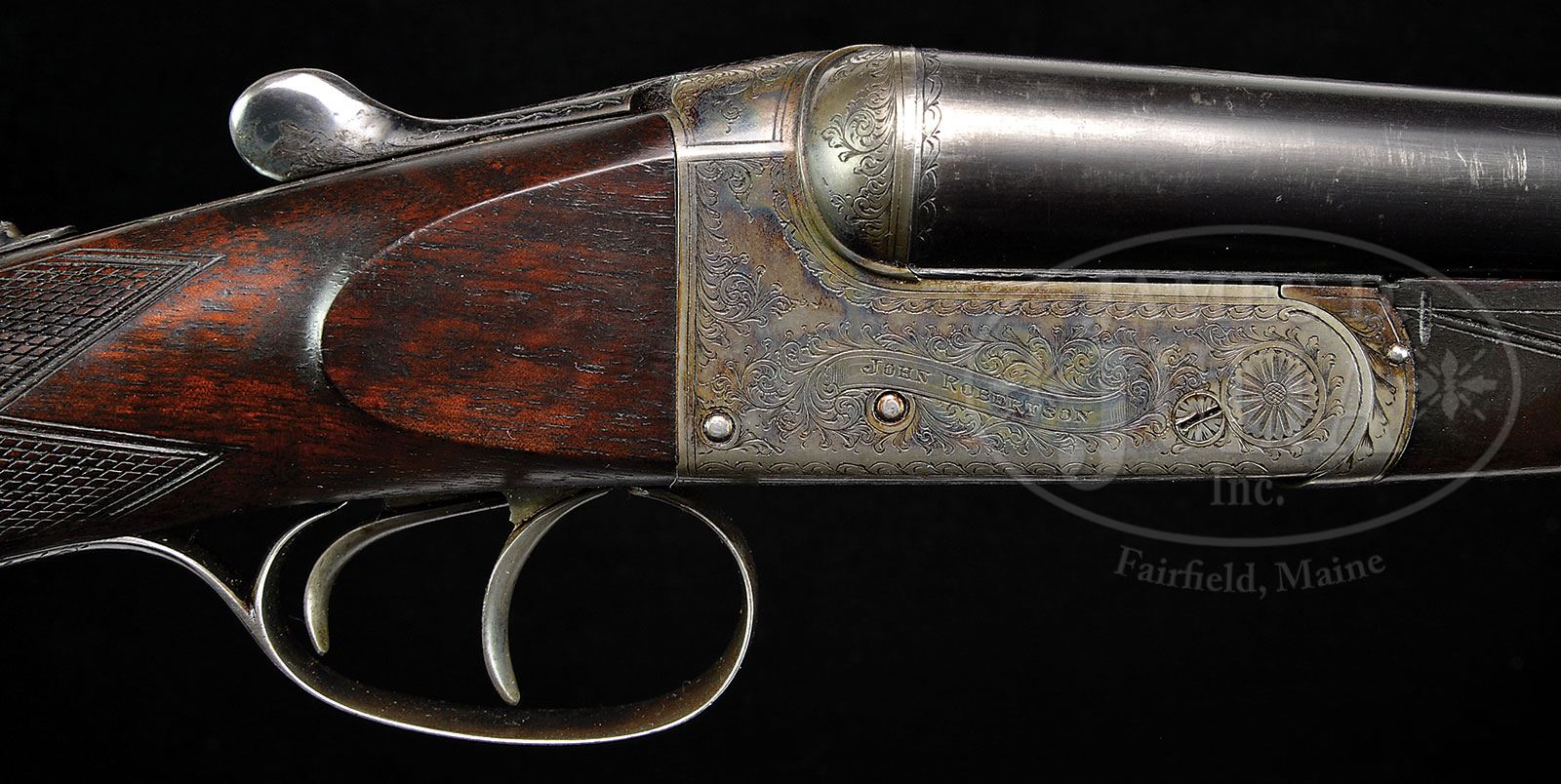 *JOHN ROBERTSON (BOSS) 20 GAUGE BOXLOCK EJECTOR GAME GUN.SN 8336. (ca 1935) Cal. 20 ga. 2-3/4″ Chambers. One of the excellent boxlock guns supplied by John Harper of Birmingham, and retailed by Boss under the Robertson name, and SNed amid other Boss guns. This gun has 28″ dovetailed bbls with narrow, concave rib which is engraved “Made in England” and “John Robertson. 41. Albemarle Street. London. W.” Bbl flats are stamped with Birmingham nitro proofs for 2-1/2″ chambers, bottoms of bbls engraved with SNs. Small boxlock action with nicely filed beads around fences, features automatic safety (SAFE silver inlaid), double triggers, and automatic ejectors. Action is engraved with approx 60% coverage well cut medium scroll. “John Robertson” is in scroll terminated ribands on each side. Blued top lever, floorplate, and trigger guard are also scroll engraved. SN is at grip. Very nicely flame figured European walnut straight grip buttstock with flat top point pattern checkering, measures 14-1/4″ over 1/2″ lengthening piece with checkered wood butt. A silver oval on toe line is engraved “H. S. M Jr” (Henry S. Morgan Jr., great grandson of J. P. Morgan, banker and philanthropist). Matching splinter ejector forend has Anson release. Bore diameter: left-.612, right -.612. Bore restrictions: left -.007 (IC), right -.003 (IC). Wall thickness: left -.033, right -.031. Drop at heel: 2-1/8″, drop at comb: 1-1/2″. Weight: 5 lbs. 9 oz. LOP: 14-1/4″. PROVENANCE: From the family of banker and philanthropist, J. P. Morgan, Jr. with letter explaining the order of family ownership. Gun was ordered by his grandson, Henry S. Morgan for his son, Henry S. Morgan, Jr. in 1935. Included are photocopies of all correspondence between Henry S. Morgan and Boss regarding this gun. Henry S. Morgan Jr. Estate Collection. CONDITION: Excellent, as found. Bbls retain approx 90% orig blue, with some slight frosting, silvered at normal carry point and at breech end of bbls. Action retains approx 70% orig case hardening color with loss due to normal hand wear. Top lever, floorplate and trigger guard retain a considerable amount of their orig blue. Stocks retain over 90% of their orig hand rubbed oil finish, grain open, and rather dry. Checkering is slightly worn and soiled. As this gun was made for Henry S. Morgan, Jr. when he was about 12 years old, a lengthening piece was added later, but workmanship was not of the highest order. Bores are excellent, bright and shiny throughout. Action is tight. Bbls are on face. Ejectors are very slightly out of time. 4-51940 MGM179 (3,000-5,000) – Lot 2229