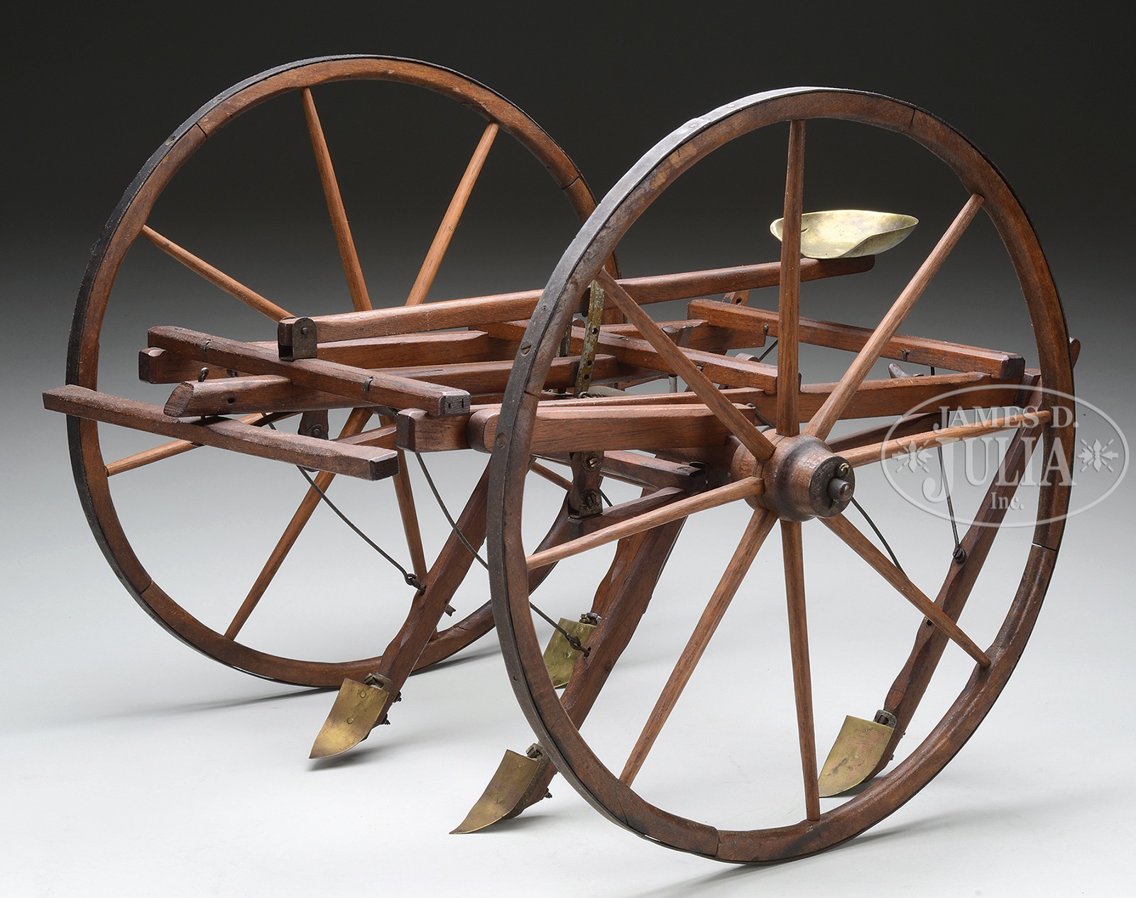 SALESMAN SAMPLE ONE ROW CULTIVATOR.Terrific wooden agricultural model consisting of two large spoke wagon wheels with metal iron rims supporting an arrangement of brass tipped plow blades. The rider would sit above in the formed brass saddle seat, directing the horses or oxen pulling the unit. A series of foot levers would adjust the path of the center plow blades and raise and lower all of them. Crossbar is affixed with two nickel plated plaques reading “J.J. Reed, maker, Polo, Ill.” and “Patented Nov 13, 1866”. SIZE: 17” w x 14” h. CONDITION: Overall very good plus to near excellent clean example, appearing to be all original with the exception of a couple cotter pins. 30477-10 (1,750-2,250) – Lot 2229 Auction: Advertising, Toy & Doll - Spring 2015 Please Note: All prices include the hammer price plus the buyer’s premium, which is paid by the buyer as part of the purchase price. The prices noted here after the auction are considered unofficial and do not become official until after the 46th day. |