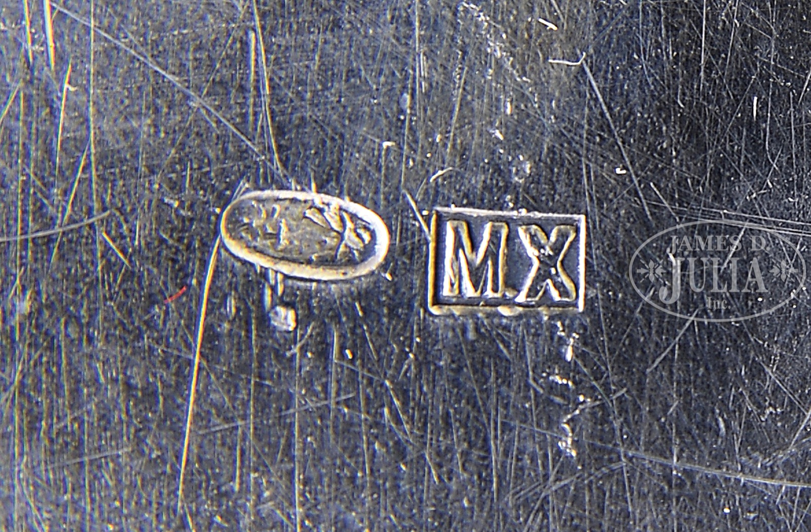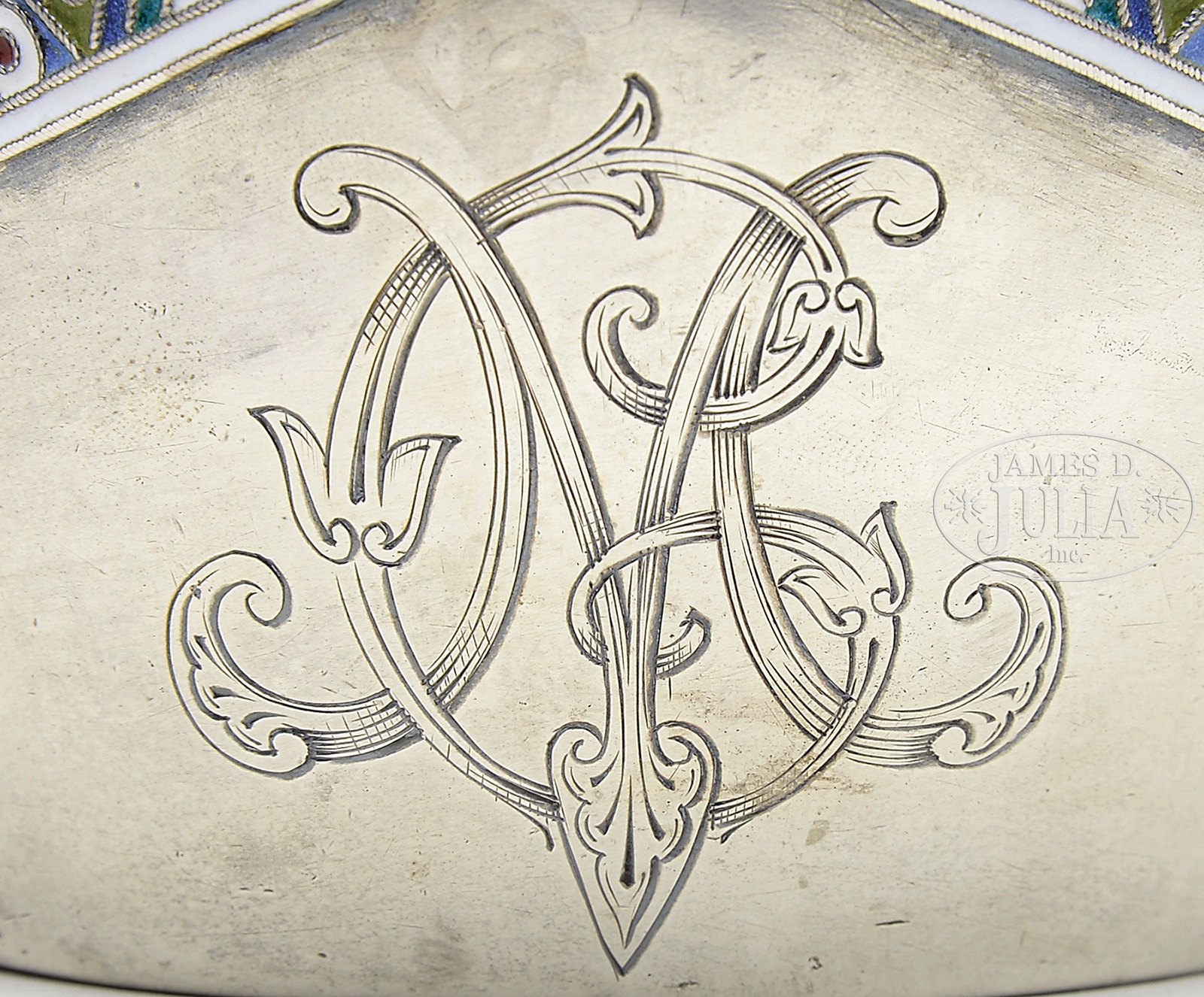 RUSSIAN SILVER & ENAMEL KOVSH.The kovsh marked with a Kokoshnik mark (84 with head facing left) from 1896-1908, Moscow or St. Petersburg region. The assayer mark is blurred and cannot be determined. The maker’s touchmark “M.X” within a square and is unidentified. The standard “84” represents 875/1000 parts silver. This interesting kovsh having a stylized bird form handle with rust and turquoise colored enameling reminiscent of Northwest American Indian motifs. The bowl having a 3/4″ band of blue, green, rust, gold & white enameling in a colorful geometric design. At the mid-point of this band is an absence of this enameling and instead decorated with four colorful inset stone beads in colors of green, amethyst, & amber. At the front of the bowl is a conjoined monogram “CM”. SIZE: 9-1/4″ l x 4-3/4″ at widest. PROVENANCE: Oral history indicates the CM monogram is for Charles Murphy who was an Irish politician and was given this by the Russian Government. CONDITION: Very good with only minor dents & pitting. The rim made up of two separate silver strips, one side missing 6″ section on interior. 49722-1 (1,500-3,000) – Lot 2229