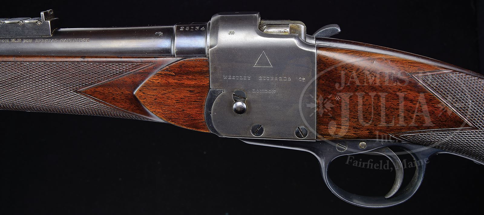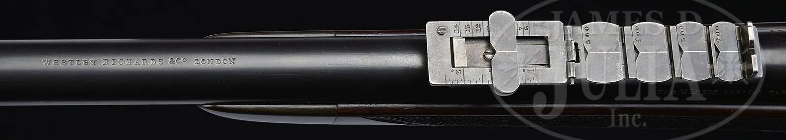 WESTLEY RICHARDS MODEL 1881 PATENT SIDE LEVER FALLING BLOCK RIFLE WITH DETACHABLE BARREL.SN 25134. Cal. .303 British. 27-1/2″ Tapered round bbl is marked “WESTLEY RICHARDS & CO LONDON” on top. Right rear is marked “PATENT DETACHABLE BARREL 91”. Left rear is marked “FOR W. R 303 SPECIAL CARTRIDGE”. Bbl boss is stamped with SN, and triangle with point toward action denoting a detachable bbl. Bottom of bbl is stamped with Birmingham nitro proofs, SN, and assembly no. “262”, which is also on breech face of action. Bbl is fitted with island base with integral one standing, four folding leaf express sight with folding ladder sight for ranges out to 1400 yards. Oval island front base holds silver bead. Blued 1881 action is marked “WESTLEY RICHARDS & CO” and “LONDON” on left, and with detachable bbl info on right. Sliding safety is on right side above trigger. Relatively plain, but dense, European walnut steel capped pistol grip buttstock measures 14-1/4″ over steel buttplate with trap. Standard point pattern checkering is at grip. Vacant silver oval as well as a sling eye, a bit smaller in diameter than that attached to bottom of bbl, is on toe line. Matching forend with horn tip is fitted with early type heavy takedown iron, and Deeley release. Drop at heel: approx 2-3/8″, drop at comb: approx 1-15/16″. Weight: 7 lbs 1 oz. LOP: 14-1/4″ . PROVENANCE: Richard Schreiber Collection. Consignors notes and photographs of this rifle. CONDITION: Excellent, as refinished. Bbl and action retain nearly all of a sympathetic rust re-blue, with side lever and trigger group correctly bright blued. Stocks retain nearly all of a hand rubbed oil finish with some light marks, checkering cleaned up. Relined bore is exceptionally fine with sharp rifling throughout. There are three deep marks in chamber (should clean up with a twist of a reamer). Action is smooth. These side lever Westley Richards rifles are relatively scarce. 49311-1 MGM246 (2,000-3,000) – Lot 2230 Click here to view provenance