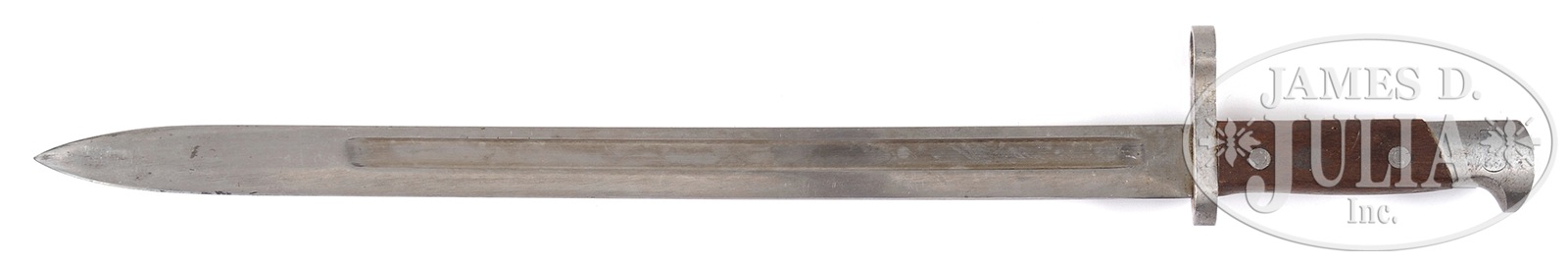EXCEPTIONALLY FINE WINCHESTER MODEL 1905 BAYONET.“Winchester Repeating Arms Co.” commercially marked pattern 1905 bayonet. 16″ blade with deep blood grooves and 20-1/2″ overall. 2-pc walnut grip scales with traditional Krag-type locking device. PROVENANCE: The Jon Roark Collection. CONDITION: Exceptionally fine overall retaining most all of its armory bright polish. Very light spotting on protected areas and has not been reground or sharpened. Grip handles are excellent with no cleaning or distress. A superb example of a very difficult U.S. bayonet. 50387-24 TDW (500-700) – Lot 2230