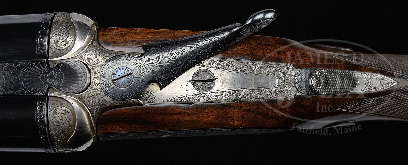 *W. J. JEFFERY MODEL 1 SIDELOCK EJECTOR DANGEROUS GAME DOUBLE RIFLE WITH CASE.SN 28871. Cal. 450-400 3-1/4 Made in 1927, this fine top quality rifle has 24″ chopper lump bbls fitted with quarter rib holding one standing, two folding leaf express rear sight with platinum lines marked for 100, 200, and 300 yards. Quarter rib transitions to sunken mid rib which transitions to stippled front ramp holding silver bead with flip-up porcelain night bead. Tops of bbls are engraved “W. J. Jeffery & Co. Ltd” and “9. Golden Square. Regent Street. London. W. 1.” Bbl flats are stamped with London nitro proofs for 60 grains cordite, 400 grain bullet, and unusual 3-1/4″ case. Bottoms of bbls are stamped with SNs, and actual makers (probably Leonard) production no. 2686 is on bottom rib. Case hardened action fitted with pinless sidelocks, is stocked to the fences, and features non-automatic safety (SAFE inlaid in gold), large dolls head with sliding bite third fastener, bushed strikers, and dbl triggers. Action is engraved with near full coverage nicely cut, large, open, shaded scroll with smaller scroll borders. Fences are nicely carved in serpentine form, and action beads are well filed and unengraved. “W. J. JEFFERY & Co Ltd” is on each lockplate. Blued top lever, forend iron, and trigger guard are also scroll engraved. SN is on trigger guard tang which extends to steel grip cap with trap. Top of trap is engraved in shell motif. Well marbled and lightly fiddle figured European walnut capped pistol grip buttstock measures 14-1/4″ over Silver pad, and features standard drop points and point pattern checkering at grip, with sling loop on toe line, matching that on bottom of bbl, which also has inlet silver oval engraved with “W”. Matching splinter Southgate ejector forend has Anson release. Drop at heel: approx 2-3/8″, drop at comb: approx 1-3/4″. Weight: 10 lbs 7 oz. LOP: 14-1/4″. High quality leather case with brass corners, is embossed “W. B. W” on top. Case is lined in dark burgundy cloth and has gold embossed red Jeffery label in lid. Case contains 2-pc Parker Hale rifle cleaning rod with mop, brush, and jag, pair of snap caps, Jeffery marked square oil bottle, and two horn handled turnscrews. Also included is a high quality leather carrying sling and two red and yellow boxes of Kynoch 450-400 3-1/4 cartridges. PROVENANCE: Wm West Estate Collection. CONDITION: Excellent, as refurbished, most likely by factory. Bbls retain essentially all of a London quality re-black. Action retains traces of case hardening color where protected. Renewed blue of other parts shows a hint of silvering. Stocks show some light marks under new finish, with a few scattered subsequent marks. Checkering competently re-cut. Bores are extremely fine, sharp, strong rifling throughout. Action is tight. Bbls are on face. Ejectors are slightly out of time. New case leather is excellent with a few scuffs. Straps and handle are very fine. Interior cloth has some light rubs and marks. Accessories are excellent, near new. A wonderfully balanced top quality rifle in a caliber renowned for its versatility. 49479-1 MGM279 (30,000-50,000) – Lot 2231 Click here to view provenance