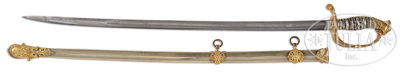 HIGH GRADE PRESENTATION QUALITY CIVIL WAR STAFF OFFICER’S SWORD WITH SILVER GRIP AND RAISED RELIEF PATRIOTIC MOUNTINGS.This sword was made by Emerson & Silver of Trenton, NJ, bearing their “Keystone” mark 31-3/4″ white etched blade retains much of its luster with intricate etched decoration, unusual spiral cut silver grip has alternating decorated and smooth rings. Hilt has American eagle on shield below stars with panoply of flags. Throat and top mount are embellished with “US” in wreath over American eagle over patriotic shield. PROVENANCE: Ex-Richard Johnson Collection; Pictured on pg 319 of “Civil War Army Swords” by John H. Thillmann. CONDITION: Very fine overall. Brass mounts, hilt and pommel retain 70-80% orig gold with balance brass/copper patina. German silver scabbard body is equally fine with old polish. Blade also very fine. 50626-1 JS (3,000-5,000) – Lot 2231