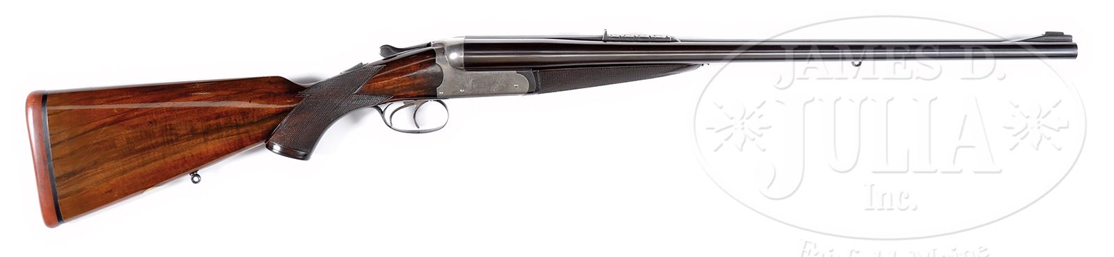 *EARLY W. J. JEFFERY BOXLOCK EJECTOR .500 NITRO DOUBLE RIFLE.SN 16497. Cal. .500 NE 24” Chopper lump bbls with dolls head rib extension are fitted with matted quarter rib holding one standing, four folding leaf express rear sight, marked for 100, 200, 300, and 500 yards. Sunken mid-rib is also fully matted, and matted front base holds silver bead. Tops of bbls are engraved “W. J. Jeffery & Co. Ltd” and “13 King Street, St. James St. London.” Bbl flats are stamped with Birmingham nitro proofs for 80 grains cordite and 570 grain bullet. Bottoms of bbls are stamped with Krupp steel info, and bottom of right bbl with SN. Large sling eye is screwed through bottom rib. Robust, case hardened, boxlock action with arched cutout at back features non-automatic safety (SAFE inlaid in gold), bushed strikers, and dbl triggers. Action is engraved with vignettes of complacent buffalo on each side. Top lever, floorplate, trigger plate, and trigger guard are blued. SN is on trigger guard tang, which extends to horn grip cap. Lightly streaked and fiddle figured, dense European walnut capped pistol grip buttstock measures 15-1/8” over Silver type pad over 11/16” nicely matched wood extension. Point pattern checkering with mullered borders is at grip. A sling eye matching that on bbl as well as a vacant silver oval, are on toe line. Short splinter forend fitted with Baker ejector, has Anson release. Drop at heel: approx. 2-1/2“, drop at comb: approx. 1-7/8 “. Weight: 11 lbs 14 oz. LOP: 15-1/8”. Accompanied by and unopened 10 pack of two yellow and red boxes of .500 NE non-mercuric soft nose cartridges. PROVENANCE: Wm West Estate Collection. CONDITION: Fine, as refurbished. Bbls retain nearly all of a London quality re-black with excellent polishing, and engraving re-cut. Action retains traces of orig case hardening color, but is essentially pewter gray, engraving clear. Blue of other parts has been renewed over some light pitting. Screw slots show some use. Stocks retain most of a glossy refinish over numerous marks, and a few subsequent scratches and chips, checkering re-cut. Pad is relatively new. Bores are exceptionally fine for an early cordite rifle, with only a hint of frosting in grooves. Rifling is strong and sharp throughout with little evidence of cordite burn at throats. Action is tight. Bbls are on face. Ejectors are strong and in time. Like most all doubles by Jeffery, despite the near 12 pound weight of this rifle, it handles and points exceptionally well. It would make a great working rifle, ideal for the largest species of game in the world. 49479-5 MGM220 (20,000-30,000) – Lot 2232