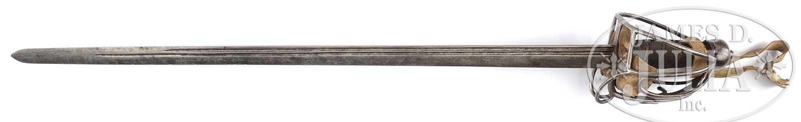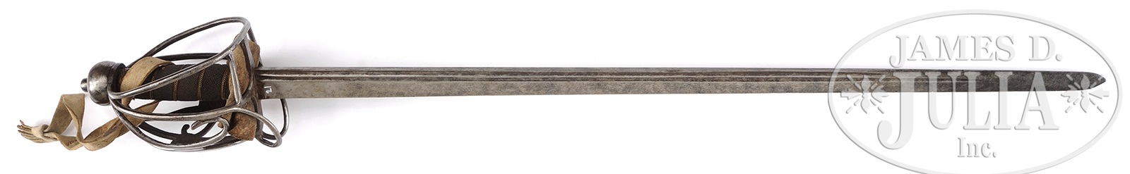VERY FINE 18TH CENTURY BRITISH BASKET HILT SWORD.This is a very fine “as found” two fullered basket hilt retaining chamois lining and a chamois sword knot. Circa 1750 cavalry back sword is not especially rare but is in exceptional condition, still retaining its original sharkskin grip and wire with a bright blade. This sword is similar to Scottish and British patterns seen in the various reference books on Revolutionary War era British swords. CONDITION: Fine overall. 31-1/2″ blade is unmarked, grey/bright overall with staining and light pitting. Hilt has iron patina and surface, cleaned with old, thin varnish layer also found on blade, dark iron patina internally. Sharkskin is dry with several chips, but almost totally intact with braided brass wire wrap. 50971-4 JS (3,000-5,000) – Lot 2233