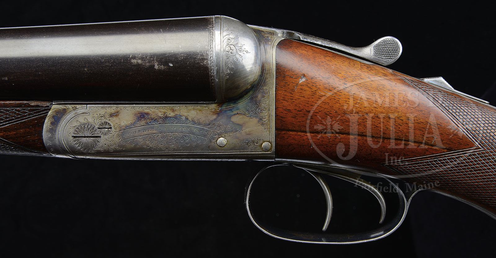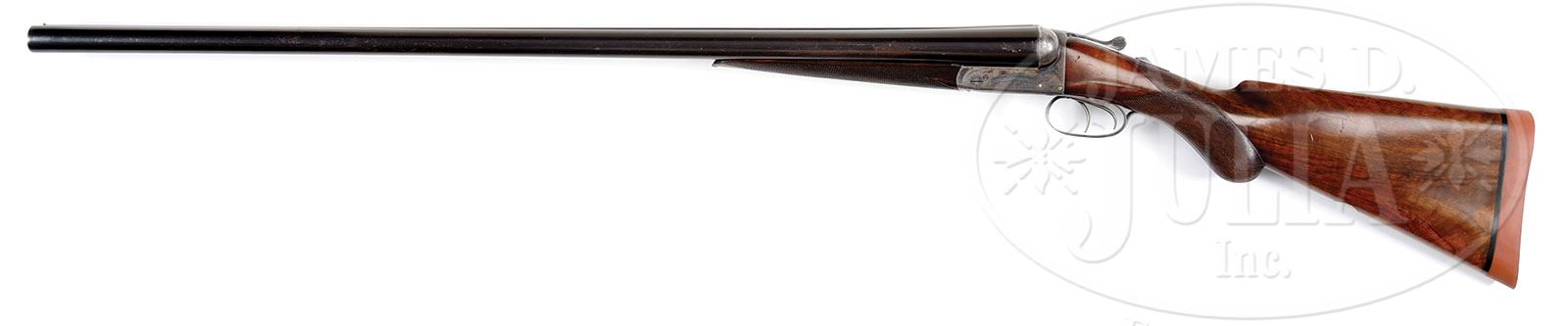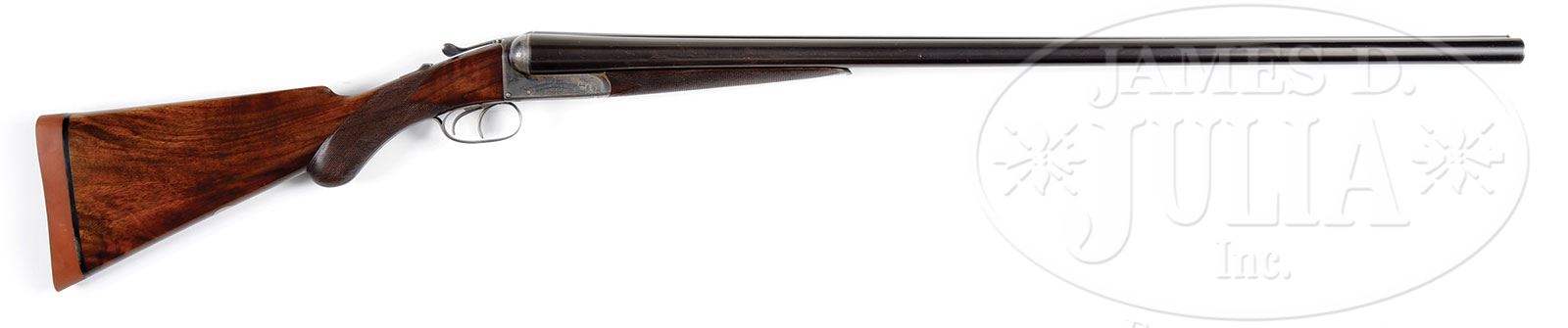 COGSWELL & HARRISON “DESIDERATUM” BOXLOCK WATERFOWLER.SN 20893. (1891) Cal. 10 ga. 3-1/4″ Chambers. 32″ Dovetailed steel bbls are engraved “Cogswell & Harrison THE DESIDERATUM. 142 New Bond St. & 296 Strand. London.” on broad, concave rib. Bbl flats are stamped with London black powder proofs and “CHOKE”. Provisional proofs and SNs are on bottoms of bbls. Case hardened boxlock action features automatic safety (SAFE engraved), dolls head third fastener with pivoting bolt, and double triggers. Action is engraved with 30% coverage sprigs of scroll and line borders. “COGSWELL & HARRISON” is in arched riband on each side. Blued top lever, floorplate, and trigger guard are scroll engraved. SN is at grip. Lightly streaked and slightly figured, dense, European walnut round knob pistol grip buttstock measures 14-1/8″ over Silver type pad. Flat top point pattern checkering with mullered borders is at grip. A vacant German silver oval is on toe line. Matching splinter forend with inset horn tip has spring tension release. Bore diameter: left-.805, right -.804. Bore restrictions: left -.033 (IMod), right -.019 (Lt. Mod). Minimum wall thickness: left -.030, right -.028. Drop at heel: 2-11/16″, drop at comb: 1-11/16″. Weight: 8 lbs. 8 oz. LOP: 14-1/8″. PROVENANCE: Certificate of origin from Cogswell & Harrison confirming configuration and stating the orig purchaser was Mr. Percy Russell on 24 March 1890. Price was 28 guineas. CONDITION: Excellent. Bbls retain approx 90% orig blue, silvered at muzzles, thinning above forend from normal carrying wear, with a number of marks overall. Action retains approx 80% orig case hardening color, vivid where protected. Top lever, floorplate, and trigger guard retain most of their orig charcoal blue. Stocks retain most of their orig rubbed oil finish, but the buttstock has added finish blended in after recoil pad was replaced. Checkering is slightly worn. Bores are excellent. There is a slight bulge at top of left bbl behind choke. Action is tight. Bbls are on face. A fine handling ten bore. Excellent target and NICESHOT hunting loads are available from RST. 4-53562 MGM121 (1,500-2,500) – Lot 2238 Click here to view provenance