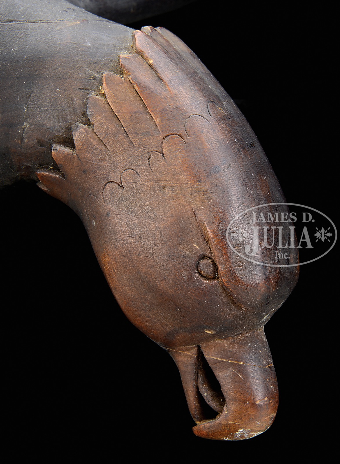 WELL CARVED FOLK ART EAGLE.Early 20th century, possibly American. The fanciful bird carved at the moment of landing with down-turned feathered head, out-swept nicely shaped wings and spread tail. The wing and tail tips carved in a “feathered” appearance. The head with feathered plumage and partially open beak. The talons carved as an integral part of the square wood pedestal. Nice coloration and patina. SIZE: 14″ t x 31-1/2″ w (wing) x 11″ d. CONDITION: With undisturbed surfaces, minor blemish to tip of beak, and with some areas of minor roughness to wing tips, otherwise very good. 51400-6 (1,800-2,000) – Lot 2238