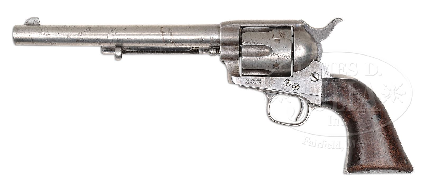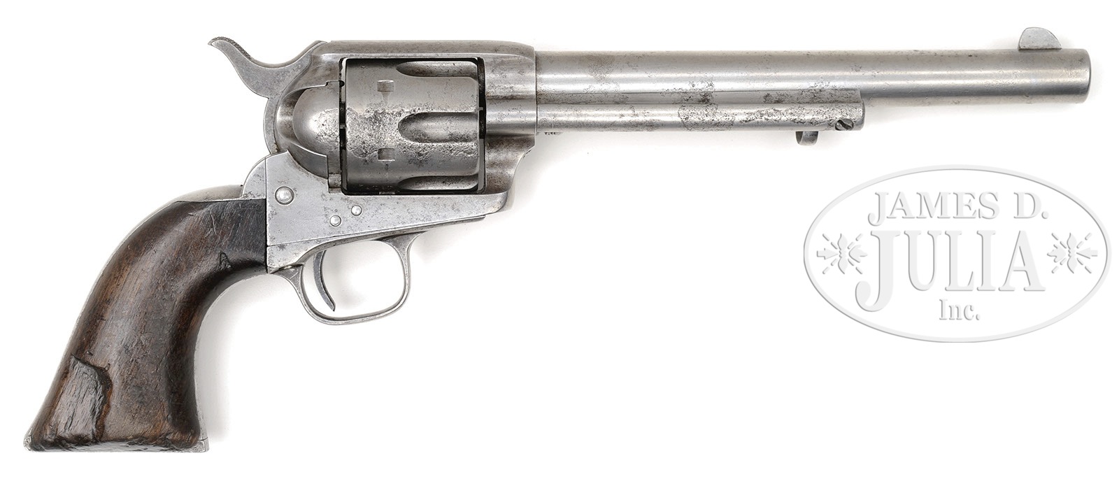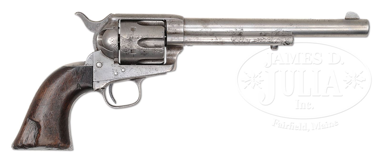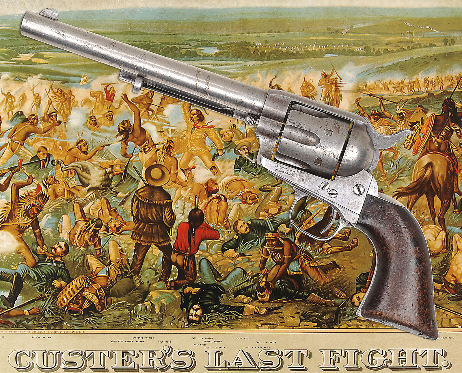 EXTRAORDINARILY RARE CUSTER BATTLEFIELD COLT SINGLE ACTION ARMY REVOLVER IDENTIFIED TO LT. WILLIAM VAN WYCK REILY LATER GIFTED TO CHIEF TWO MOONS (ON U. S. NICKEL).SN 4815. Cal. 45 Colt. Usual configuration with 7-1/2″ bbl, full front sight and 1-line block letter address. Left side of frame has 2-line patent dates and crudely obliterated “US”. Ejector housing is first type with bull’s eye ejector rod head and base pin appears to be orig with dimpled ends and battered head. Mounted with a 1-pc walnut grip that has matching SN in backstrap channel. Right side of grip has a large chip out of the heel with a sharp shoulder indicating a cut, now heavily worn and aged with a wonderful patina. Left side has two 1/4″ round dots, later shown to have been the mark of Cheyenne Indian Chief Two Moons. This revolver was part of the first government contract for Colt revolvers shipped from Springfield Armory on March 25, 1874 as part of a 1,000 lot shipment to Rock Island Arsenal of which 755 were issued to the 7th Cavalry and the rest were issued to the 1st Cavalry. This revolver was inspected by Orville W. Ainsworth whose initial “A” appears on various parts including bbl, trigger guard, cyl & backstrap. The grip is too worn to show the actual inspector’s cartouche or his small stamp on the bottom edge. Accompanied by a 2-page letter from noted author, historian & collector, John Kopec, wherein he authenticates this revolver as being in orig configuration and states that it is distinctly possible that this revolver was issued to Custer’s 7th Cavalry. Lt. William Van Wyck Reily, the son of a deceased Naval officer and a very aggressive, remarried mother, had failed out of the U.S. Naval Academy but through persistence and aggressive correspondence by his mother gained him a Presidential Appointment as a 2nd Lieutenant, assigned to the 10th Cavalry (Buffalo Soldiers). His mother thinking commanding Negro troops was not prestigious enough for her son, again lobbied influential friends and obtained a transfer for him to the 7th Cavalry. Lt. Reily was initially assigned to Company E, 7th Cavalry Regiment at Fort Abraham Lincoln, Dakota Territory, where on April 24, 1876 he was subjected to a kangaroo court of inquiry apparently by his fellow officers who would have sat in judgement, presided over by Lt. James E. Porter for carelessness in allowing his service issued Colt revolver SN 5126 to be stolen. Lt. Reily was required by this inquiry to reimburse the government for the loss and was issued revolver SN 4815 as a replacement. The information about the alleged (kangaroo) hearing is contained in a copy of a letter reportedly found in a metal box by a crew from North Dakota contracted to the government to demolish old dilapidated buildings at the site of Fort Abraham Lincoln. The owners of this letter have declined to release it but did furnish a copy to the consignor. Consignor states that he has seen the original. The form of this letter is in no way official but likely something that never would have been officially condoned. It is however a known fact that troopers after having lost their sidearm would be fined or otherwise penalized for such. In fact at a recent auction, the Julia Auction Company sold an authentic and original 7th Cavalry day book with just such an entry for a trooper who “lost” his revolver. A search of the National Archives of the available 7th Cavalry records for this time frame disclosed no such information which lends credence to the speculation that Lt. Reily, after having been found guilty, would likely have been forced to pay for the drinks for the other officers. On the fateful day of June 25, 1876, Lt. Reily was with Company F, 7th Cavalry with Lt. Col. George A. Custer at the Little Big Horn and was killed in action there. Oral history interviews of several Indian participants and descendants of Indian participants relate the following regarding this revolver: Near the end of the battle when only a few soldiers remained alive, most of the Indians were nearly out of ammunition for their firearms and so attacked with knives & hatchets. Two different authors interviewed a Sioux chief named Runs-the-Enemy of the Two-Kettle Clan. The first was by Dr. Joseph K. Dixon for his book The Vanishing Race published in 1913. A reprint of pp. 170-179 relates the interview with Runs-the-Enemy, a Two-Kettle Sioux, who participated throughout the entire Custer Massacre and later attacked the Reno trenches. Near the end of the interview he relates that he was following an Arapahoe named Waterman who killed a “horse soldier chief” (any officer was referred to as a “chief”) who was pointing a 6-shooter at Waterman. Waterman cut off this soldier’s little finger with a tomahawk. He relates “Horse soldier chief drop 6-shooter pistol. He hold hand and cry. Waterman shoot horse soldier chief with rifle. Waterman take horse soldier chief 6-shooter pistol. Waterman say hair too short to scalp. I scalp.” After that “Runs-the-Enemy” left the Custer Battlefield and went to fight Reno. Another author, named Ivan Starr, wrote the same story in the Lakota language and translated it into English. As follows is a similar story related to the consignor by Melvin Spotted Elk of the Cheyenne tribe in Montana in 1974 which had been passed down through his family. He relates a similar story of the battle as previously related above by “Runs-the-Enemy”. After the Battle of the Rosebud where the Cheyenne and Sioux believed they had whipped the soldiers under Gen. Crook, the Indians moved their camp to the “Little Horn” River (Little Big Horn) where they were surprised by the 7th Cavalry as history records. Prior to the battle the Sioux captured five Arapahoe Indians who the Sioux thought were scouting for the soldiers. This turned out not to be the case and the Arapahoe got their horses and weapons back. During the ensuing Custer fight the Arapahoe fought with the C
