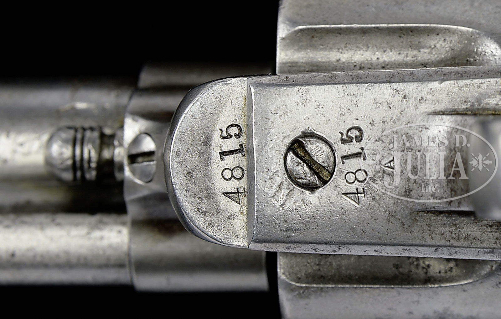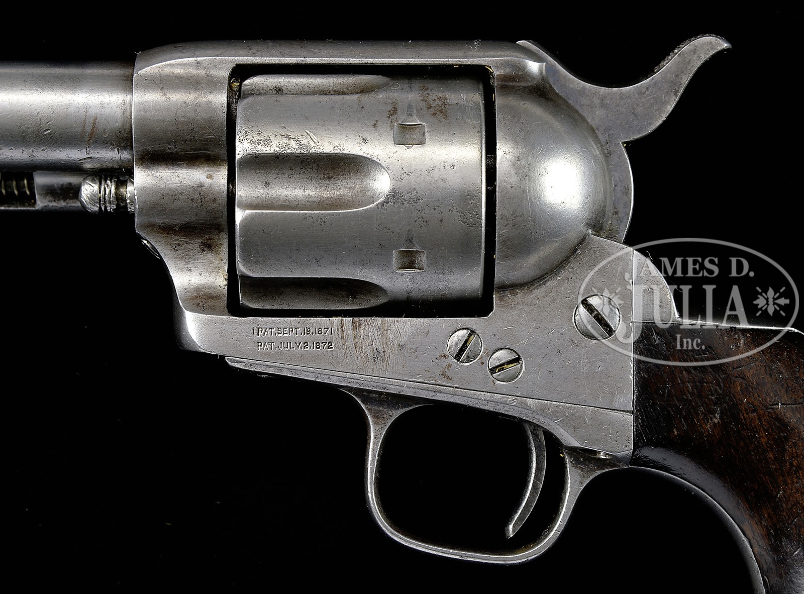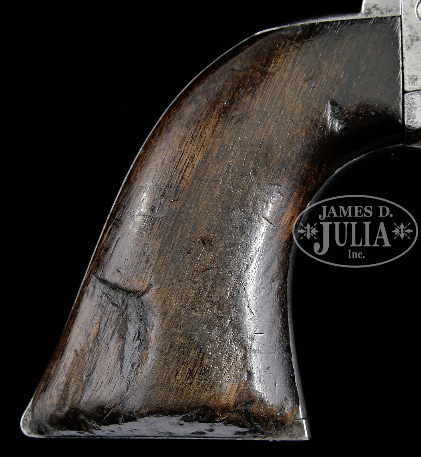 EXTRAORDINARILY RARE CUSTER BATTLEFIELD COLT SINGLE ACTION ARMY REVOLVER IDENTIFIED TO LT. WILLIAM VAN WYCK REILY LATER GIFTED TO CHIEF TWO MOONS (ON U. S. NICKEL).SN 4815. Cal. 45 Colt. Usual configuration with 7-1/2″ bbl, full front sight and 1-line block letter address. Left side of frame has 2-line patent dates and crudely obliterated “US”. Ejector housing is first type with bull’s eye ejector rod head and base pin appears to be orig with dimpled ends and battered head. Mounted with a 1-pc walnut grip that has matching SN in backstrap channel. Right side of grip has a large chip out of the heel with a sharp shoulder indicating a cut, now heavily worn and aged with a wonderful patina. Left side has two 1/4″ round dots, later shown to have been the mark of Cheyenne Indian Chief Two Moons. This revolver was part of the first government contract for Colt revolvers shipped from Springfield Armory on March 25, 1874 as part of a 1,000 lot shipment to Rock Island Arsenal of which 755 were issued to the 7th Cavalry and the rest were issued to the 1st Cavalry. This revolver was inspected by Orville W. Ainsworth whose initial “A” appears on various parts including bbl, trigger guard, cyl & backstrap. The grip is too worn to show the actual inspector’s cartouche or his small stamp on the bottom edge. Accompanied by a 2-page letter from noted author, historian & collector, John Kopec, wherein he authenticates this revolver as being in orig configuration and states that it is distinctly possible that this revolver was issued to Custer’s 7th Cavalry. Lt. William Van Wyck Reily, the son of a deceased Naval officer and a very aggressive, remarried mother, had failed out of the U.S. Naval Academy but through persistence and aggressive correspondence by his mother gained him a Presidential Appointment as a 2nd Lieutenant, assigned to the 10th Cavalry (Buffalo Soldiers). His mother thinking commanding Negro troops was not prestigious enough for her son, again lobbied influential friends and obtained a transfer for him to the 7th Cavalry. Lt. Reily was initially assigned to Company E, 7th Cavalry Regiment at Fort Abraham Lincoln, Dakota Territory, where on April 24, 1876 he was subjected to a kangaroo court of inquiry apparently by his fellow officers who would have sat in judgement, presided over by Lt. James E. Porter for carelessness in allowing his service issued Colt revolver SN 5126 to be stolen. Lt. Reily was required by this inquiry to reimburse the government for the loss and was issued revolver SN 4815 as a replacement. The information about the alleged (kangaroo) hearing is contained in a copy of a letter reportedly found in a metal box by a crew from North Dakota contracted to the government to demolish old dilapidated buildings at the site of Fort Abraham Lincoln. The owners of this letter have declined to release it but did furnish a copy to the consignor. Consignor states that he has seen the original. The form of this letter is in no way official but likely something that never would have been officially condoned. It is however a known fact that troopers after having lost their sidearm would be fined or otherwise penalized for such. In fact at a recent auction, the Julia Auction Company sold an authentic and original 7th Cavalry day book with just such an entry for a trooper who “lost” his revolver. A search of the National Archives of the available 7th Cavalry records for this time frame disclosed no such information which lends credence to the speculation that Lt. Reily, after having been found guilty, would likely have been forced to pay for the drinks for the other officers. On the fateful day of June 25, 1876, Lt. Reily was with Company F, 7th Cavalry with Lt. Col. George A. Custer at the Little Big Horn and was killed in action there. Oral history interviews of several Indian participants and descendants of Indian participants relate the following regarding this revolver: Near the end of the battle when only a few soldiers remained alive, most of the Indians were nearly out of ammunition for their firearms and so attacked with knives & hatchets. Two different authors interviewed a Sioux chief named Runs-the-Enemy of the Two-Kettle Clan. The first was by Dr. Joseph K. Dixon for his book The Vanishing Race published in 1913. A reprint of pp. 170-179 relates the interview with Runs-the-Enemy, a Two-Kettle Sioux, who participated throughout the entire Custer Massacre and later attacked the Reno trenches. Near the end of the interview he relates that he was following an Arapahoe named Waterman who killed a “horse soldier chief” (any officer was referred to as a “chief”) who was pointing a 6-shooter at Waterman. Waterman cut off this soldier’s little finger with a tomahawk. He relates “Horse soldier chief drop 6-shooter pistol. He hold hand and cry. Waterman shoot horse soldier chief with rifle. Waterman take horse soldier chief 6-shooter pistol. Waterman say hair too short to scalp. I scalp.” After that “Runs-the-Enemy” left the Custer Battlefield and went to fight Reno. Another author, named Ivan Starr, wrote the same story in the Lakota language and translated it into English. As follows is a similar story related to the consignor by Melvin Spotted Elk of the Cheyenne tribe in Montana in 1974 which had been passed down through his family. He relates a similar story of the battle as previously related above by “Runs-the-Enemy”. After the Battle of the Rosebud where the Cheyenne and Sioux believed they had whipped the soldiers under Gen. Crook, the Indians moved their camp to the “Little Horn” River (Little Big Horn) where they were surprised by the 7th Cavalry as history records. Prior to the battle the Sioux captured five Arapahoe Indians who the Sioux thought were scouting for the soldiers. This turned out not to be the case and the Arapahoe got their horses and weapons back. During the ensuing Custer fight the Arapahoe fought with the C