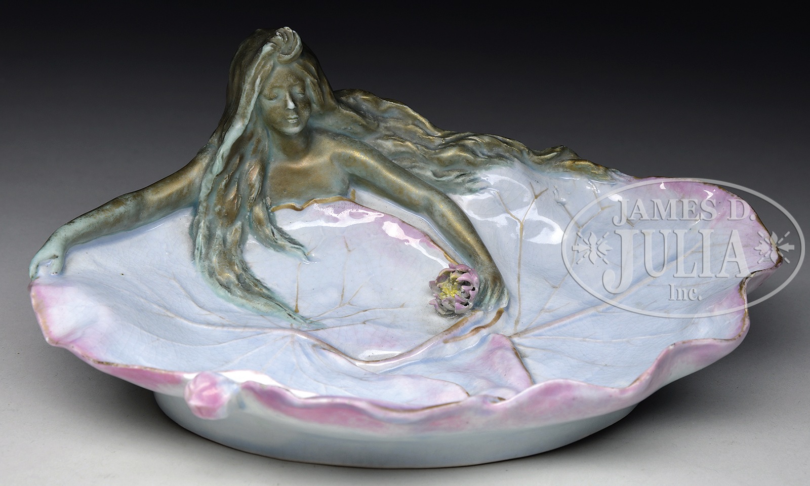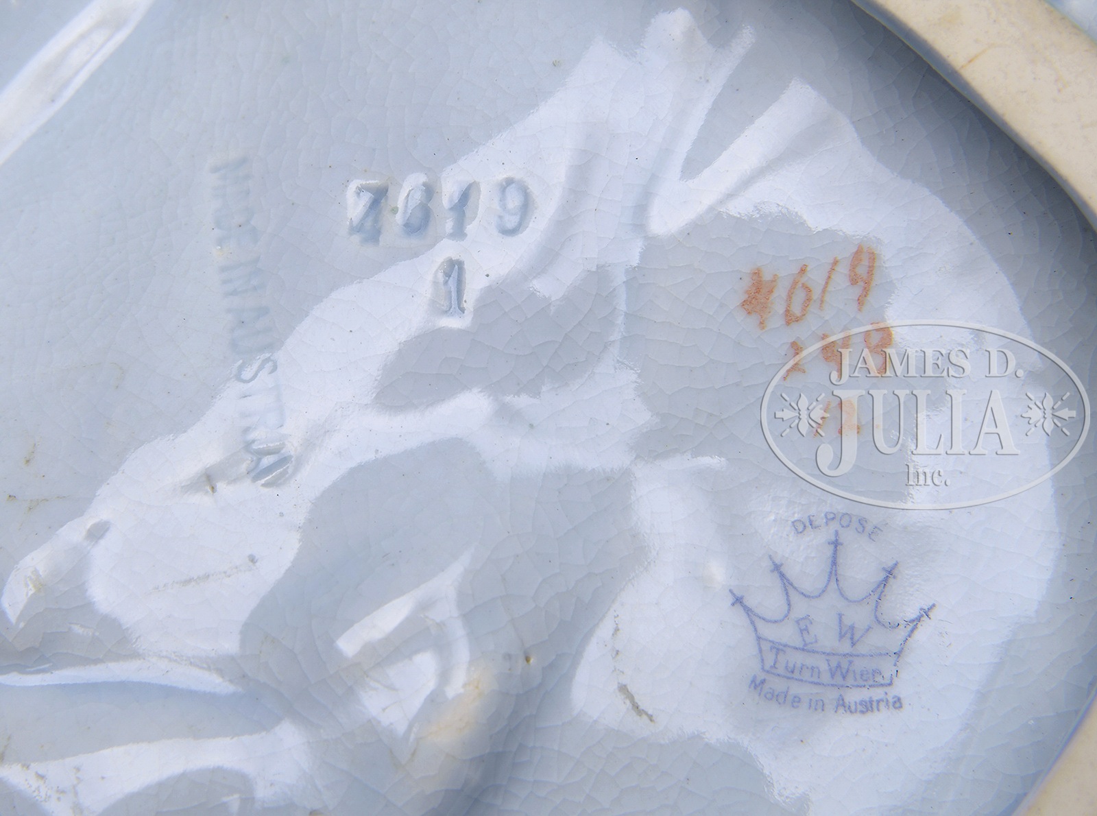 AMPHORA POTTERY TRAY.Classic Art Nouveau Amphora tray has the bust of a lovely maiden with long flowing hair and outstretched arms bordering one side of the tray. She is holding a molded pink and yellow flower in one hand. Body of the tray is made up of overlapping leaf design with white and pink glaze, while the maiden has a gilded finish. Signed on the underside “E.W. Turn Wien” within a crown “Made in Austria Depose”. Also impressed in the bottom “Made in Austria 4619 1”. SIZE: 8″ w. CONDITION: Very good to excellent with some minor wear to gilding. 5-69104 (500-700) – Lot 2240