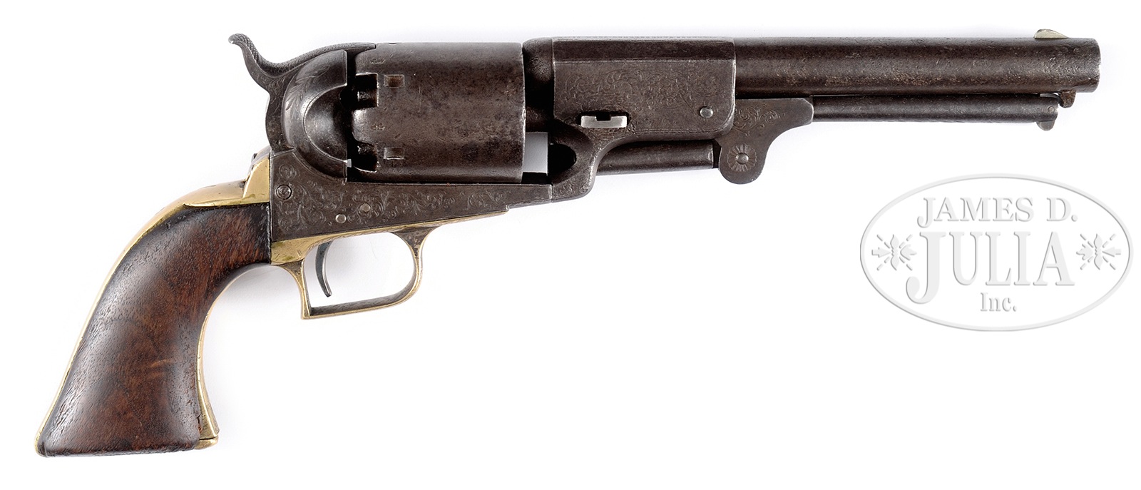 FACTORY ENGRAVED COLT 2ND MODEL HARTFORD/LONDON DRAGOON REVOLVER.SN 158. Cal. 44. 7-1/2″ bbl. Blue and case color finish. Silver plated brass trigger guard and backstrap. Revolver is engraved in the English style on frame, bbl lug, loading lever, hammer, and trigger guard. Backstrap is a replacement and bears the no. 7176. SN’s match on frame, bbl, wedge, arbor, trigger guard, and cyl. British proofs are present on bbl lug and cyl. PROVENANCE: Collection of Daniel C. Scott. CONDITION: Good to very good. Revolver shows an even gray-brown patina overall with some roughness towards muzzle. Bbl address is clear. Engraving is sharp on frame, with a clear Colts Patent engraved in a riband on left side. Bbl engraving is slightly washed out but visible. Trigger guard engraving is sharp. Trigger guard and backstrap show remnants of the silver plated finish. Grip is undersized and probably from another revolver. Chips are missing at the toe on both sides. SN is visible on the cyl. No cyl scene remains. A good example of an early Colt 2nd model Hartford/London dragoon revolver. 50709-17 TEP (4,000-8,000) – Lot 2240