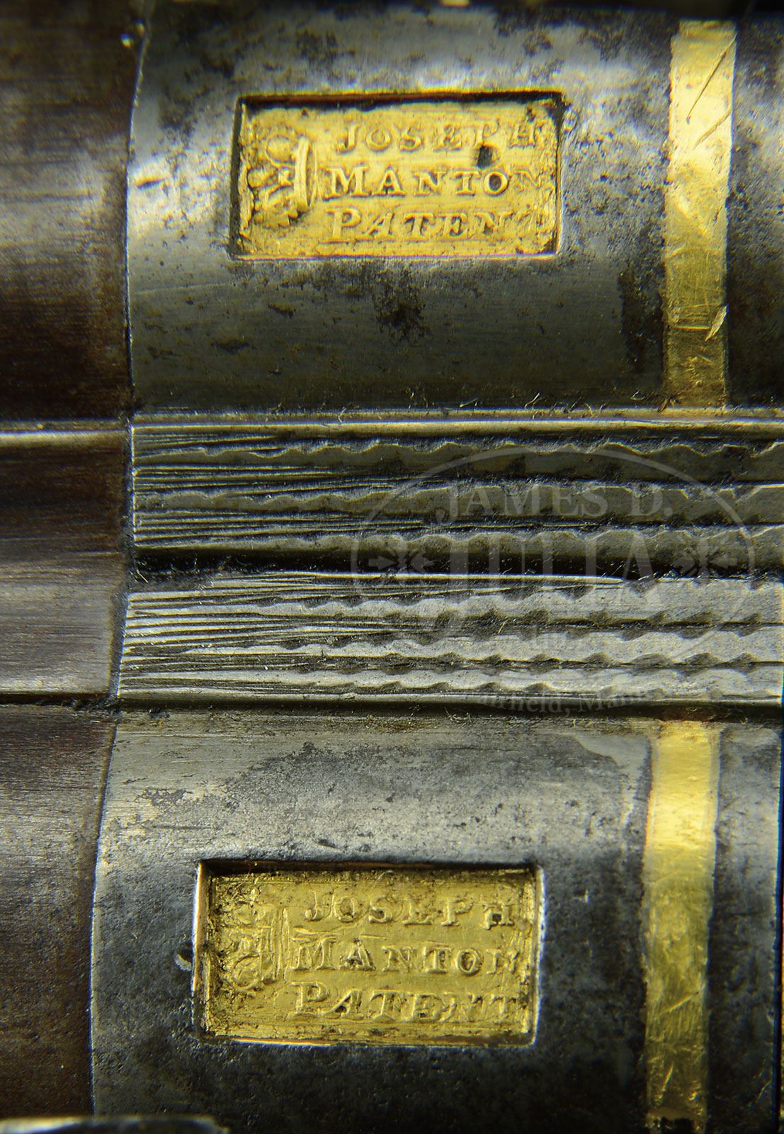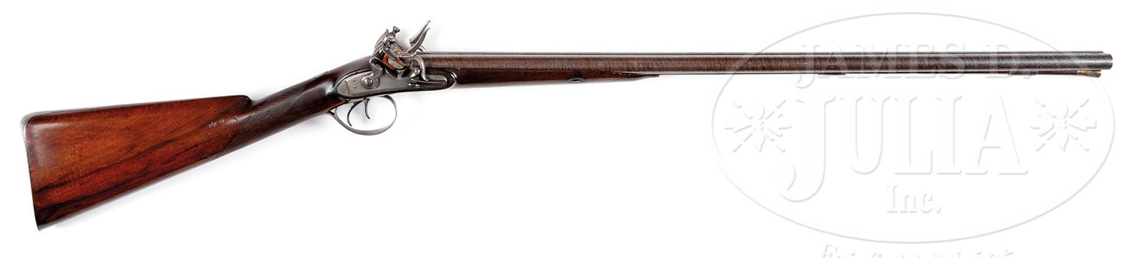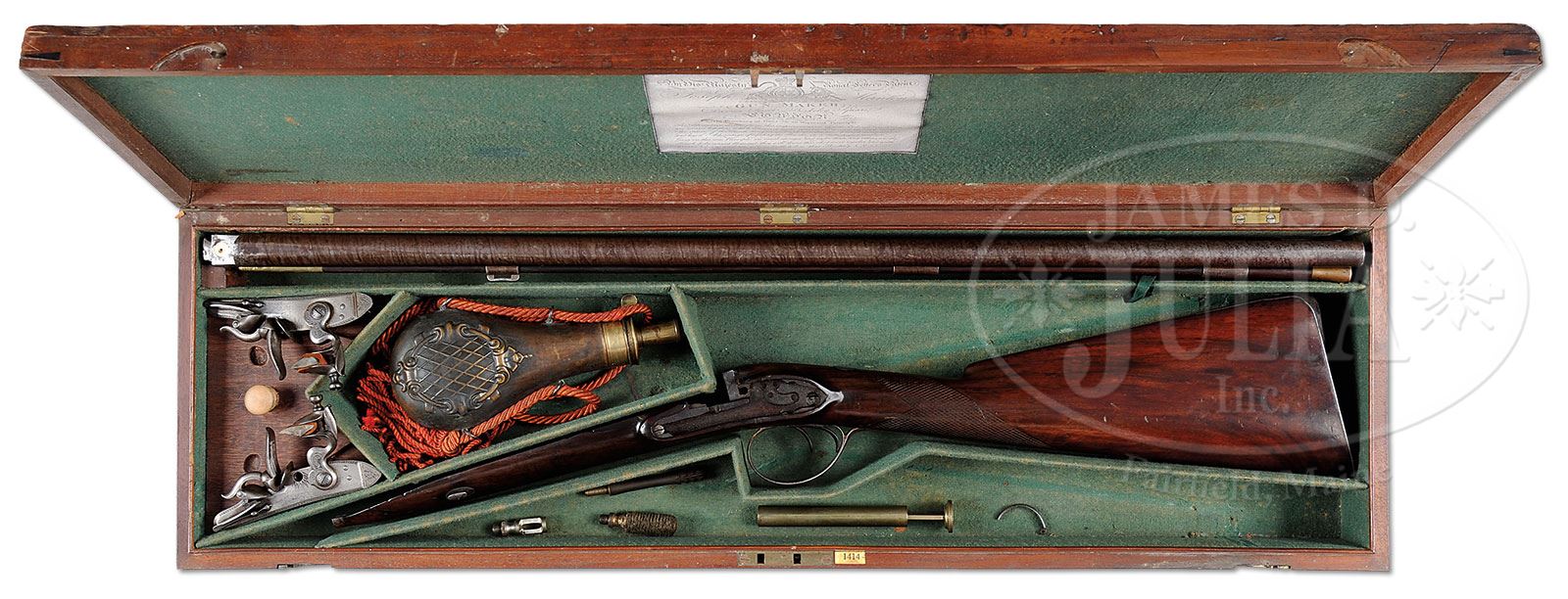 JOSEPH MANTON DOUBLE FLINTLOCK FOWLING GUN WITH CASE.SN 1414. (ca 1800) Cal. 20 ga. .695 Bore diameter. 30″ Stub twist bbls with unmarked sunken rib, have early London gunmakers proofs on bottoms. Inset patent breeches have gold poincons and bands on tops, SNs on bottoms. Touch holes are gold lined. Breech iron has sunburst and stand-of-arms engraving. Locks with waterproof pans, bridled roller frizzens with lip, and large frizzen springs with bulbous tips, have beveled lockplates with rebated tails and are fitted with serpentine double breasted cocks of the style used with Manton’s gravitating stops, which do not appear to have ever been fitted to this gun. Lockplate bevels are feather engraved, and tails have small stands-of-arms engraving. “Joseph Manton London” is under pans. Faces of cocks have scroll engraving. Trigger plate has stylized pineapple finial. Trigger guard bow is engraved with stand-of-arms and flowers. Lightly streaked, dense, European walnut stock measures 14-3/8″ over steel buttplate with long top tang. Coarse point pattern checkering is at grip. Stock fastens to bbl with side nail through oval silver escutcheons. Greenheart ramrod with brass tip and worm under brass tail is in three plain pipes. Tailpipe is in stylized pineapple form matching trigger plate. Wall thickness: Left: .055. Right .055. Drop at heel: 2-5/16″. Drop at comb: 1-5/8″. Weight: 6 lbs. 8 oz. LOP: 14-3/8″. Dovetailed mahogany case with inset D ring brass handle and central medallion is engraved with stag’s head on a crown surmounted by riband marked “BYDAND”. Interior is lined in green cloth and has reproduction Manton label in lid, and contains 2-pc brass and walnut cleaning rod, copper bodied powder flask embossed with scrolled medallion (top marked “Patent”), interesting brass measure with sliding adjustable plug, marked on one side for drams of powder, and the other for ounces of shot, and some cleaning implements. Locks are housed in a lift out mahogany tray. PROVENANCE: Listed and described on p. 219 of THE MANTON SUPPLEMENT by Keith Neal and Back. Guy A. Ritter Collection. CONDITION: Good. Bbls retain nearly all of an old re-brown with excellent definition to pattern. Breech iron and locks are cleaned to silver. Trigger guard and trigger plate are also cleaned but have toned back. Engraving is slightly worn. Stocks retain most of an old oil refinish with a number of subsequent marks, considerably worn checkering lightly re-cut. There are a number of repairs around locks, mostly at fronts in front of frizzens. Forend tip has cracked away and been repaired. Bores are good with some light pits. Locks and frizzens are crisp. It appears that frizzens and cocks were replaced by Manton during period of use. Exterior of case has a number of marks, scuffs, and dents in its orig finish. Interior cloth is good with spots of discoloration. Partitions have been reconfigured. Lock tray is new. Flask is good. Powder measure is very fine. This fairly solid double flint would undoubtedly make a good shooter. It is listed by number in the Manton Supplement by Keith Neal and Black on p. 219. 4-51581 MGM189 (7,000-10,000) – Lot 2242 Click here to view provenance