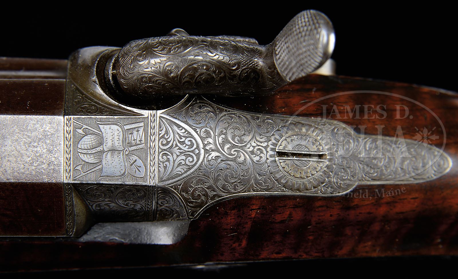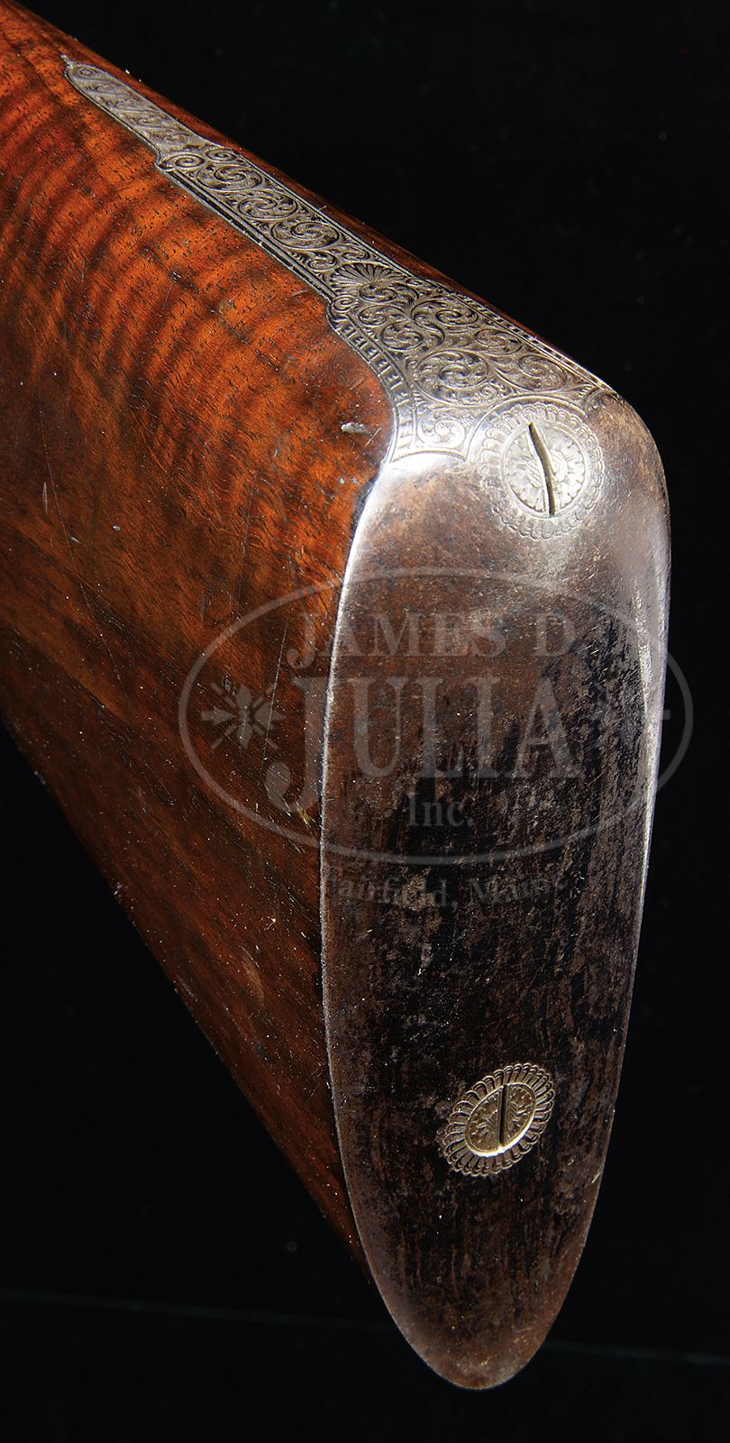 EXCEPTIONAL PERCUSSION MILITARY STYLE SPORTING RIFLE/ MUSKET BY GEORGE GIBBS, MOST LIKELY HIS MASTERPIECE UPON COMPLETING HIS APPRENTICESHIP.SN NSN. Cal. .50 (.575 x .583 Smooth oval bore (?)) This unusual, high quality, exceptionally well made, firearm is devoid of any proof marks, numbers, lettering, or inscriptions, except for the name “GEORGE GIBBS” on lockplate. The only conclusion one could make is that it was for show only, for without proofing it was never legally salable or shootable. It remains in exceptional, most likely unfired, condition. Finely browned 33″ ovate skelp twist bbl has integral rounded portion at rear holding unusual flip-over ladder type rear sight (origin of design unknown). Barleycorn front sight is dovetailed through integral square boss at muzzle. Patent breech features plain platinum blow-out and is engraved with well cut open shaded scroll, and unusual device of shield, halberds, and open music book, on top. Breech iron with integral scrolled fence, is also finely scroll engraved. Bar lock with flat faced serpentine chamfered hammer is nearly fully engraved with more of this exquisitely cut shaded scroll. “GEORGE GIBBS” is in scroll terminated riband toward front. Trigger plate has plain rounded finial. Steel trigger guard with more large scroll on bow, is unmarked at tang. Steel buttplate has long scroll engraved top tang. Nicely marbled, and beautifully full length fiddle figured European walnut straight grip stock has nicely cut deep coarse checkering with mullered borders at grip and forend. Stock extends to within 5″ of muzzle, has horn cap and fastens to bbl with two side nails through engraved oval steel escutcheons. Military style steel ramrod is held by two steel pipes with turned ends and matching thimble with small pointed finial. Military style sling loops are mounted through stock in bbl channel and on toe line, which is also fitted with a vacant silver oval. Drop at heel: approx 2-3/16″, drop at comb: approx 1-3/4″. Weight: 9 lbs 0 oz. LOP: 14-3/8″. CONDITION: Excellent, possibly unfired, showing only numerous storage and handling marks, as well as slight ravages of age on its metal and wood finishes. Bbl retains nearly all of its brown, silvered on sharp edges. Case hardening of lock and other furniture has slightly darkened. Bright blue of trigger guard and buttplate has flaked somewhat, and has some freckling. Stock finish is very fine, with aforementioned nicks and dings, but is dry and untouched. Bore is excellent, bright and shiny throughout. Lock is crisp. 49266-3 MGM81 (7,500-12,500) – Lot 2242